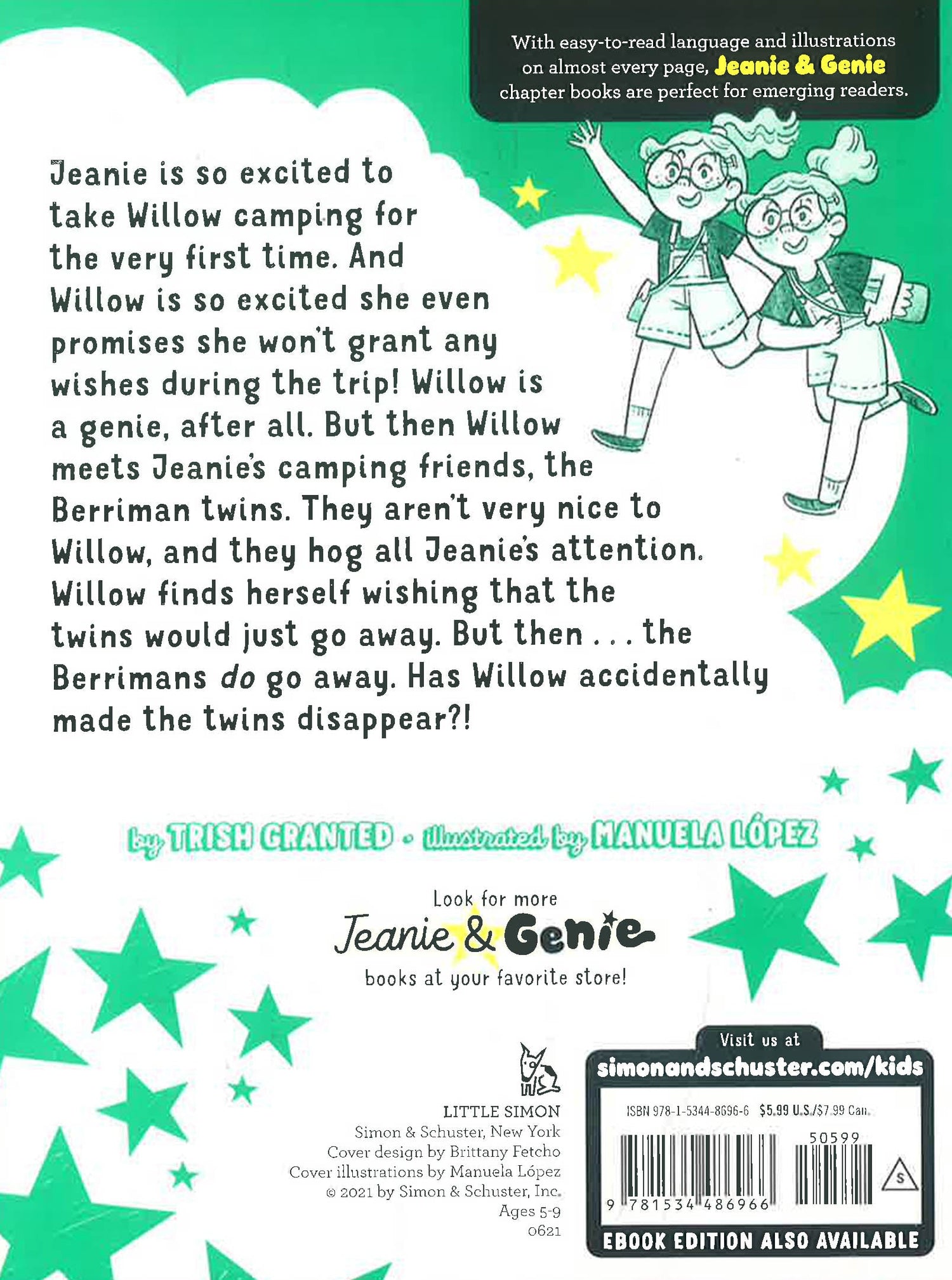 Jeanie is so excited to take her best friend, Willow, camping for the very first time. And Willow’s so excited she even promises Jeanie she won’t grant any wishes during the trip! Willow is a genie, after all. But then Willow meets Jeanie’s camping friends, Becca and Bonnie Berriman. The twins aren’t very nice to Willow, and they hog all Jeanie’s attention, so Willow finds herself wishing that the twins would just go away. But the problem is…the Berrimans do go away. Has Willow accidentally made the twins disappear?!