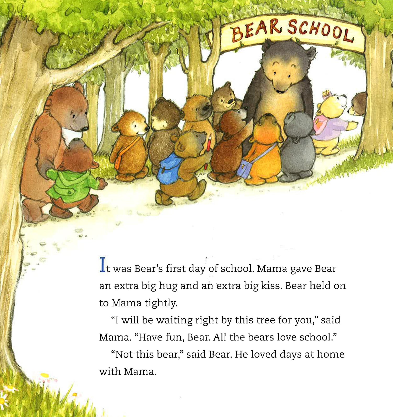 It's Bear's first day of school, and he's a bit reluctant to go. Mama says all bears love school; Bear isn't so sure.
