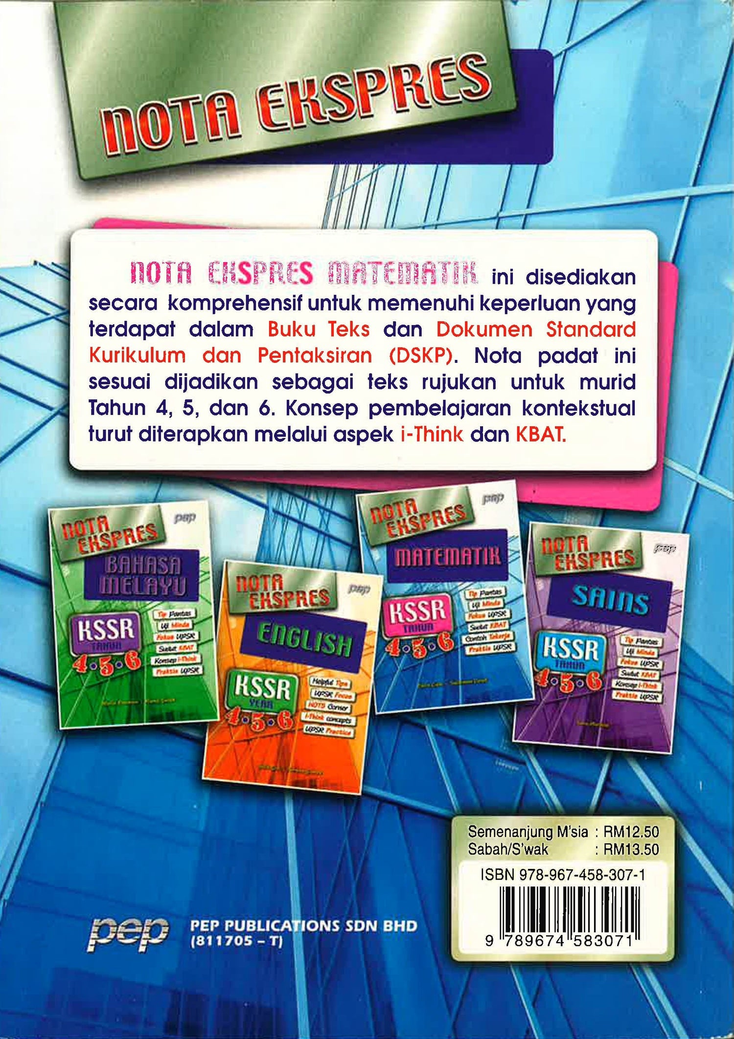NOTA EKSPRES MATEMATIK ini disediakan secara komprehensif untuk memenuhi keperluan yang terdapat dalam Buku Teks dan Dokumen Standard Kurikulum dan Pentaksiran (DSKP). Nota padat ini sesuai dijadikan sebagai teks rujukan untuk murid Tahun 4, 5 dan 6. Konsep pembelajaran kontekstual turut diterapkan melalui aspek i-Think dan KBAT.