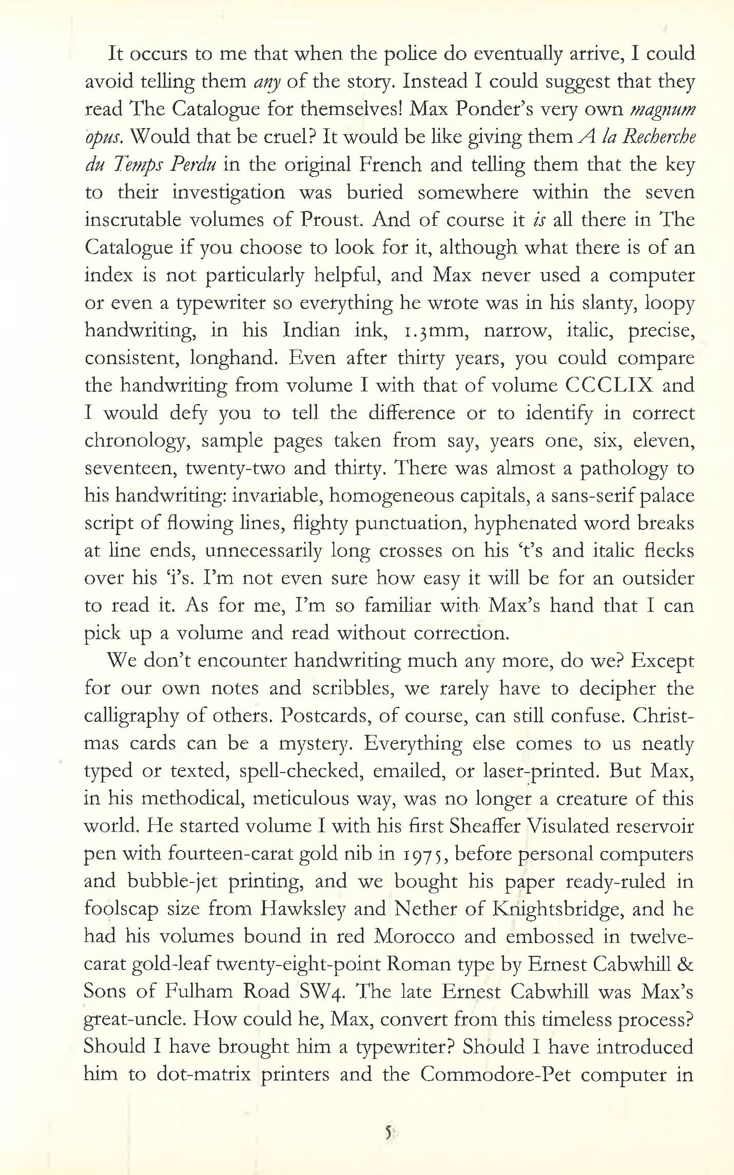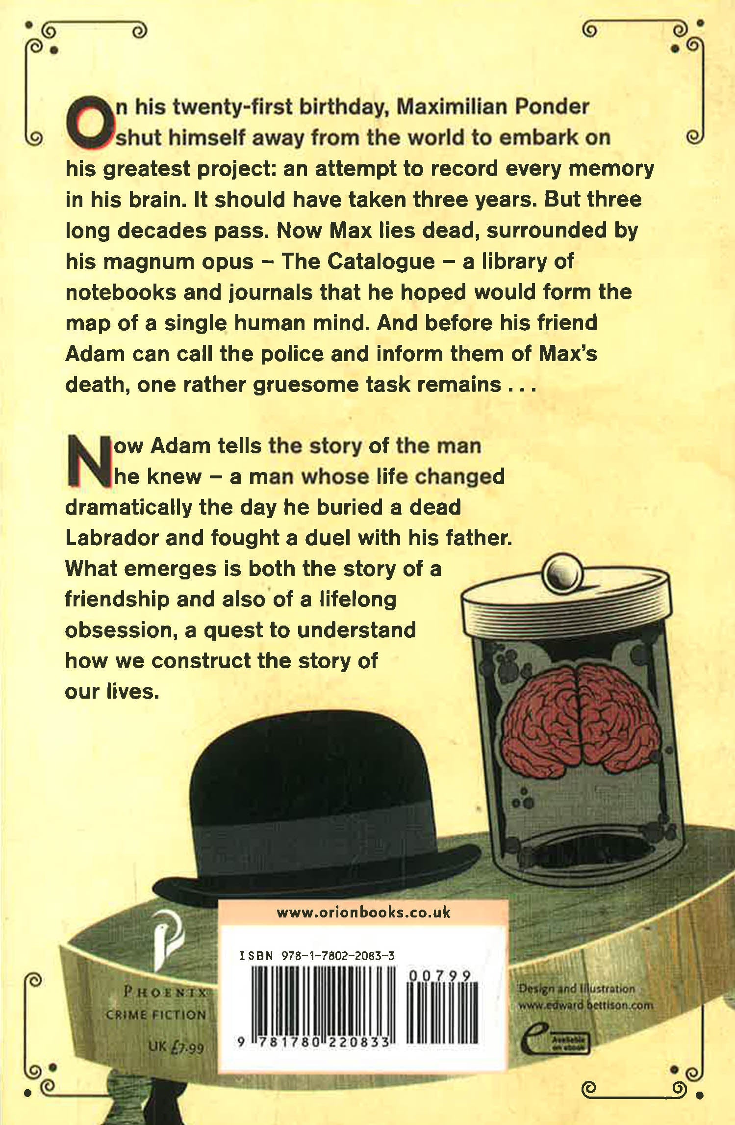 Maximilian Ponder shut himself away for thirty years in an attempt to record every memory he ever had. Now he lies dead, surrounded by his magnum opus - The Catalogue - an exhaustive set of notebooks and journals that he hopes will form the map of one human mind. But before his friend Adam Last can call the police and inform them of Max's death, one rather gruesome task remains in order for Max's project to be complete.