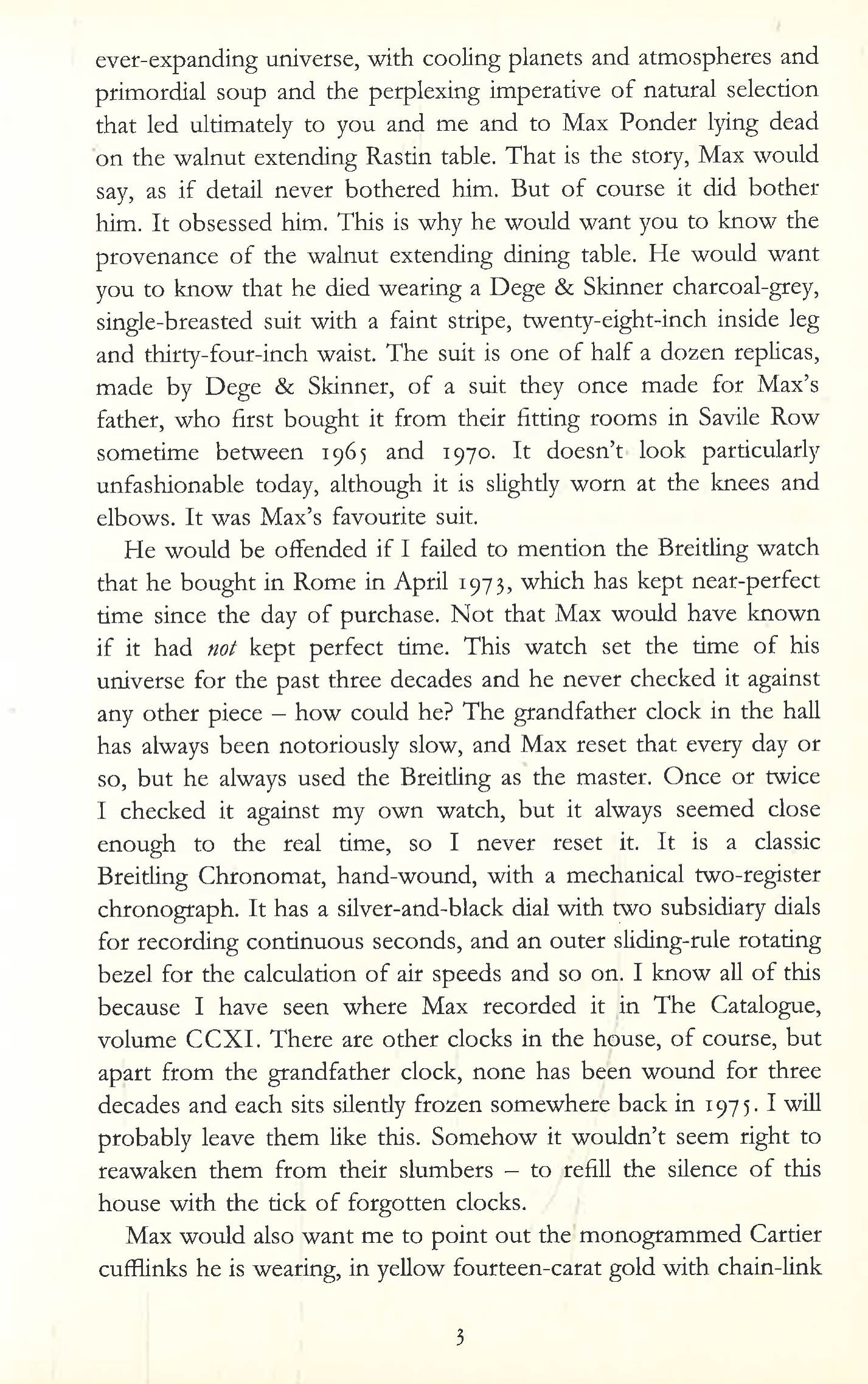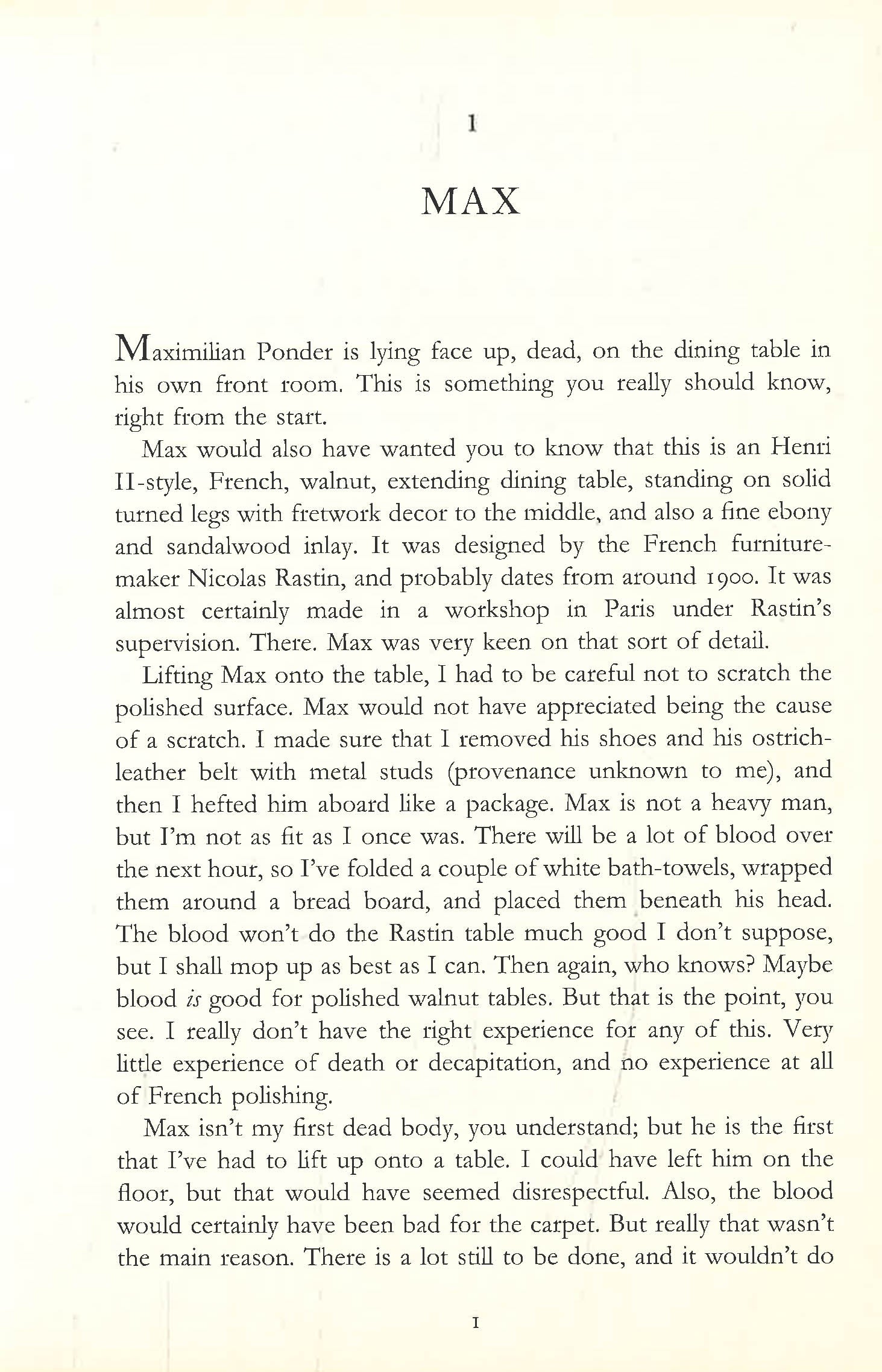 'Maximilian Ponder is lying face up, dead, on the dining table in his own front room. This is something you really should know, right from the start.