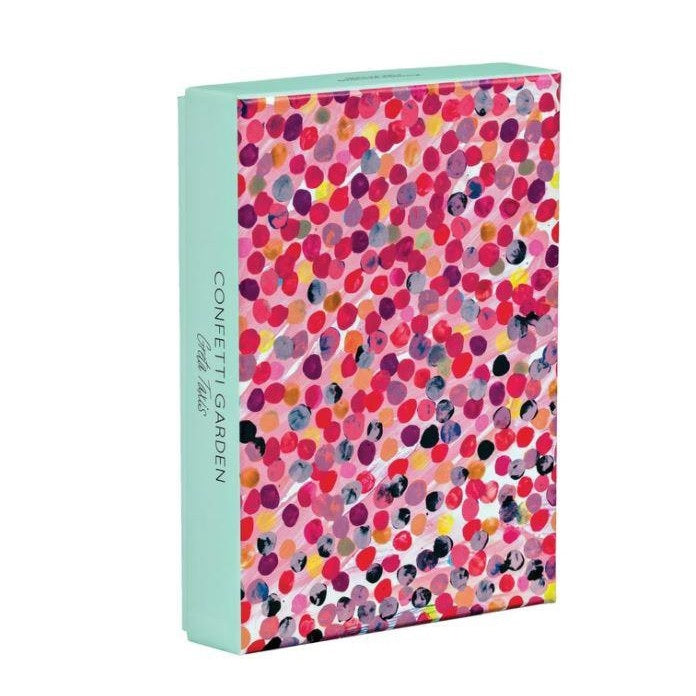 This gorgeous Confetti Garden full-size boxed notecard collection of abstract and tropical paintings featuring pink, red, white and aqua. A kaleidoscopic variety of shape and color combinations in a glossy two-piece box. 20 notecards, 4 each of 5 images. 20 envelopes. Sturdy, reuseable box, great for home decor and storage of special little treasures.
