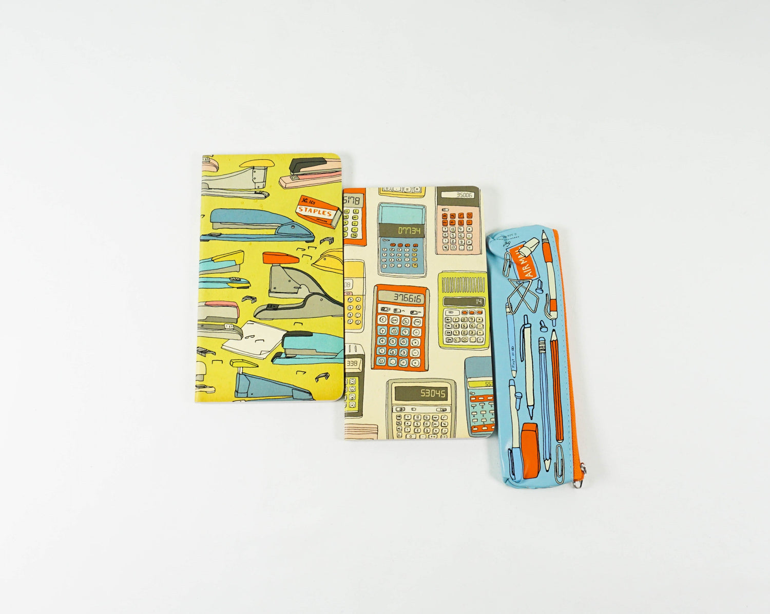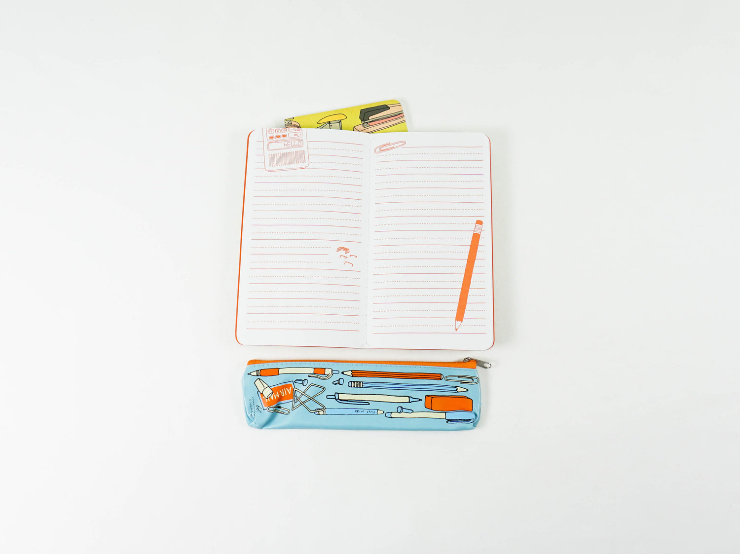 This set of two different side-stitched notebooks and a coordinating zip-top vinyl pencil pouch alongside will conveniently capture a writer or artist's best ideas and also their most essential supplies.