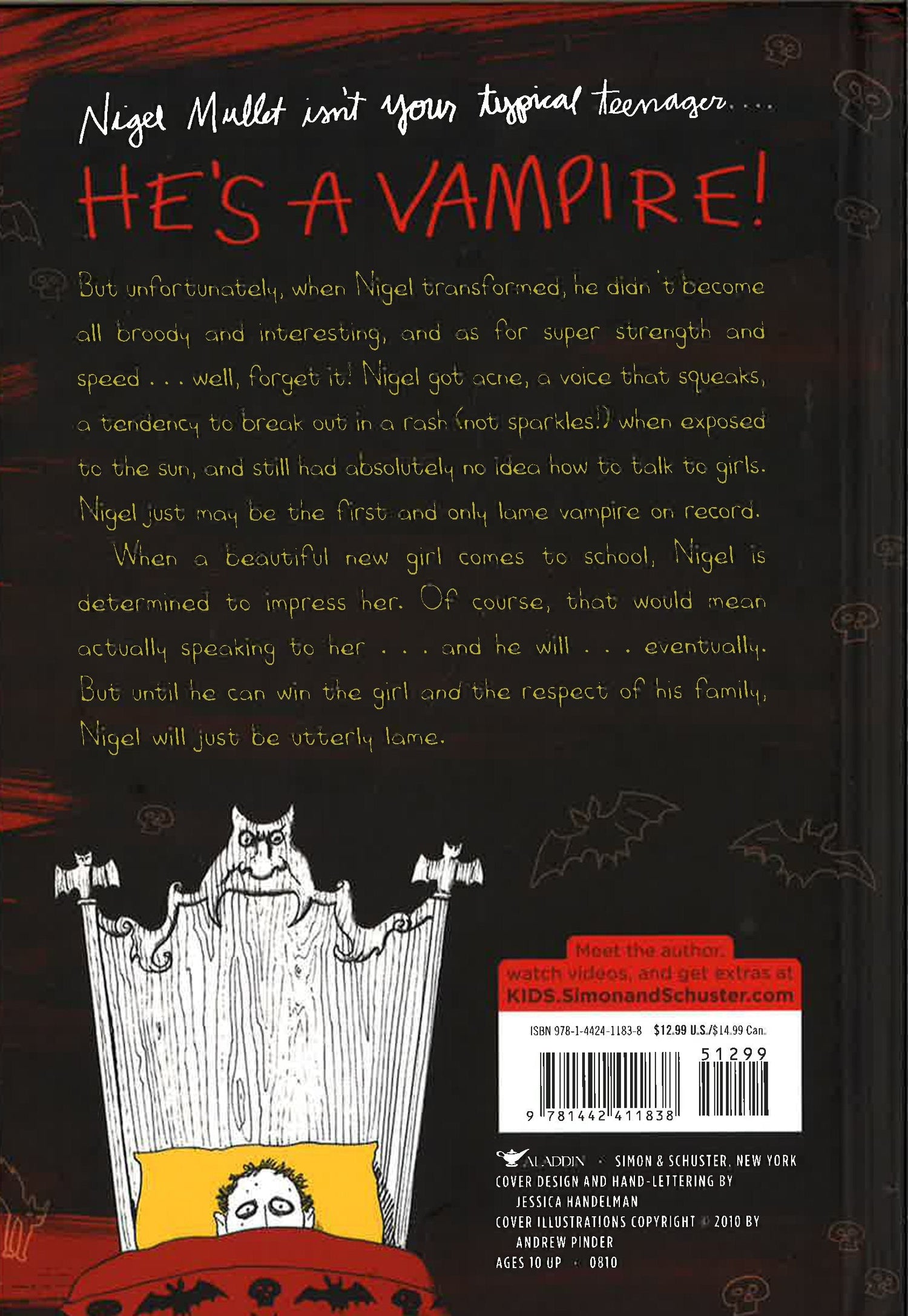 Nigel Mullet isn't your typical teenager . . . he's a vampire. But unfortunately, when Nigel transformed he didn't become all broody and interesting, and as for super strength and speed . . . well, forget it! Instead he's got acne, a voice that squeaks, a tendency to break out in a rash (not sparkles!) when exposed to the sun, and absolutely no idea how to talk to girls. When a beautiful new girl moves into the neighborhood, Nigel is determined to win her heart but first he's got to figure out how. In the meantime, he writes about her in his diary and composes really bad love poetry that he will recite to her one day, if he can work up the courage to tell her the truth. Can Nigel win the girl and the respect of his family or is he destined to be a totally lame vampire forever?