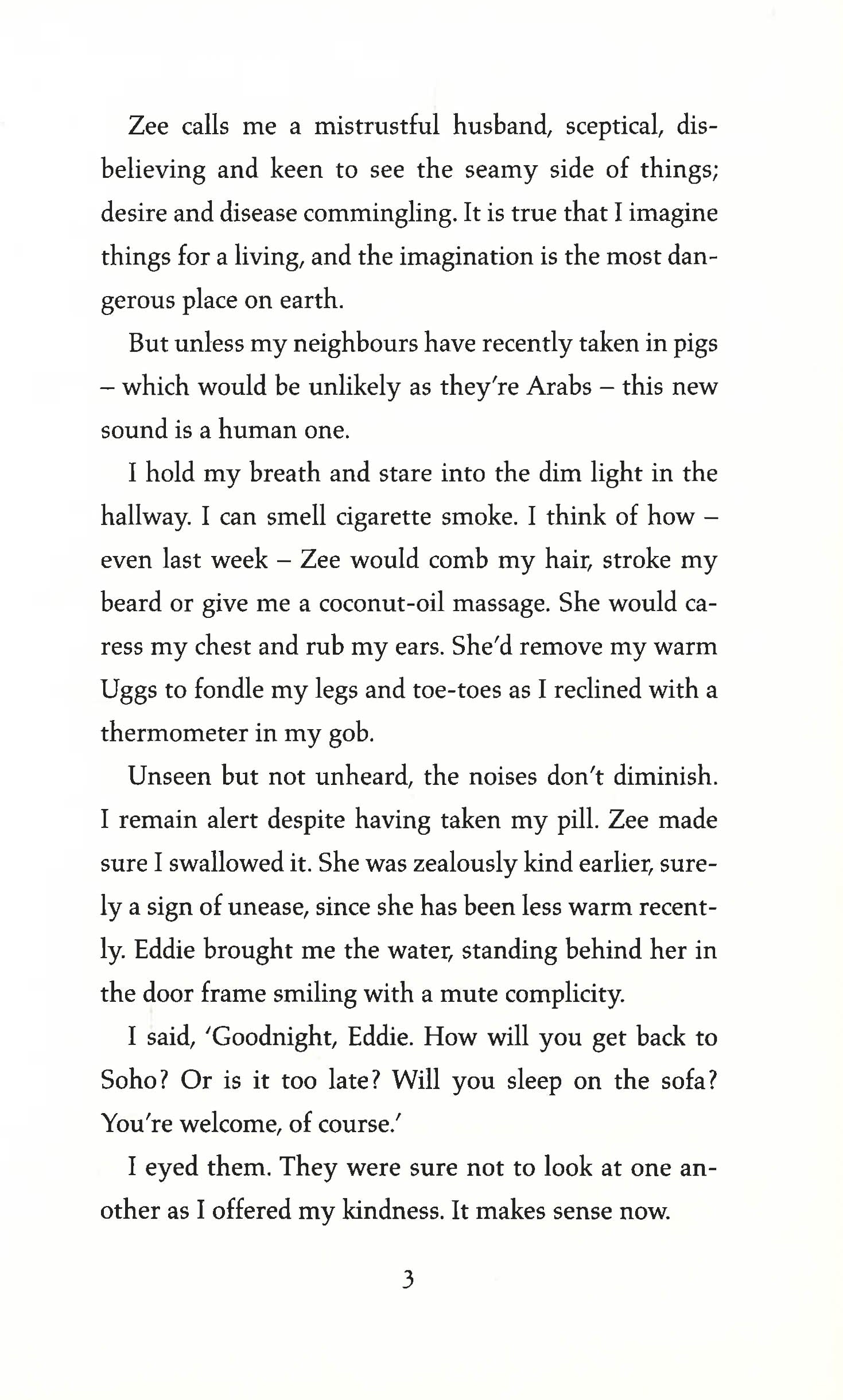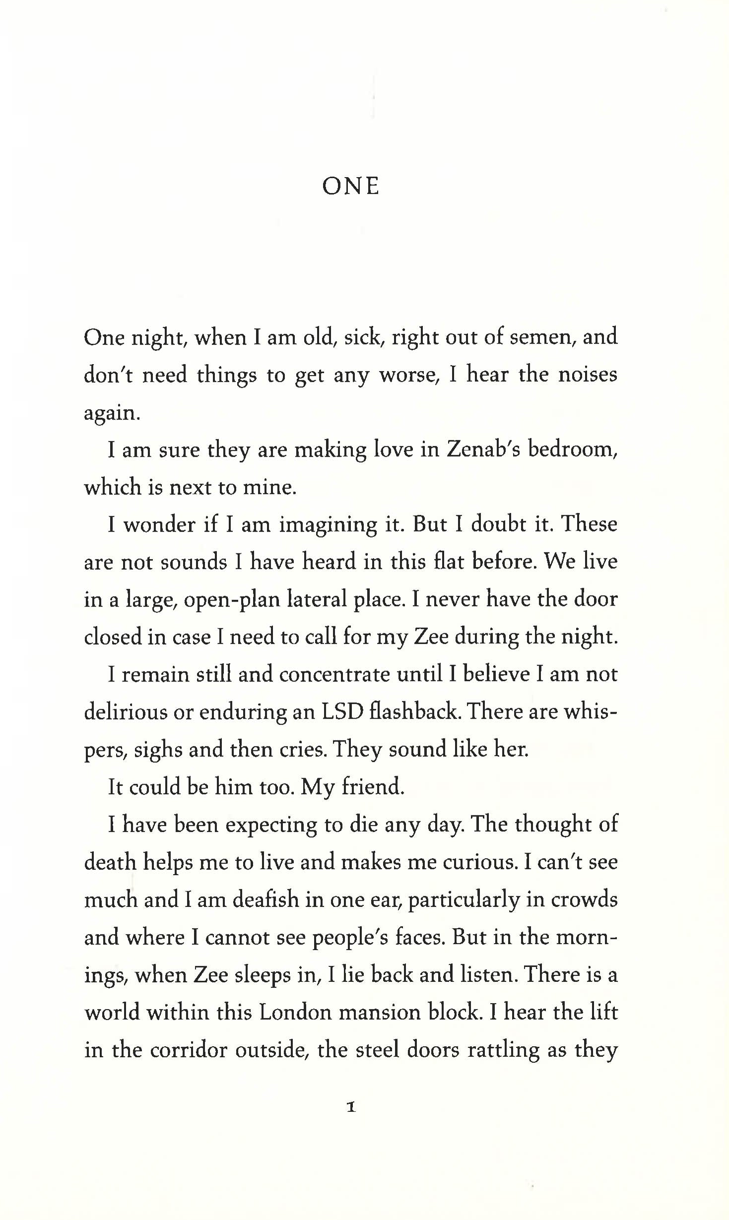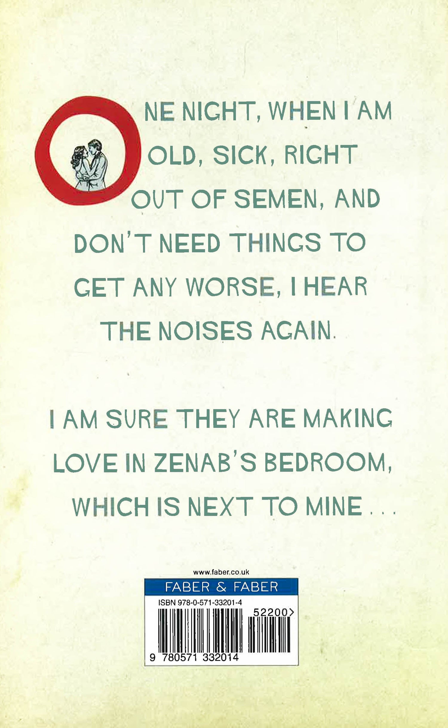 One night, when I am old, sick, right out of semen, and don't need things to get any worse, I hear the noises growing louder. I am sure they are making love in Zenab's bedroom which is next to mine.