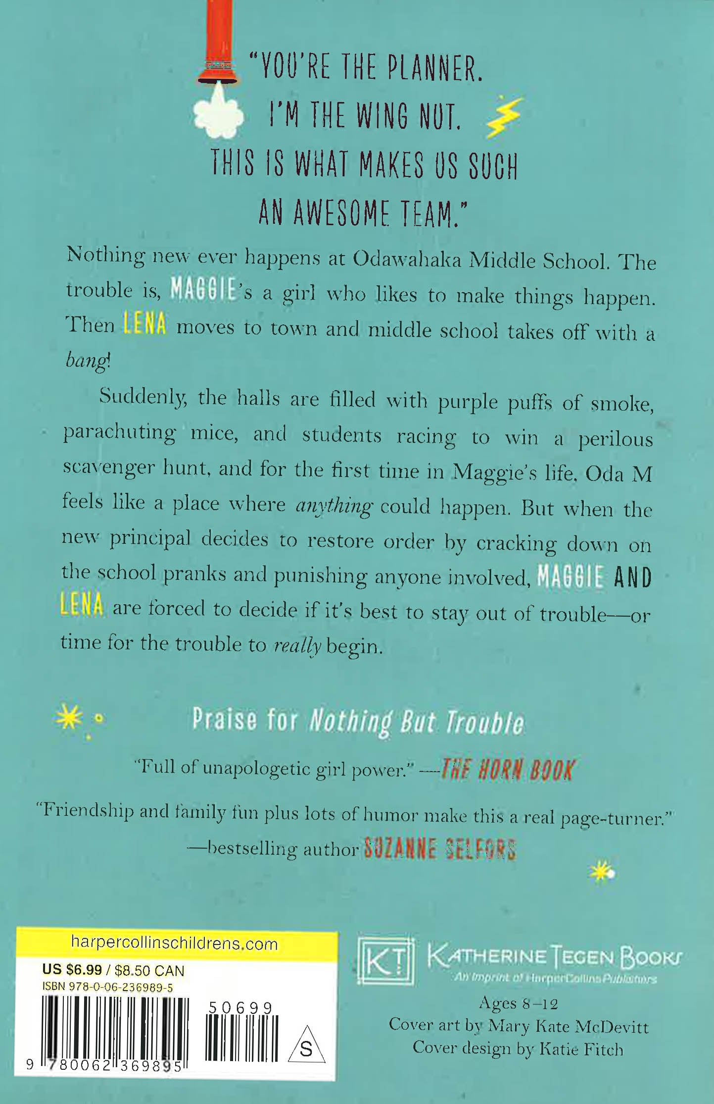 Odawahaka has always been too small for Maggie’s big scientific ideas. Between her stuck-in-a-rut mom, her grumpy grandpop, and the lifetime supply of sludgy soda in the fridge, it’s hard for Maggie to imagine a change. But when Lena moves in with her creative spirit and outrageous perspective, middle school takes off with a bang. Someone starts pulling the kind of pranks that send their rule-loving new principal into an uproar - complete with purple puffs of smoke, parachuting mice, and a scavenger hunt that leads to secret passageways. Suddenly the same-old football games, election for class president, and embarrassing stories feel almost exciting. And for the first time in her life, Maggie begins to wonder if there might be more to Odawahaka than she ever saw coming!Humorous, smart, and full of small-town heart, Nothing But Trouble will have mischief-loving readers caught up in the cleverness and determination of two girls who can’t be held down.
