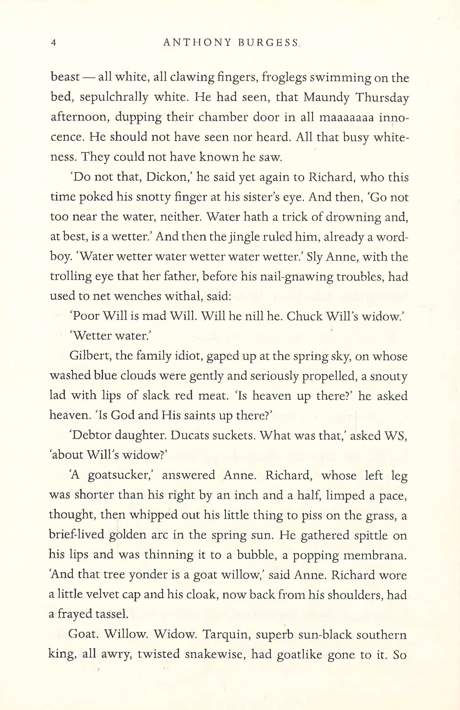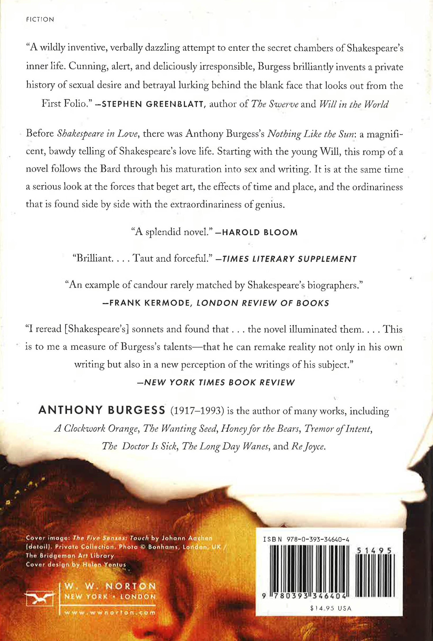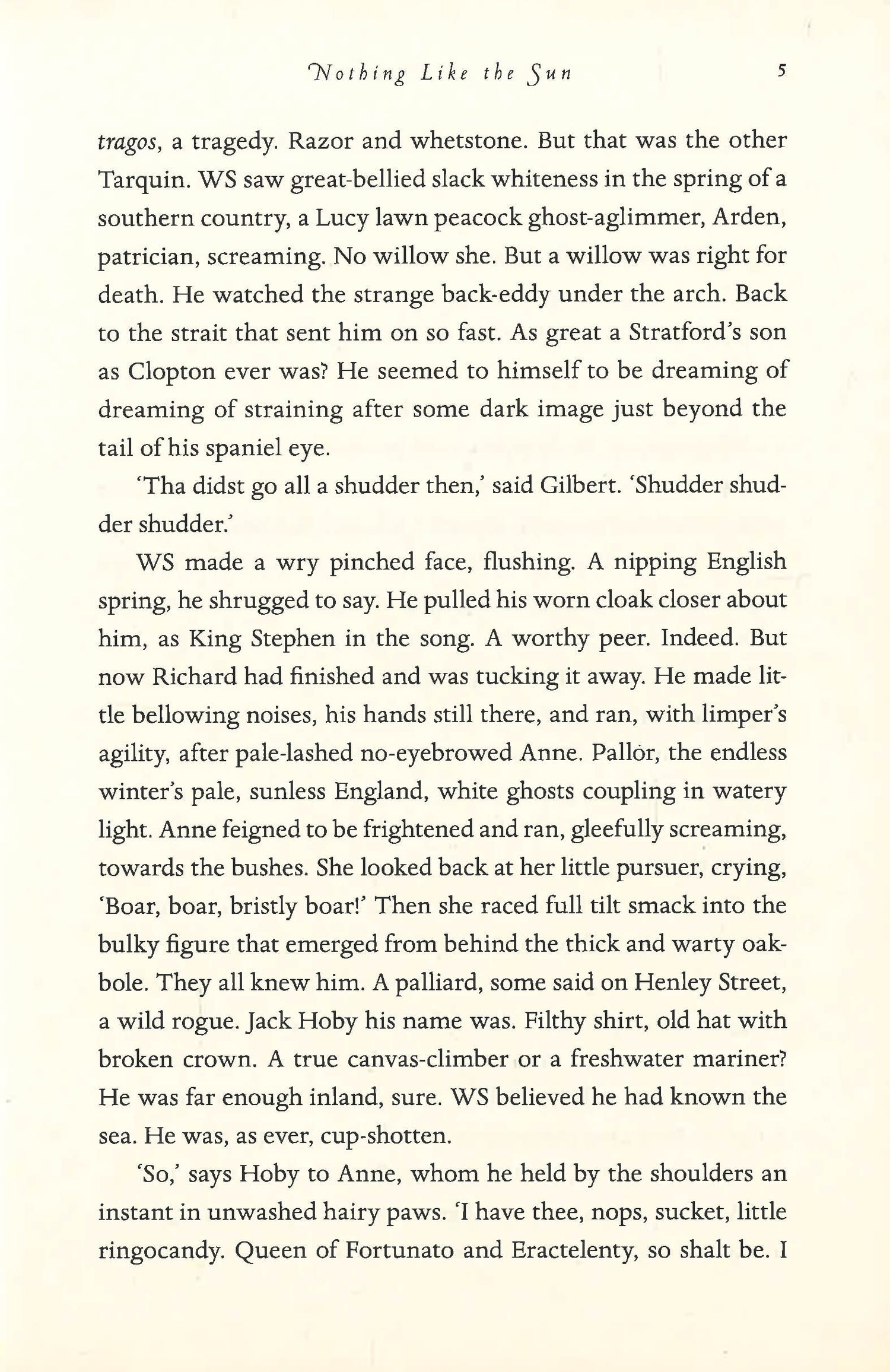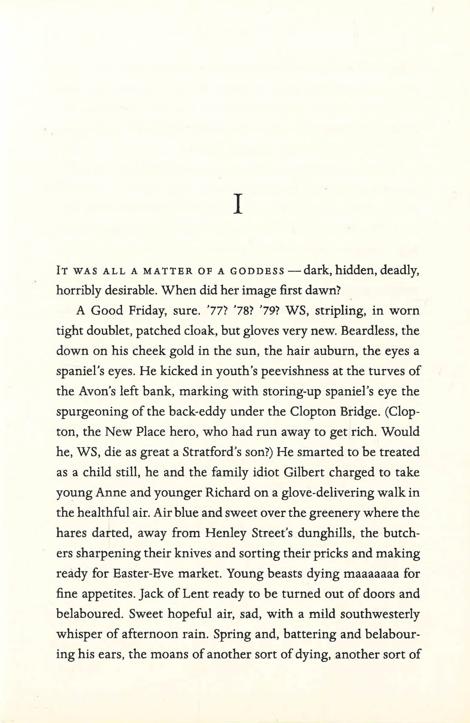A magnificent, bawdy telling of Shakespeare's love life, following young Will's maturation into sex and writing. A playful romp, it is at the same time a serious look at the forces that midwife art, the effects of time and place, and the ordinariness that is found side by side with the extraordinariness of genius.
