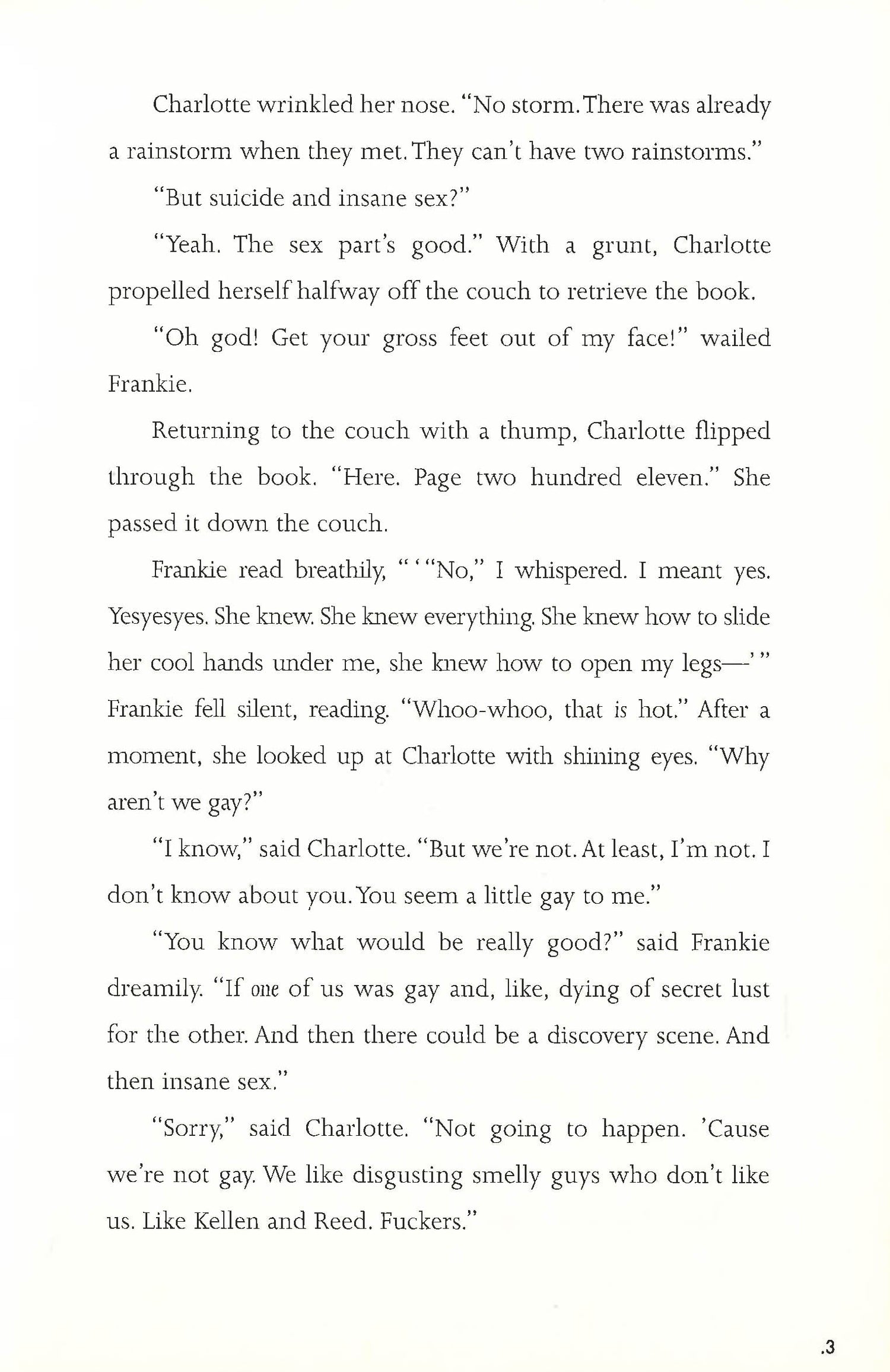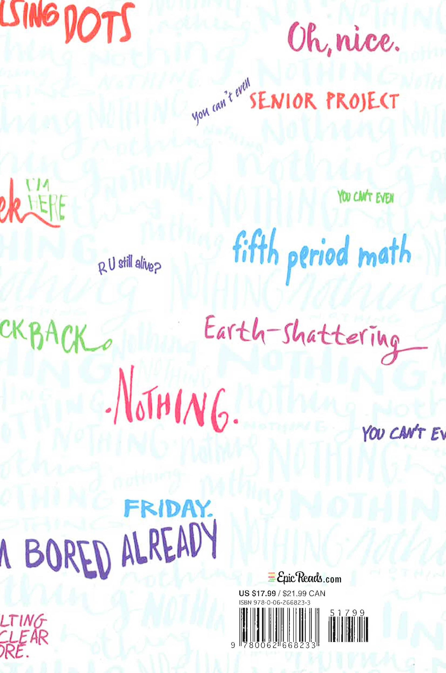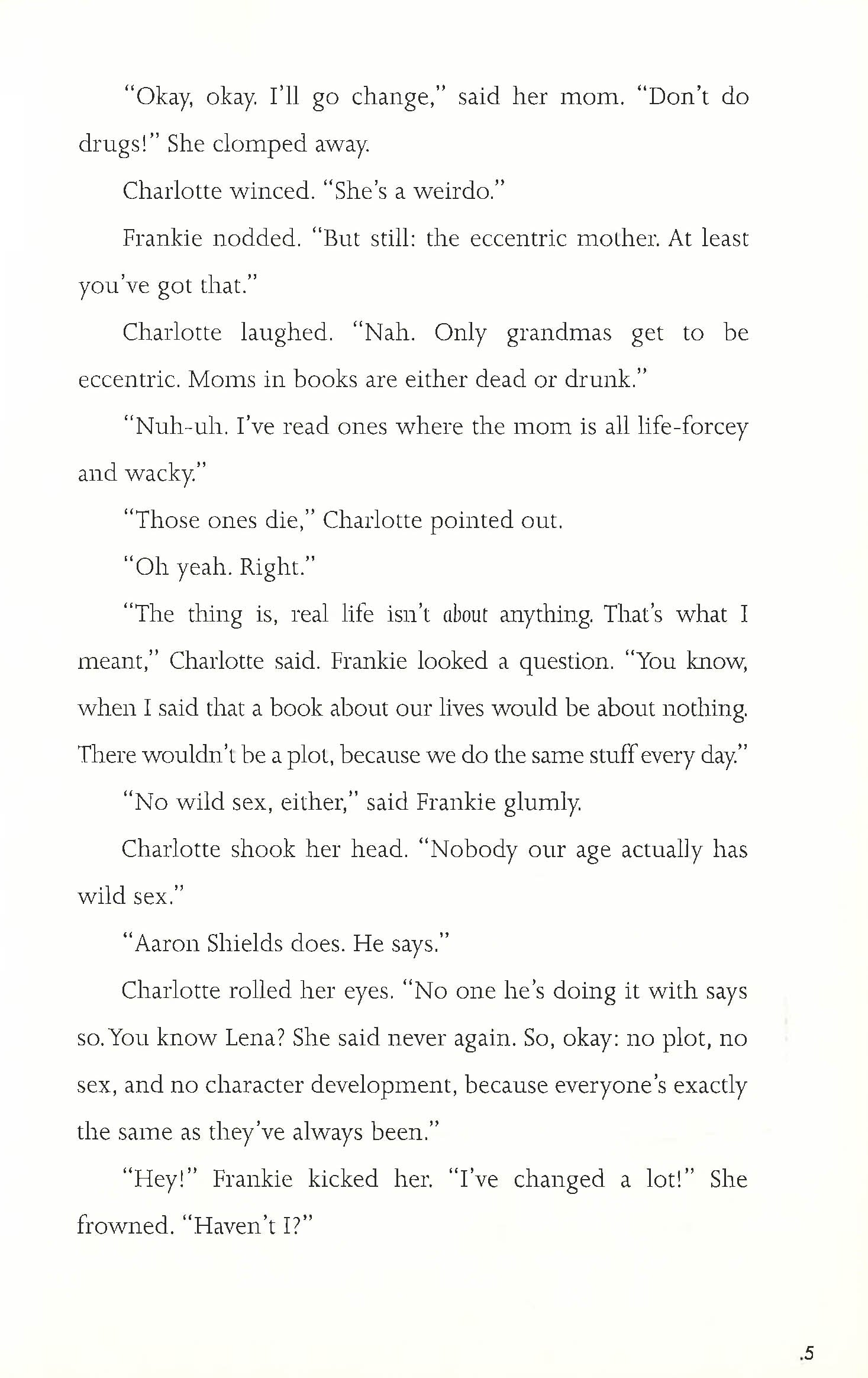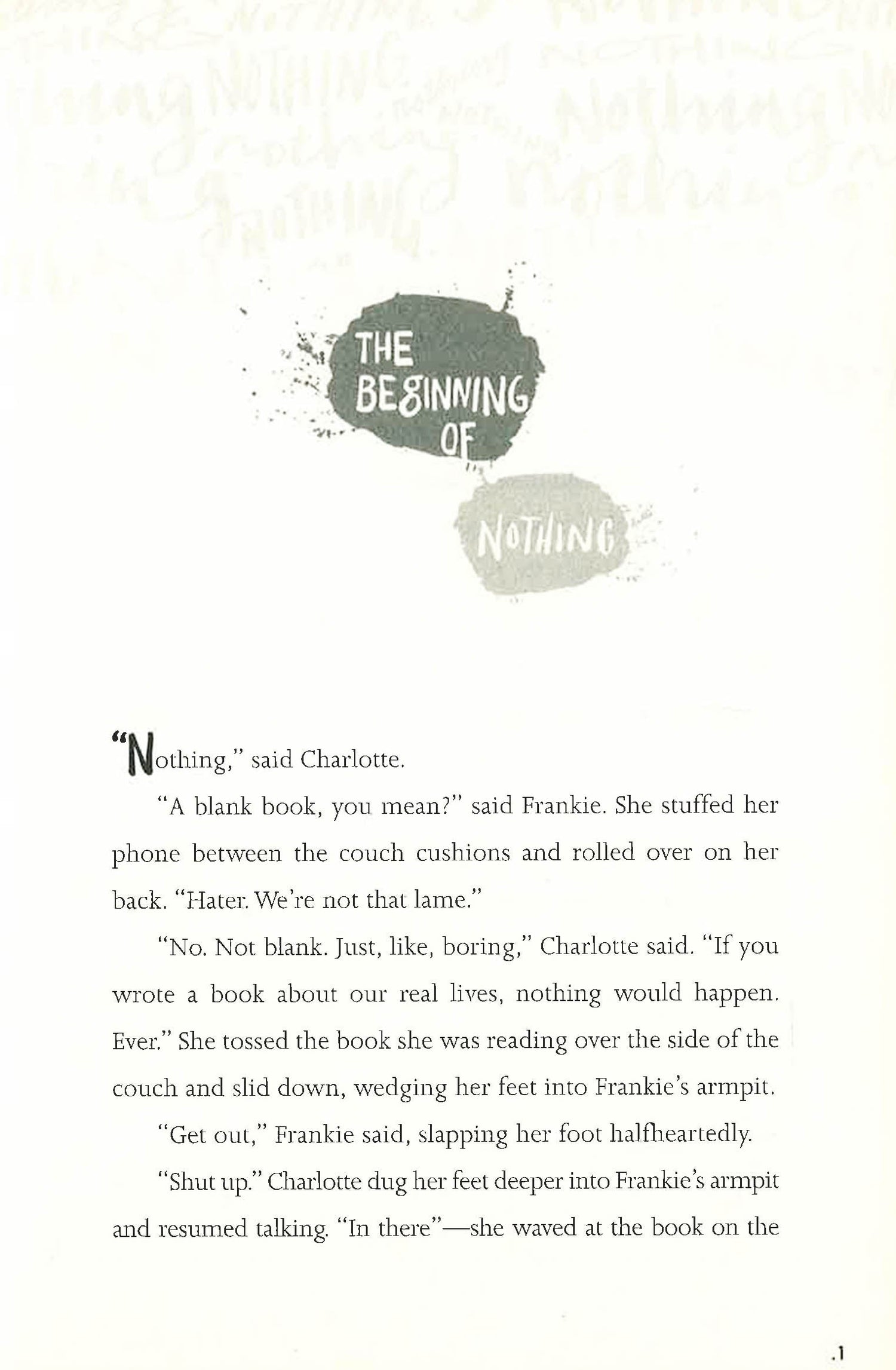 Nothing ever happens to Charlotte and Frankie. Their lives are nothing like the lives of the girls they read about in their YA novels. They don?t have flowing red hair, and hot romantic encounters never happen - let alone meeting a true soul mate. They just go to high school and live at home with their parents, who are pretty normal, all things considered. But when Charlotte decides to write down everything that happens during their sophomore year - to prove that nothing happens and there is no plot or character development in real life - she?s surprised to find that being fifteen isn?t as boring as she thought. It?s weird, heartbreaking, silly, and complicated. And maybe, just perfect.