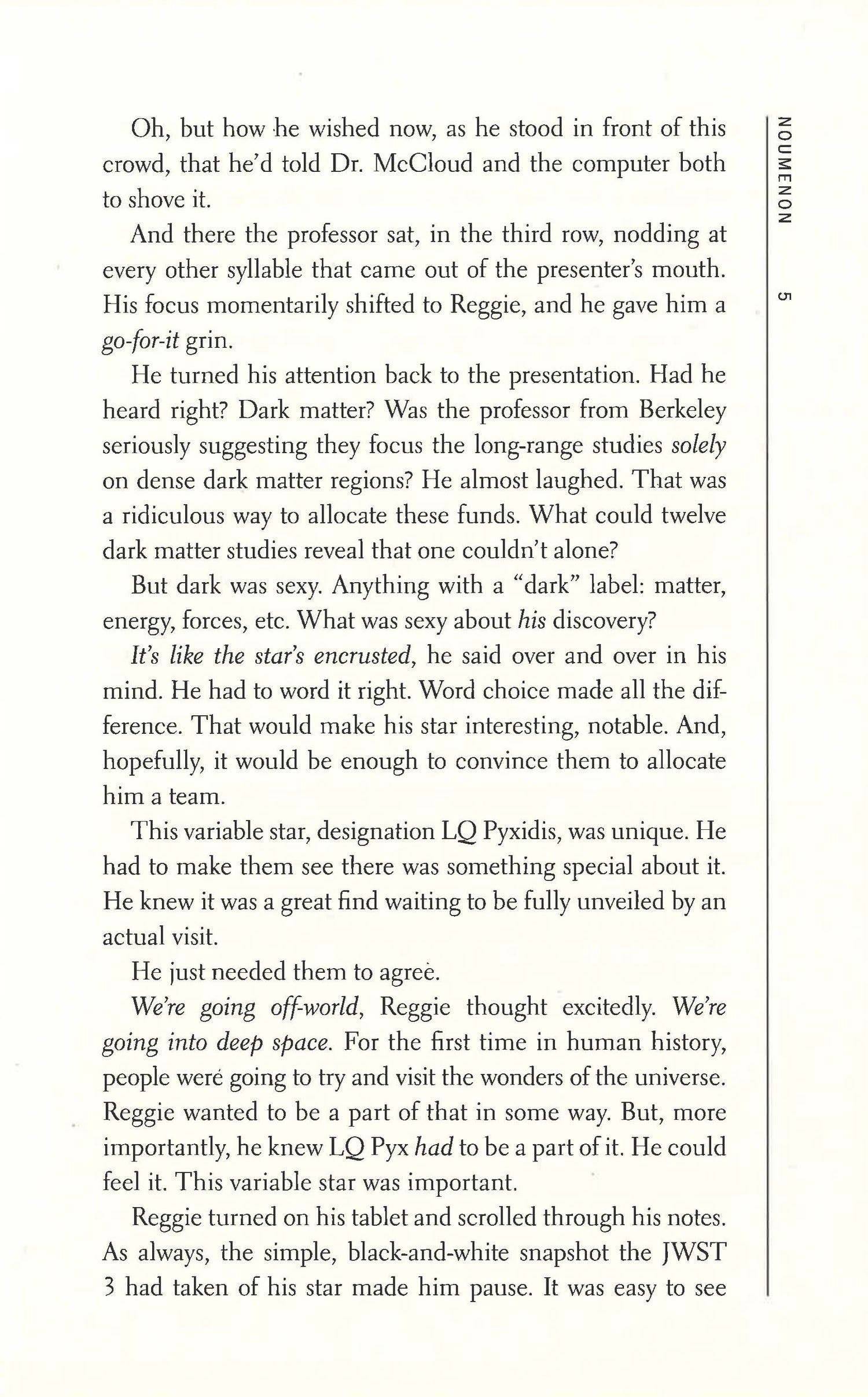 With nods to Arthur C. Clarke?s Rama series, the real science of Neal Stephenson?s Seveneves, a touch of Hugh Howey?s Wool, and told through echoes of Octavia Butler?s voice, this is a powerful tale of space travel, adventure, discovery, and humanity that unfolds through a series of generational vignettes In 2088, humankind is at last ready to explore beyond Earth?s solar system. But one uncertainty remains: Where do we go? Astrophysicist Reggie Straifer has an idea. He?s discovered an anomalous star that appears to defy the laws of physics, and proposes the creation of a deep-space mission to find out whether the star is a weird natural phenomenon, or something manufactured. The journey will take eons. In order to maintain the genetic talent of the original crew, humankind?s greatest ambition?to explore the furthest reaches of the galaxy?is undertaken by clones. But a clone is not a perfect copy, and each new generation has its own quirks, desires, and neuroses. As the centuries fly by, the society living aboard the nine ships (designated ?Convoy Seven?) changes and evolves, but their mission remains the same: to reach Reggie?s mysterious star and explore its origins?and implications. A mosaic novel of discovery, Noumenon?in a series of vignettes?examines the dedication, adventure, growth, and fear of having your entire world consist of nine ships in the vacuum of space. The men and women, and even the AI, must learn to work and live together in harmony, as their original DNA is continuously replicated and they are born again and again into a thousand new lives. With the stars their home and the unknown their destination, they are on a voyage of many lifetimes?an odyssey to understand what lies beyond the limits of human knowledge and imagination.