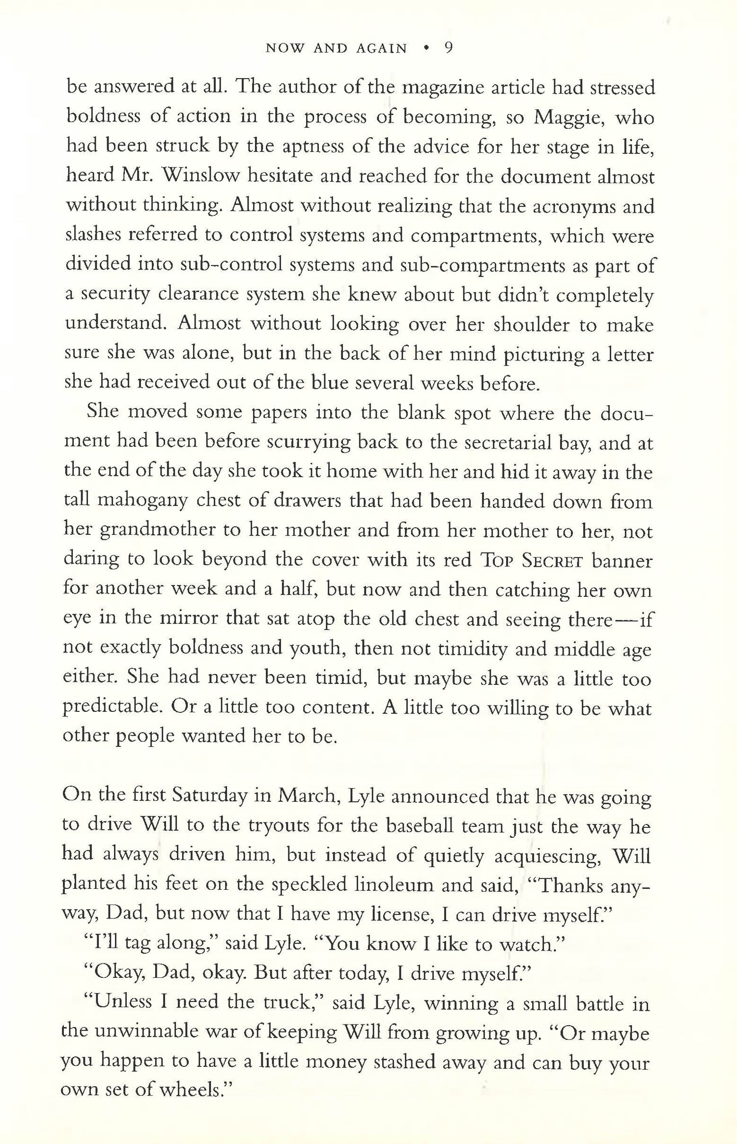 For Maggie Rayburn--wife, mother, and longtime secretary at a munitions plant--life is pleasant, predictable, and, she assumes, secure. When she finds proof of a high-level cover-up on her boss's desk, she impulsively takes it, an act that turns her world, and her worldview, upside down. Propelled by a desire to do good--and also by a newfound taste for excitement--Maggie starts to see injustice everywhere. Soon, her bottom drawer is filled with what she calls "evidence," her small town has turned against her, and she must decide how far she will go for the truth. NOW AND AGAIN is a blazingly original novel about the interconnectedness of lives, the limits of knowledge, and the consequences of doing the right thing.