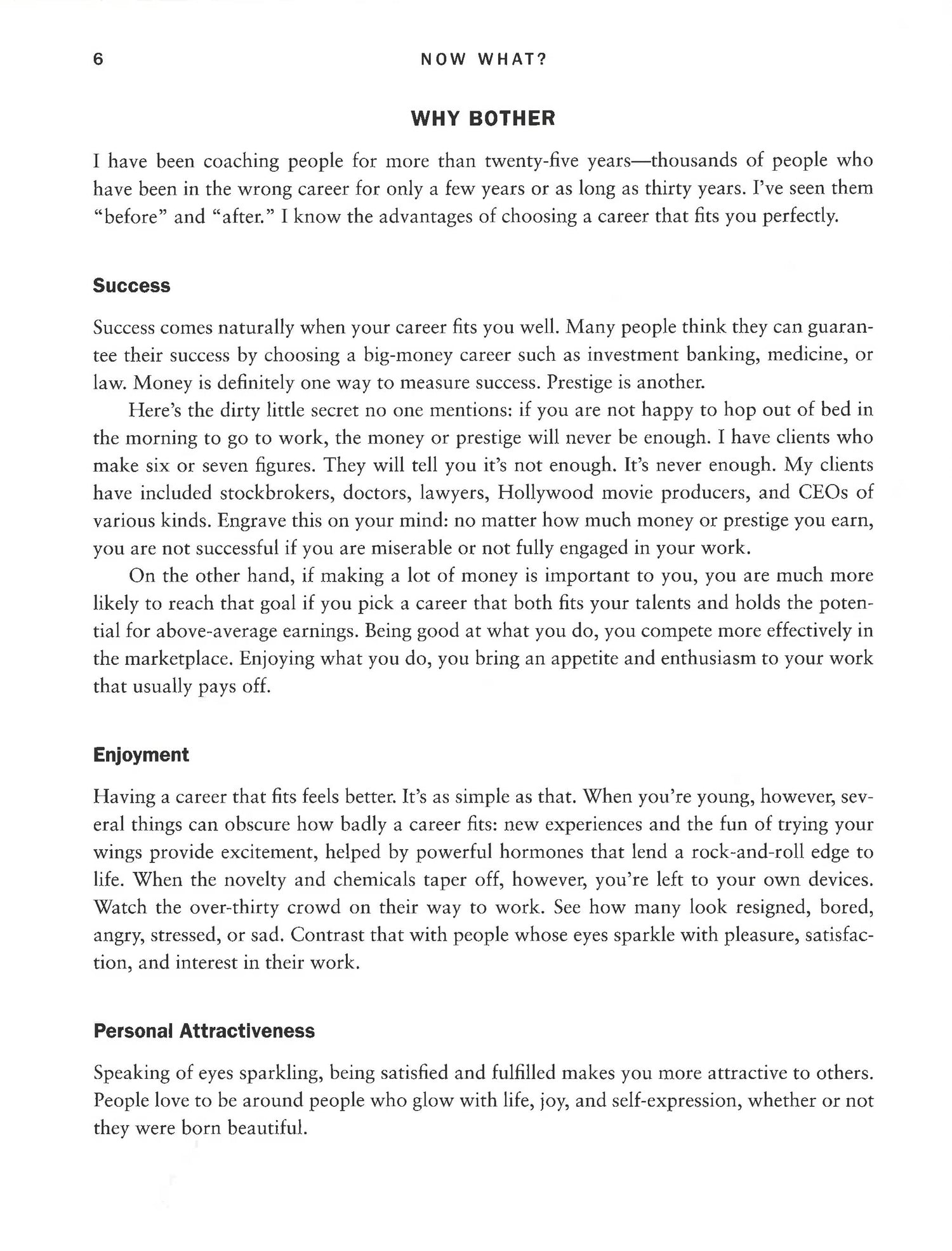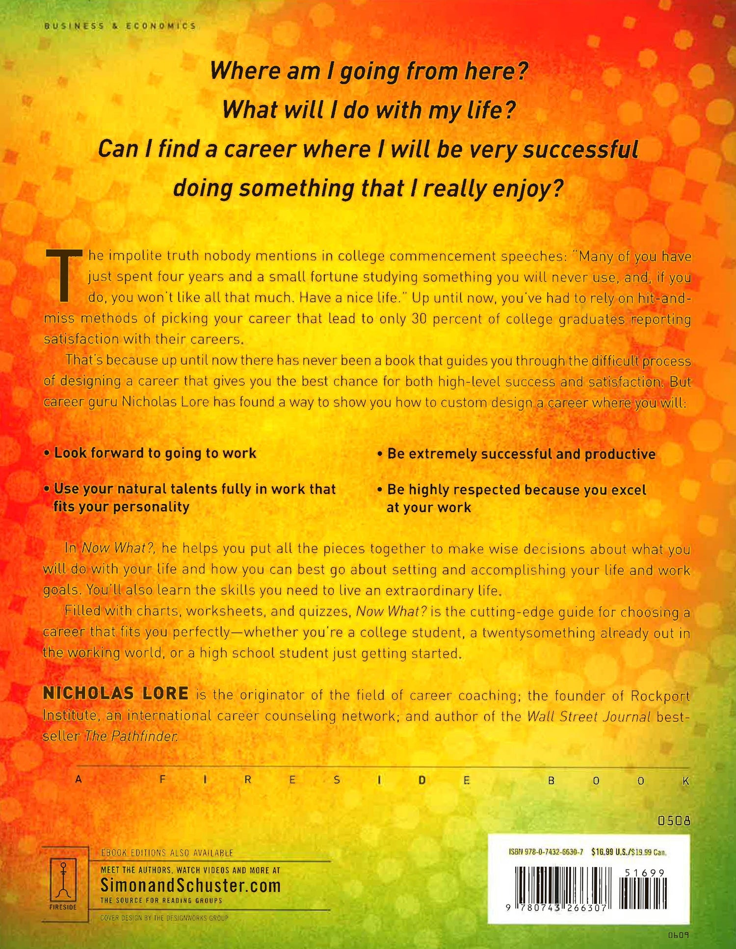 The impolite truth nobody mentions in college commencement speeches: "Many of you have just spent four years and a small fortune studying something you will never use, and, if you do, you won't like all that much. Have a nice life." Up until now, you've had to rely on hit-and-miss methods of picking your career that lead to only 30 percent of college graduates reporting satisfaction with their careers. That's because up until now there has never been a book that guides you through the difficult process of designing a career that gives you the best chance for both high-level success and satisfaction. But career guru Nicholas Lore has found a way to show you how to custom design a career where you will: Look forward to going to work Be extremely successful and productive Use your natural talents fully in work that fits your personality Be highly respected because you excel at your work In Now What?, he helps you put all the pieces together to make wise decisions about what you will do with your life and how you can best go about setting and accomplishing your life and work goals. You'll also learn the skills you need to live an extraordinary life. Filled with charts, worksheets, and quizzes, Now What? is the cutting-edge guide for choosing a career that fits you perfectly -- whether you're a college student, a twentysomething already out in the working world, or a high school student just getting started. *This book may have remainder mark*