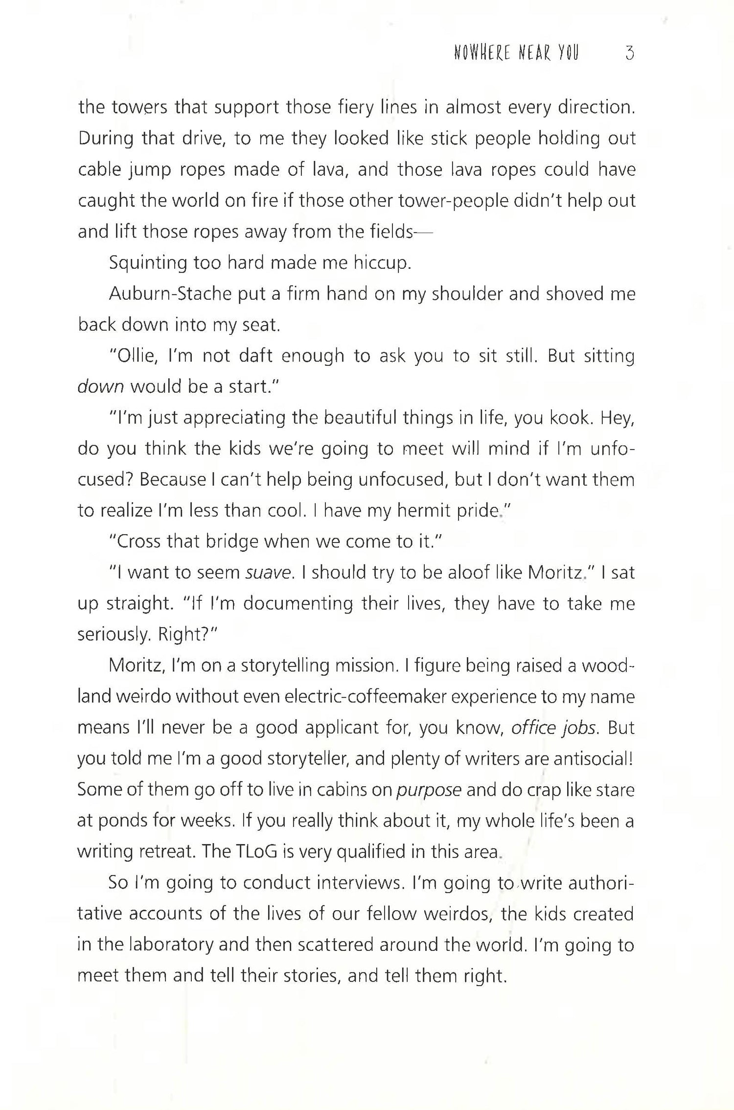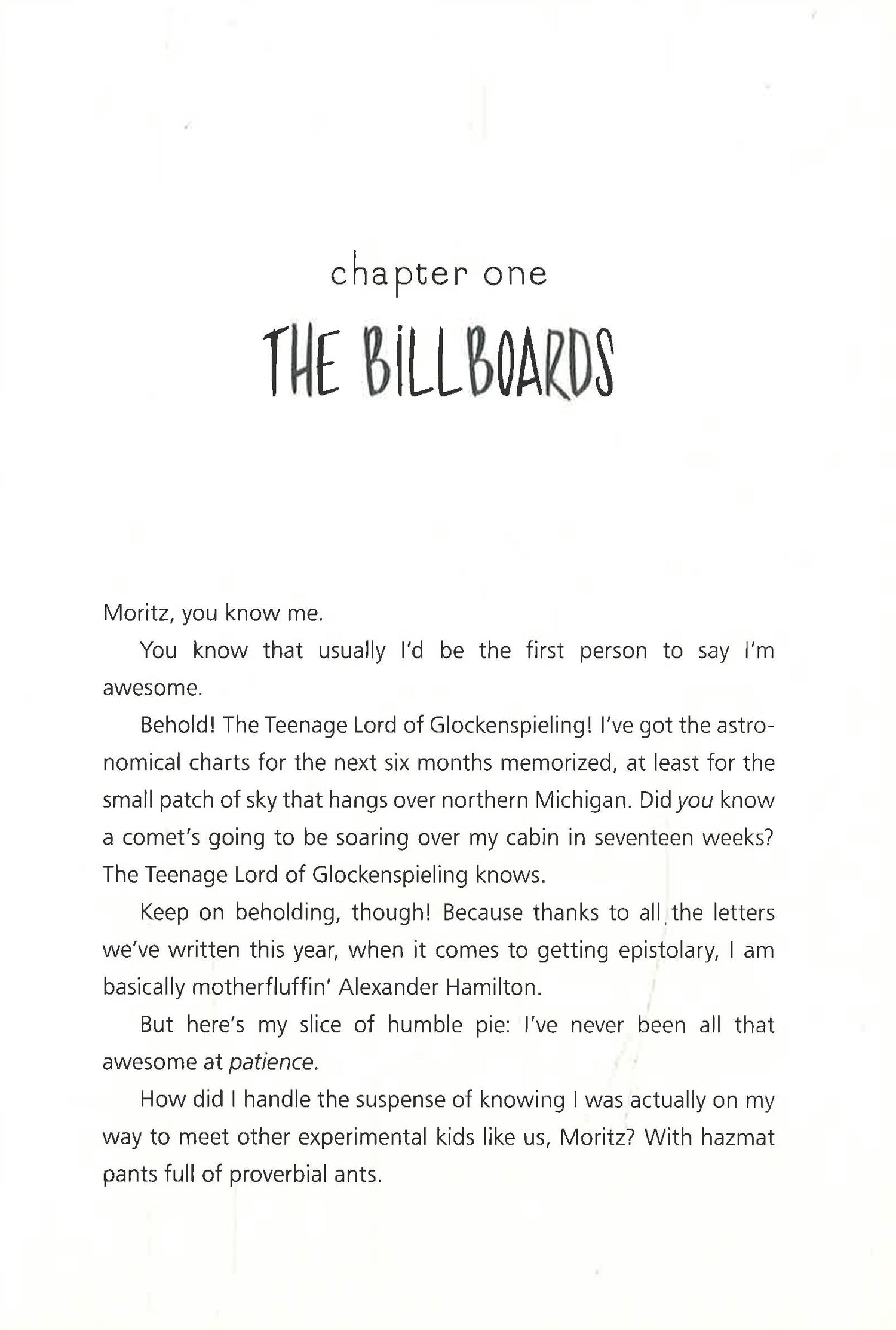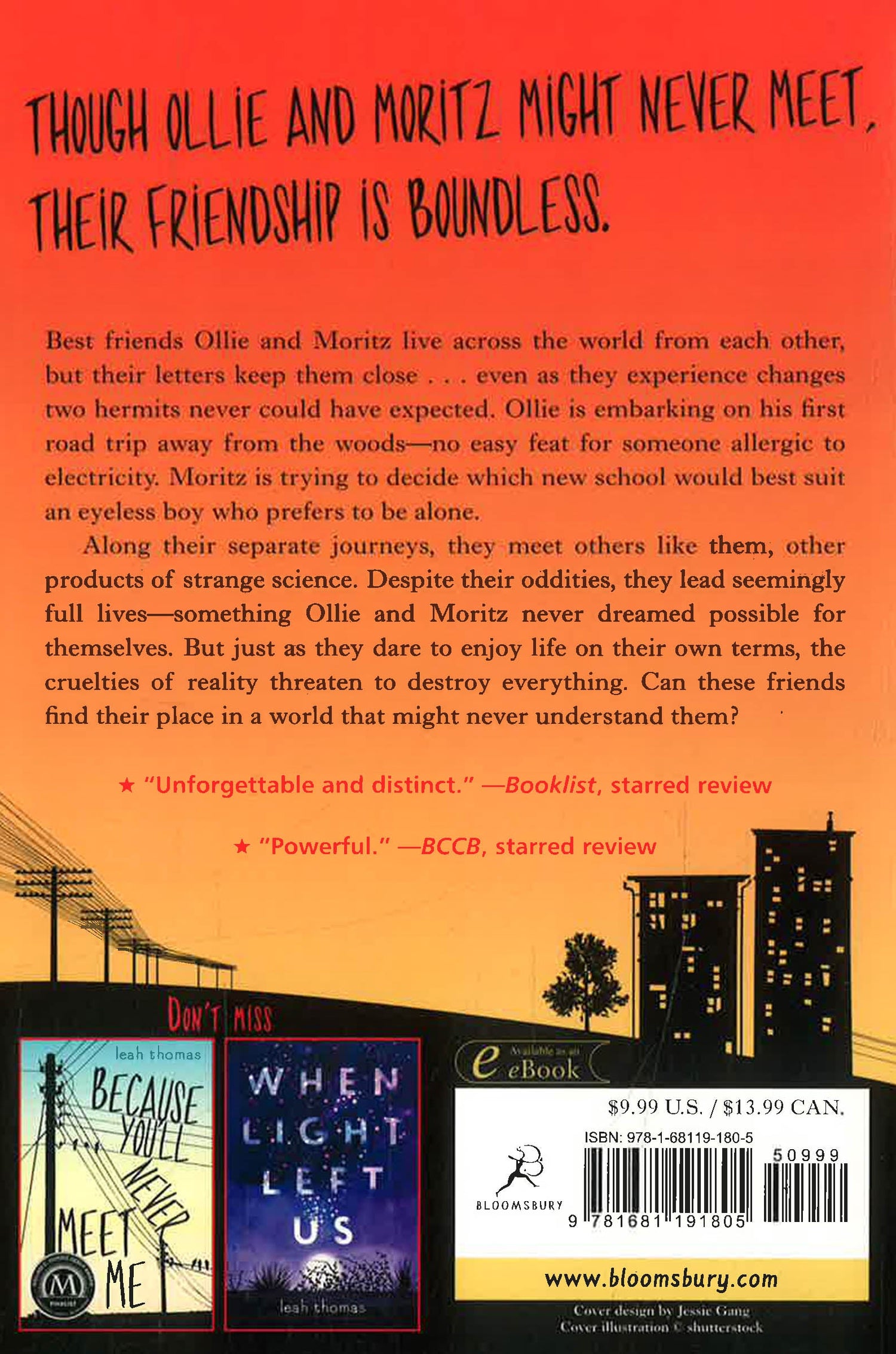 Ollie and Moritz might never meet, but their friendship knows no bounds. Their letters carry on as Ollie embarks on his first road trip away from the woods--no easy feat for a boy allergic to electricity--and Moritz decides which new school would best suit an eyeless boy who prefers to be alone.Along the way they meet other teens like them, other products of strange science who lead seemingly normal lives in ways Ollie and Moritz never imagined possible: A boy who jokes about his atypical skeleton; an aspiring actress who hides a strange deformity; a track star whose abnormal heart propels her to victory. Suddenly the future feels wide open for two former hermits. But even as Ollie and Moritz dare to enjoy life, they can't escape their past, which threatens to destroy any progress they've made. Can these boys ever find their place in a world that might never understand them?