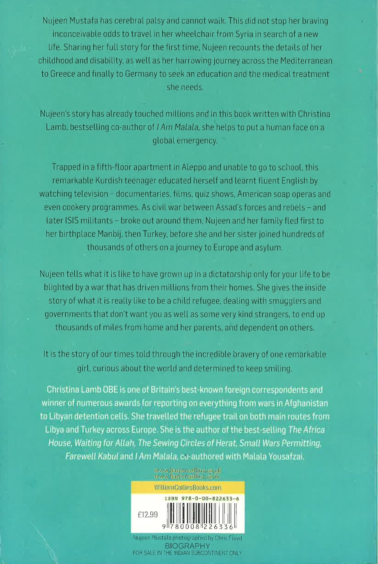 Nujeen Mustafa has cerebral palsy and cannot walk. This did not stop her braving inconceivable odds to travel in her wheelchair from Syria in search of a new life. Sharing her full story for the first time, Nujeen recounts the details of her childhood and disability, as well as the specifics of her harrowing journey across the Mediterranean to Greece and finally to Germany to seek an education and the medical treatment she needs. Nujeen's story has already touched millions and in this book written with Christina Lamb, bestselling co-author of `I Am Malala', she helps to put a human face on a global emergency. Trapped in a fifth floor apartment in Aleppo and unable to go to school, she taught herself to speak English by watching US television. As civil war between Assad's forces and ISIS militants broke out around them, Nujeen and her family fled first to her native Kobane, then Turkey before they joined thousands of displaced persons in a journey to Europe and asylum. She wanted to come to Europe, she said, to become an astronaut, to meet the Queen and to learn how to walk. In her strong, positive voice, Nujeen tells the story of what it is really like to be a refugee, to have grown up in a dictatorship only for your life to be blighted by war; to have left a beloved homeland to become dependent on others. It is the story of our times told through the incredible bravery of one remarkable girl determined to keep smiling.