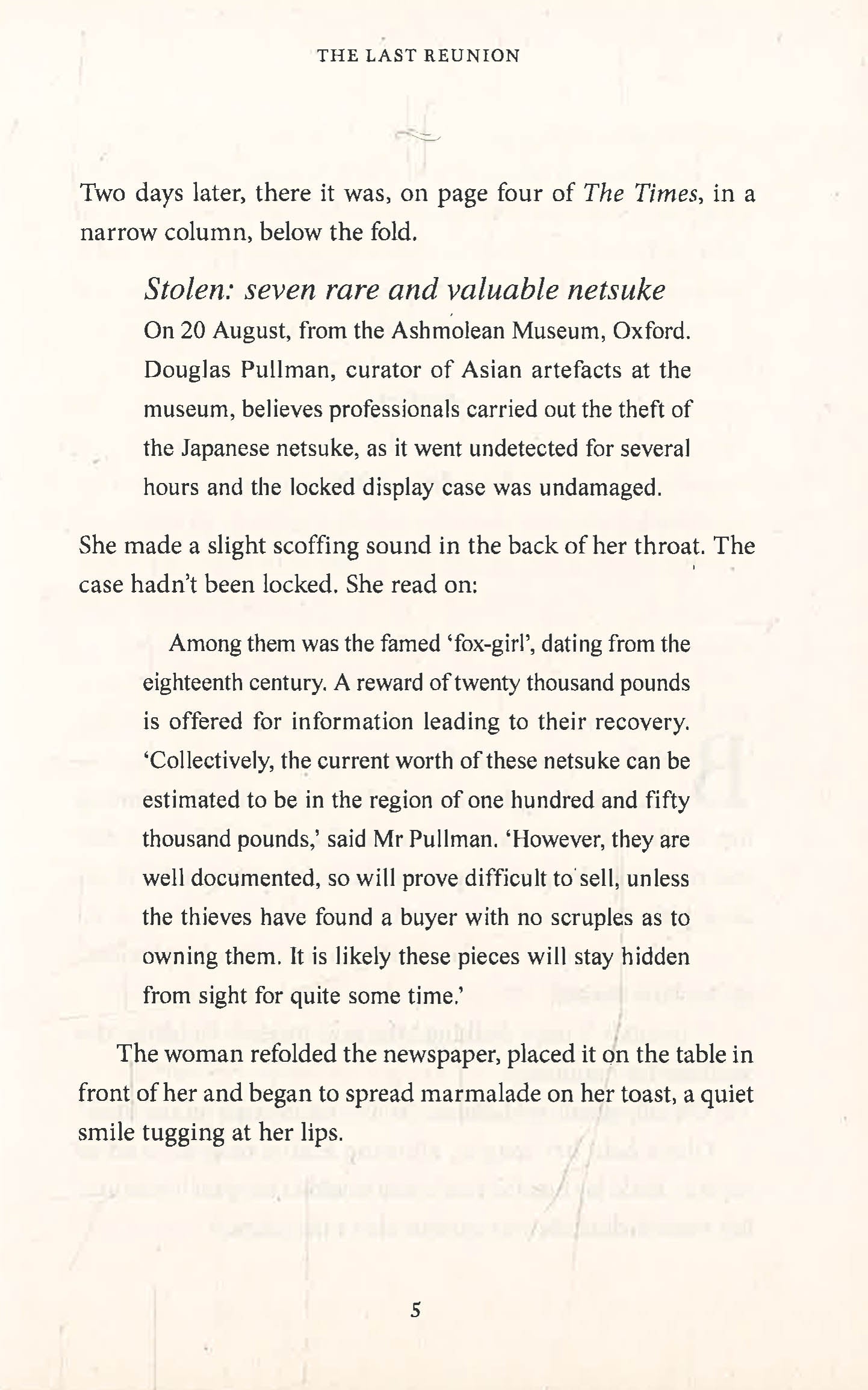 Oxford, 1976. At the height of an impossibly hot English summer, a woman slips into a museum and steals several rare Japanese netsuke, including the famed fox-girl. Despite the offer of a considerable reward, these tiny, exquisitely detailed carvings are never seen again.