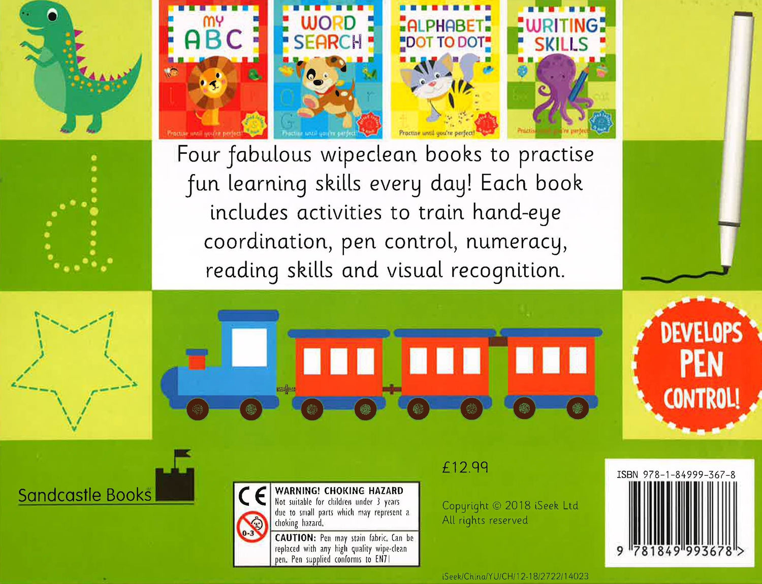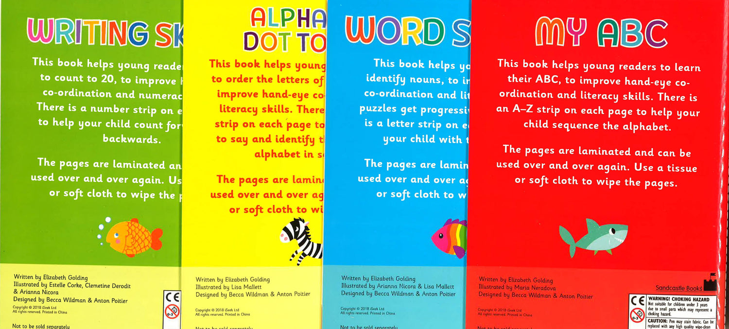 Four fabulous wipe clean books will help to develop pen control in a fun and simple way. Tracing, matching and drawing encourage children to write letters, numbers and words, as well as expanding their vocabulary. Once completed, the pages can be wiped clean, ready to use again! These are wipe clean books with 18 pages in each book.