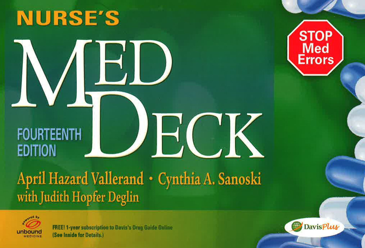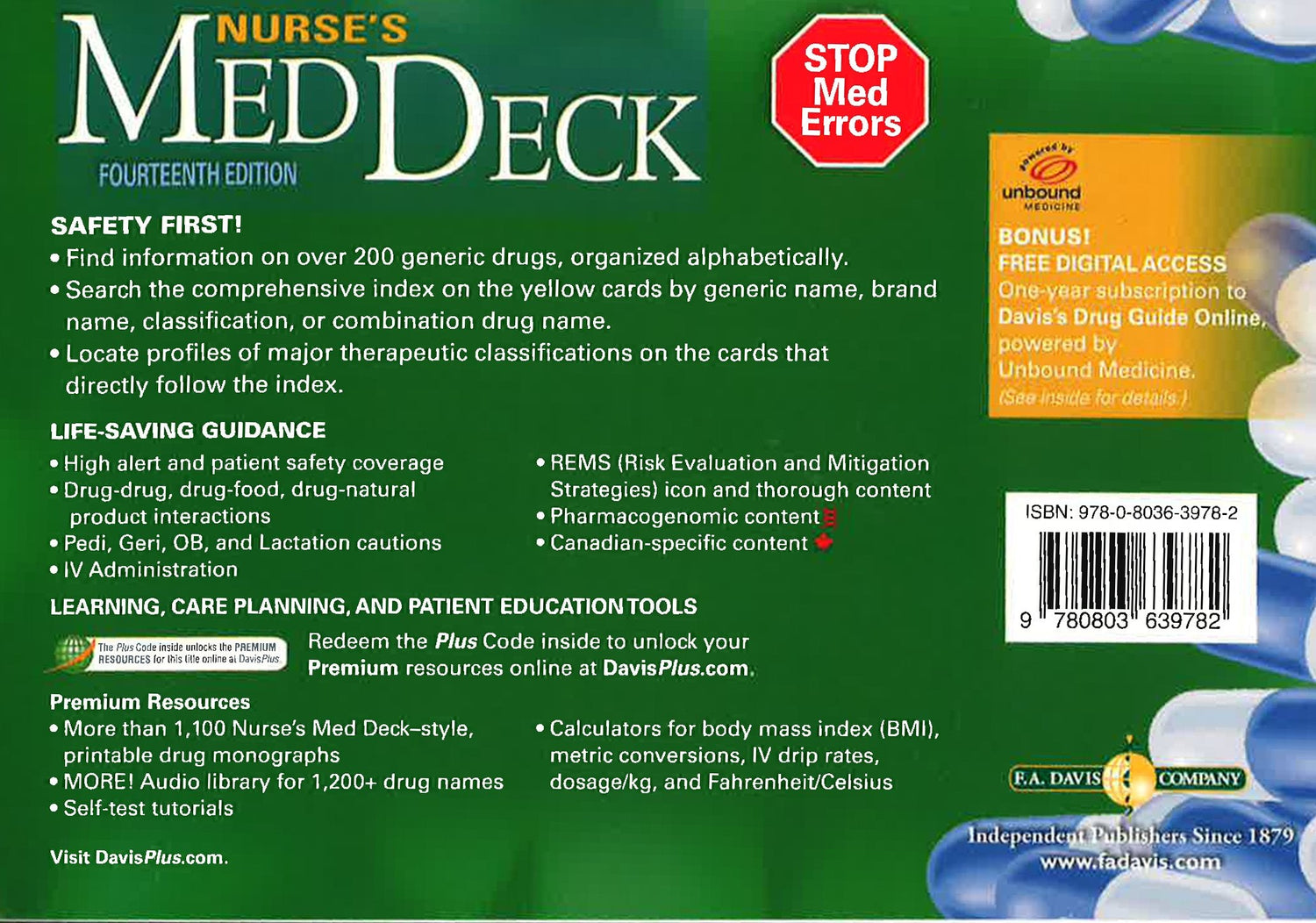 SAFETY FIRST! NURSE'S MED DECK, FOURTEENTH EDITION, is the card deck version of the bestselling Davis's Drug Guide for Nurses(R), Fourteenth Edition. Like the book, it always puts safety first...emphasizing the information you need to know to administer medications safely...across the lifespan. Find information on over 200 generic drugs, organized alphabetically. Search the comprehensive index on the yellow cards by generic name, brand name, classification, or combination drug name. Locate profiles of major therapeutic classifications on the cards that directly follow the index. Carry up to 30 cards in a durable plastic pouch.