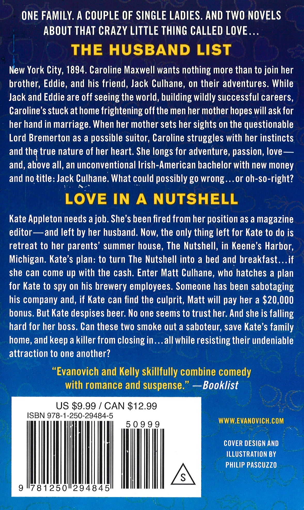 One family. A couple of single ladies. And two novels about that crazy little thing called love. . .Two novels from beloved authors Janet Evanovich and Dorien Kelly, now in one great packageThe Husband ListNew York City, 1894. Caroline Maxwell wants nothing more than to join her brother, Eddie, and his friend, Jack Culhane, on their adventures. While Jack and Eddie are off seeing the world, building wildly successful careers, Caroline's stuck at home frightening off the men her mother hopes will ask for her hand in marriage. When her mother sets her sights on the questionable Lord Bremerton as a possible suitor, Caroline struggles with her instincts and the true nature of her heart. She longs for adventure, passion, love--and, above all, an unconventional Irish-American bachelor with new money and no title: Jack Culhane. What could possibly go wrong...or oh-so right?Love in a NutshellKate Appleton needs a job. She's been fired from her position as a magazine editor--and left by her husband. Now, the only thing left for Kate to do is retreat to her parents' summer house, The Nutshell, in Keene's Harbor, Michigan. Kate's plan: to turn The Nutshell into a bed and breakfast...if she can come up with the cash. Enter Matt Culhane, who hatches a plan for Kate to spy on his brewery employees. Someone has been sabotaging his company and, if Kate can find the culprit, Matt will pay her a $20,000 bonus. But Kate despises beer. No one seems to trust her. And she is falling hard for her boss. Can these two smoke out a saboteur, save Kate's family home, and keep a killer from closing in...all while resisting their undeniable attraction to one another?"Evanovich and Kelly skillfully combine comedy with romance and suspense."--Booklist
