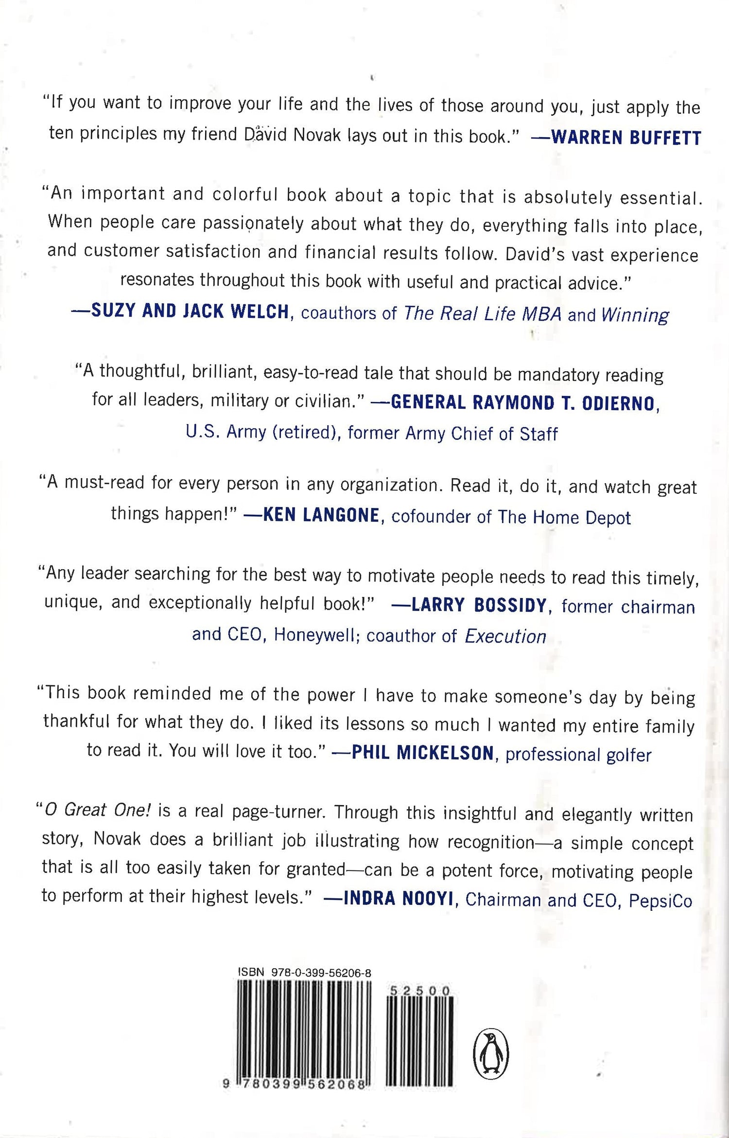 Rather than explain the power of recognition in a typical business book, acclaimed CEO David Novak wrote a fun story that draws on his real-world experiences at Pepsi and Yum! Brands, as well as his personal life.When was the last time you told your colleagues how much you value them? It sounds like a trivial thing in the middle of a busy work day. But as Novak discovered during his years as a hard charging executive, there's nothing trivial about recognition. It can make a life-or-death difference to any organization, when people see that someone important really notices and appreciates their contributions. The story of O Great One! opens when Jeff Johnson becomes the third-generation CEO of his family business, after the sudden death of his father. The Happy Face Toy Company had many hits in the 1950s and 60s, including Crazy Paste, but its results have been declining for more than a decade. The board has given Jeff just one year to turn the business around, or else they'll have to sell it to the highest bidder. As Jeff races to save his family's legacy by getting the company back on track, he meets downtrodden factory workers and an uninspired executive team. Then a birthday gift from his grandson gives Jeff an important insight into why Happy Face lost its culture of innovation and excitement, along with its profitability. He comes up with an idea that seems crazy? But is it crazy enough to work? Whether you're trying to lead a small department, a Fortune 500 company, a non-profit, or your own family, the story and lessons of O Great One! can help you make everyone around you happier and more effective. *This book may have a reminder mark