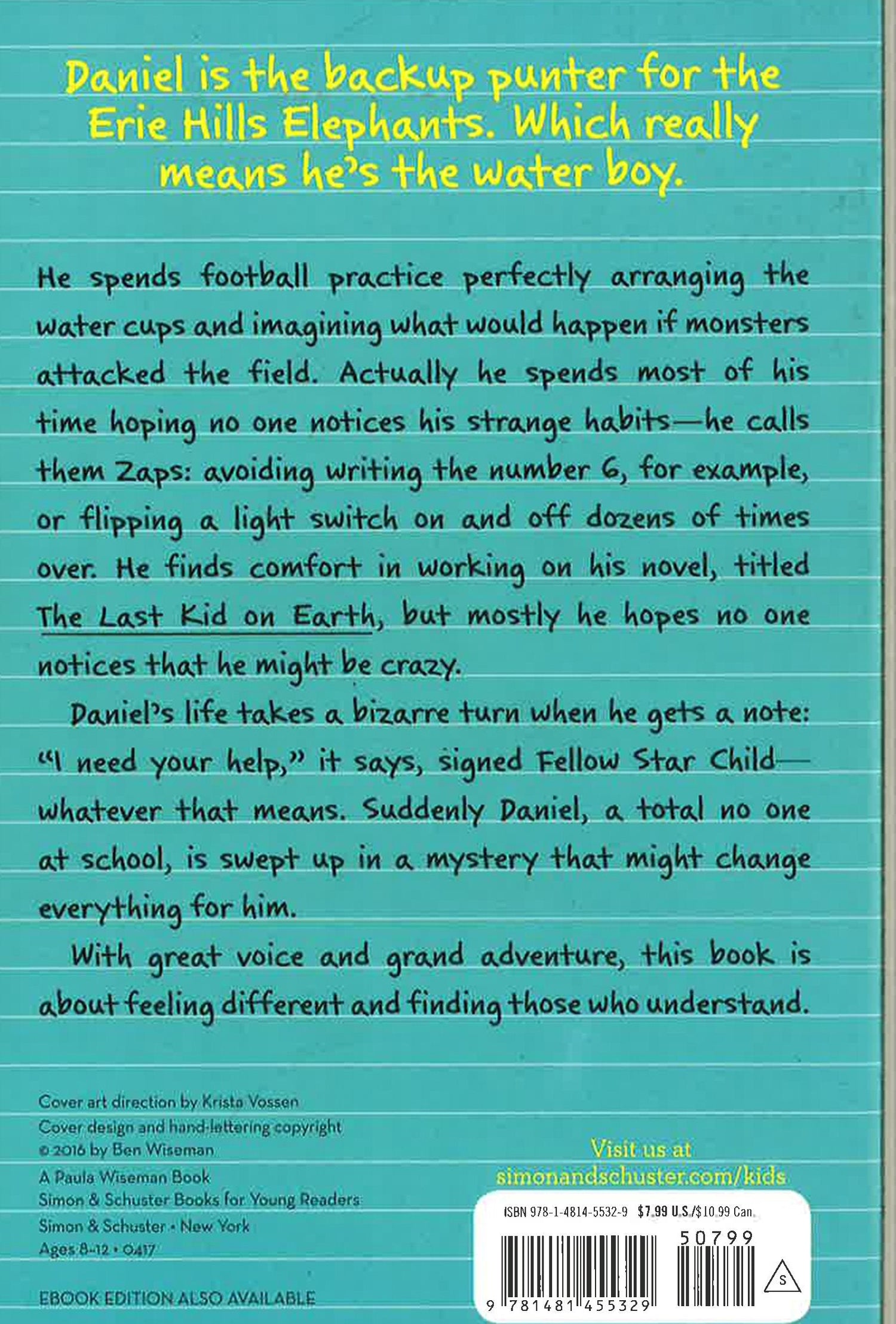 From the author of Incredible Space Raiders from Space! comes a brand-new coming-of-age story about a boy whose life revolves around hiding his obsessive compulsive disorder - until he gets a mysterious note that changes everything.Daniel is the back-up punter for the Erie Hills Elephants. Which really means he’s the water boy. He spends football practice perfectly arranging water cups - and hoping no one notices. Actually, he spends most of his time hoping no one notices his strange habits - he calls them Zaps: avoiding writing the number four, for example, or flipping a light switch on and off dozens of times over. He hopes no one notices that he’s crazy, especially his best friend Max, and Raya, the prettiest girl in school. His life gets weirder when another girl at school, who is unkindly nicknamed Psycho Sara, notices him for the first time. She doesn’t just notice him: she seems to peer through him.Then Daniel gets a note: “I need your help,” it says, signed, Fellow Star Child - whatever that means. And suddenly Daniel, a total no one at school, is swept up in a mystery that might change everything for him.With great voice and grand adventure, this book is about feeling different and finding those who understand.