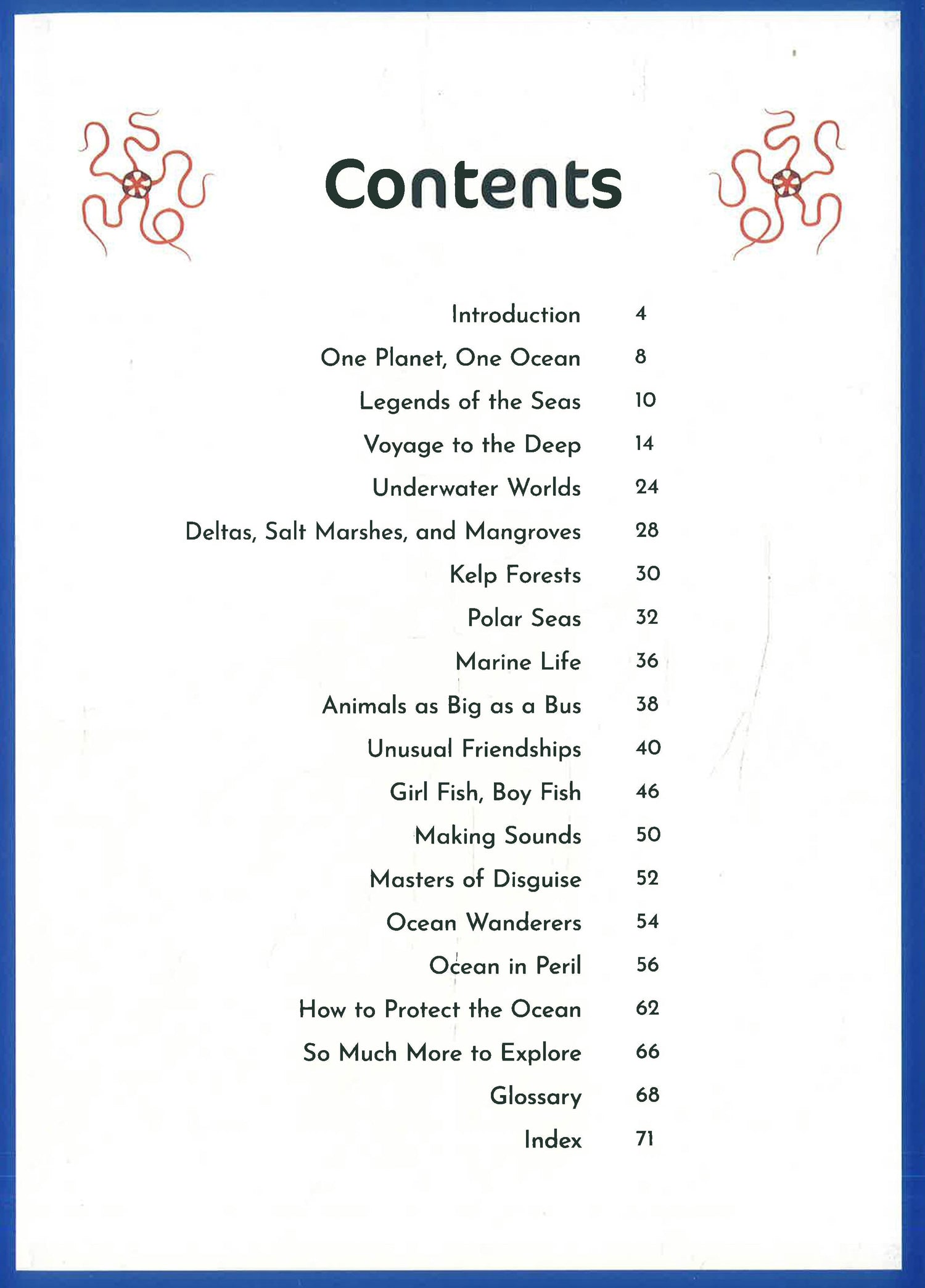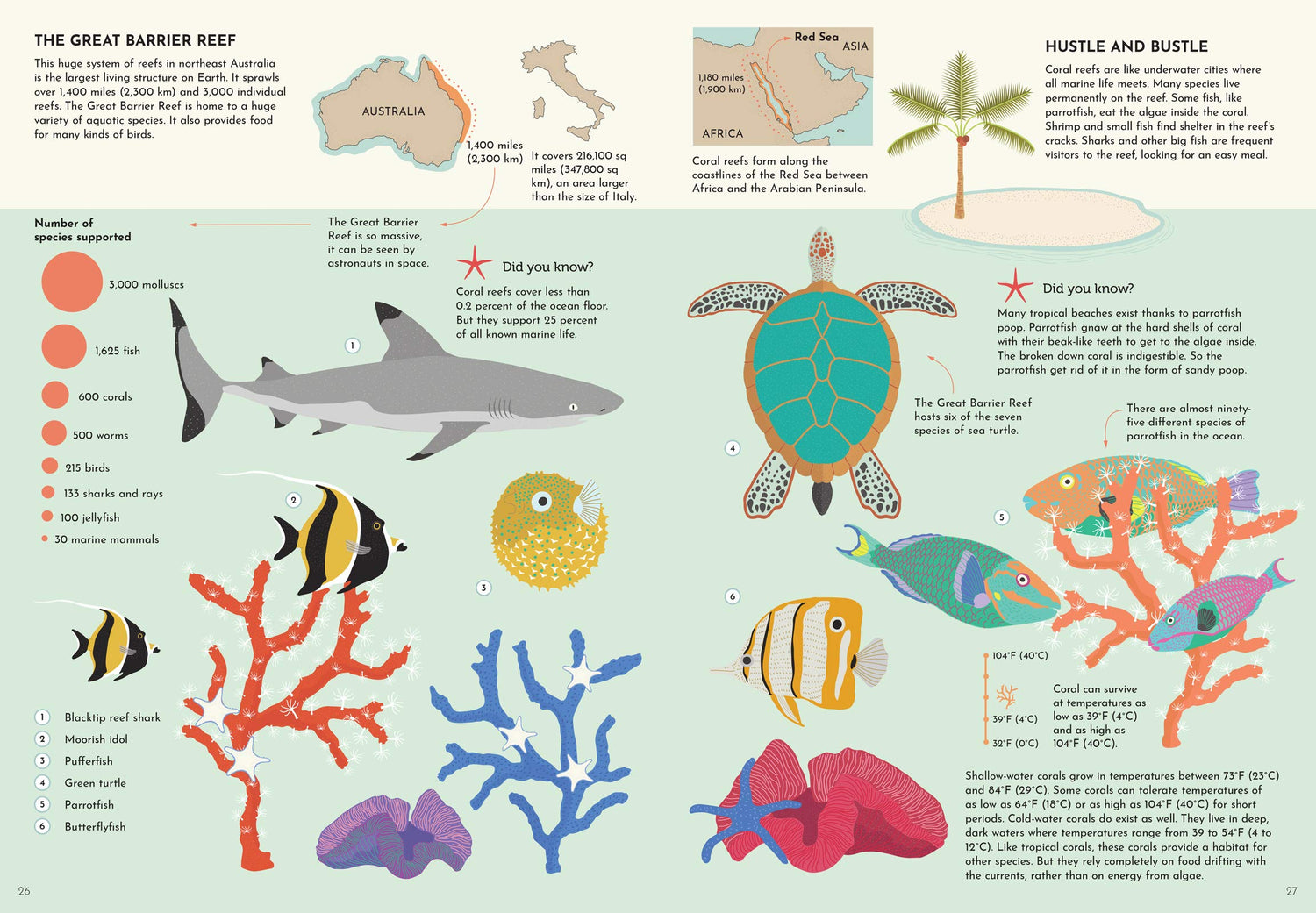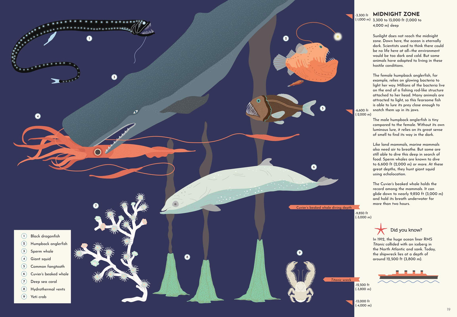 Ocean: Secrets of the Deep is jam-packed with over 200 stylish illustrations, infographics and surprising facts about the world's marine life. First, readers are taken on a journey from the water's surface to the deepest, darkest depths of the oceans. Then, information-packed pages about marine life follow, before a final section about how to protect our ocean. At the end of the book, an illustrated world map and glossary of sea-related terms provide additional supporting information.