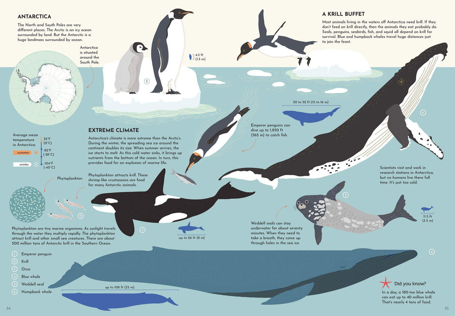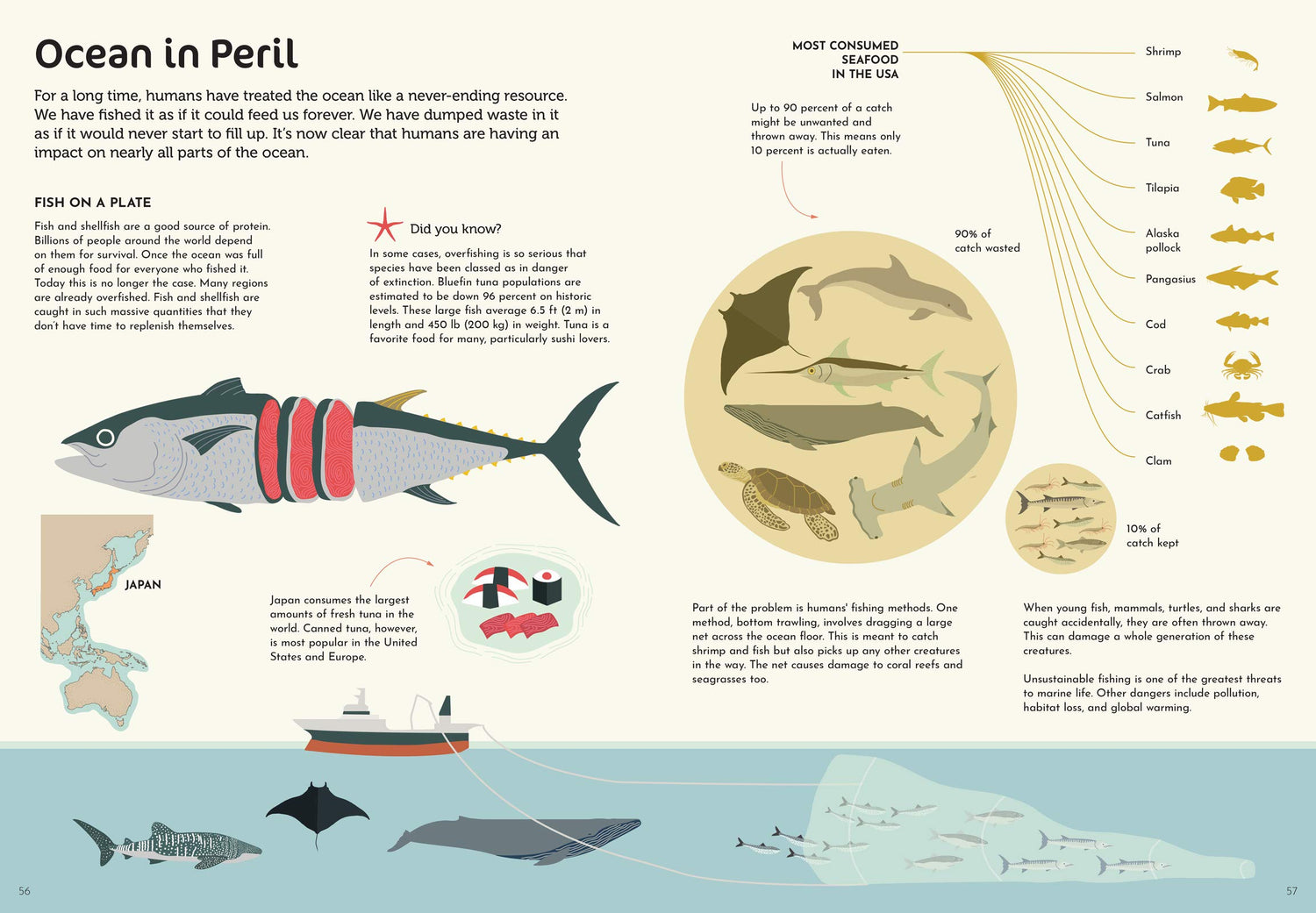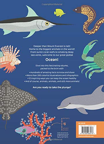 In this book you can dive underwater and discover menacing sharks, playful dolphins, clown fish, penguins, turtles, whales, shimmering jellyfish, a gargantuan giant squid and much much more! You can also find out about all the dangers to our ocean, including plastic pollution, climate change, and overfishing, and the ways you can help save our ocean and keep it healthy.