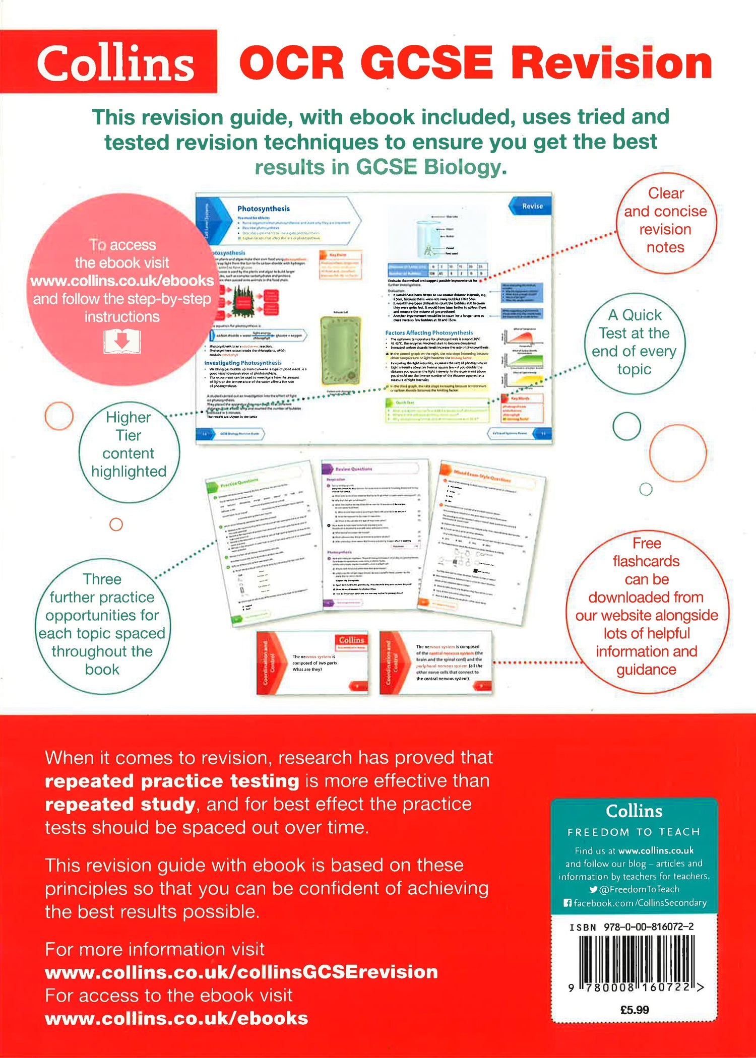 Exam Board: OCR Gateway Level: GCSE Grade 9-1 Subject: Biology First Teaching: September 2016, First Exams: June 2018 Suitable for the 2020 exams Revision that Sticks! Collins OCR Gateway GCSE 9-1 Biology Revision Guide uses a revision method that really works: repeated practice throughout. This revision guide contains clear and concise revision notes for every topic covered in the curriculum, plus five practice opportunities to ensure the best results. Includes: * quick tests to check understanding * end-of-topic practice questions * topic review questions later in the book * mixed practice questions at the end of the book * free Q&A flashcards to download online * an ebook version of the revision guide