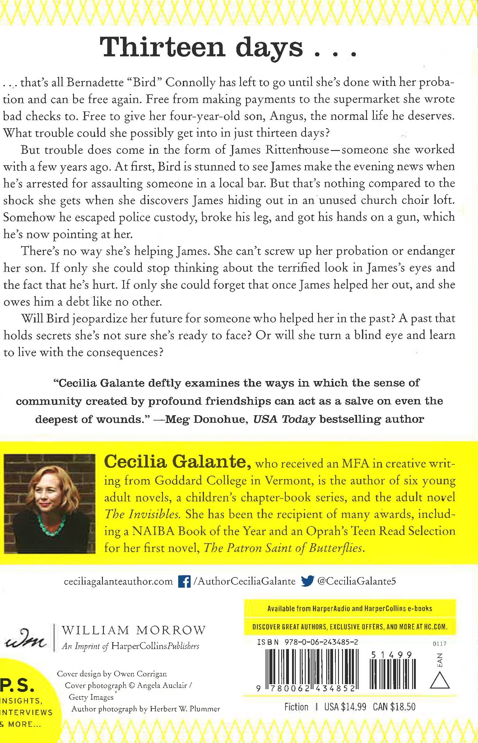 Thirteen days. That’s all Bernadette, “Bird,” Sincavage has left to go until she’s done with her probation and can be free again. Free from making payments to the supermarket she wrote bad checks to. Free from living at home with her overzealous mother who’s constantly nagging her about attending church again. Free to give her four-year-old son, Angus, the normal life he deserves. Her impending freedom and move to Moon Lake, where she’s plunked down a deposit on a brand new apartment, is so close she can almost taste it. What trouble could she possibly get into in just thirteen days?But trouble does follow in the form of James Rittenhouse - someone she worked with a few years ago. At first, Bird is stunned to see James make the evening news when he’s arrested for assaulting someone in a local bar. But that’s nothing compared to the shock she gets when she discovers James hiding out in an abandoned church choir loft. Somehow he escaped police custody, broke his leg, and got his hand on a gun, which he’s now pointing at her.Although Bird doesn’t tell anyone she saw James, there’s no way she’s helping him. She can’t screw up her probation or her second chance for a new future. And she has her son’s welfare to think about. Still. If only she could stop thinking about the terrified look in James’ eyes and the fact that he’s hurt. If only she could forget that once, long ago, James helped her out, and she owes him a debt like no other. Will Bird jeopardize her future for someone who helped her out in the past? A past that holds secrets she’s not quite sure she’s ready to face? Or will she turn a blind eye and learn to live with the consequences?