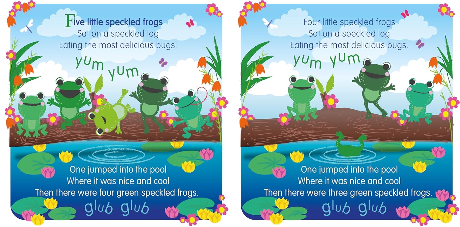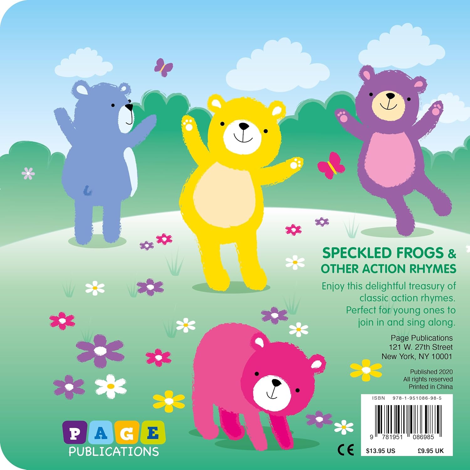 "Speckled Frogs & Other Action Rhymes" is an engaging padded board book that brings classic action rhymes to life with vibrant illustrations and interactive elements. This delightful collection features beloved rhymes such as "Five Little Speckled Frogs" along with other fun action songs that encourage children to move, sing, and play along. Each page showcases colorful illustrations and simple, rhythmic text that make the rhymes easy to follow and perform. The soft padded cover and sturdy pages are perfect for little hands, making this book a wonderful addition to any child's early learning library. "Speckled Frogs & Other Action Rhymes" promotes early literacy, coordination, and a love for music and movement.