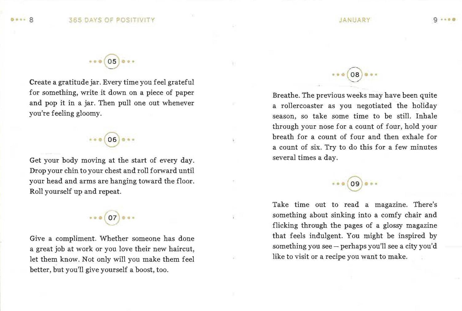 This book is a practical guide to finding happiness, featuring 365 tips and quotes to help the reader foster optimism and invite positivity into their life.