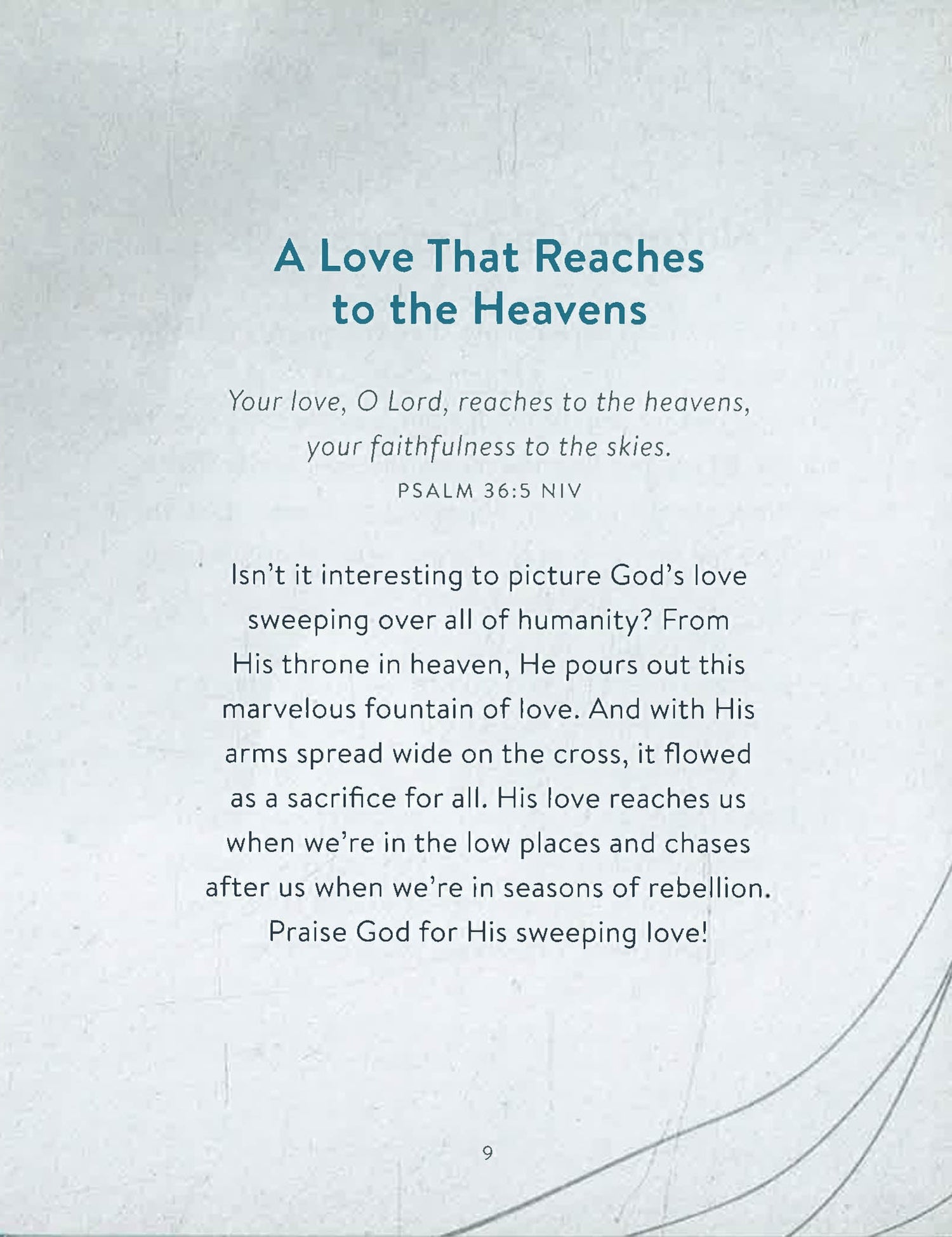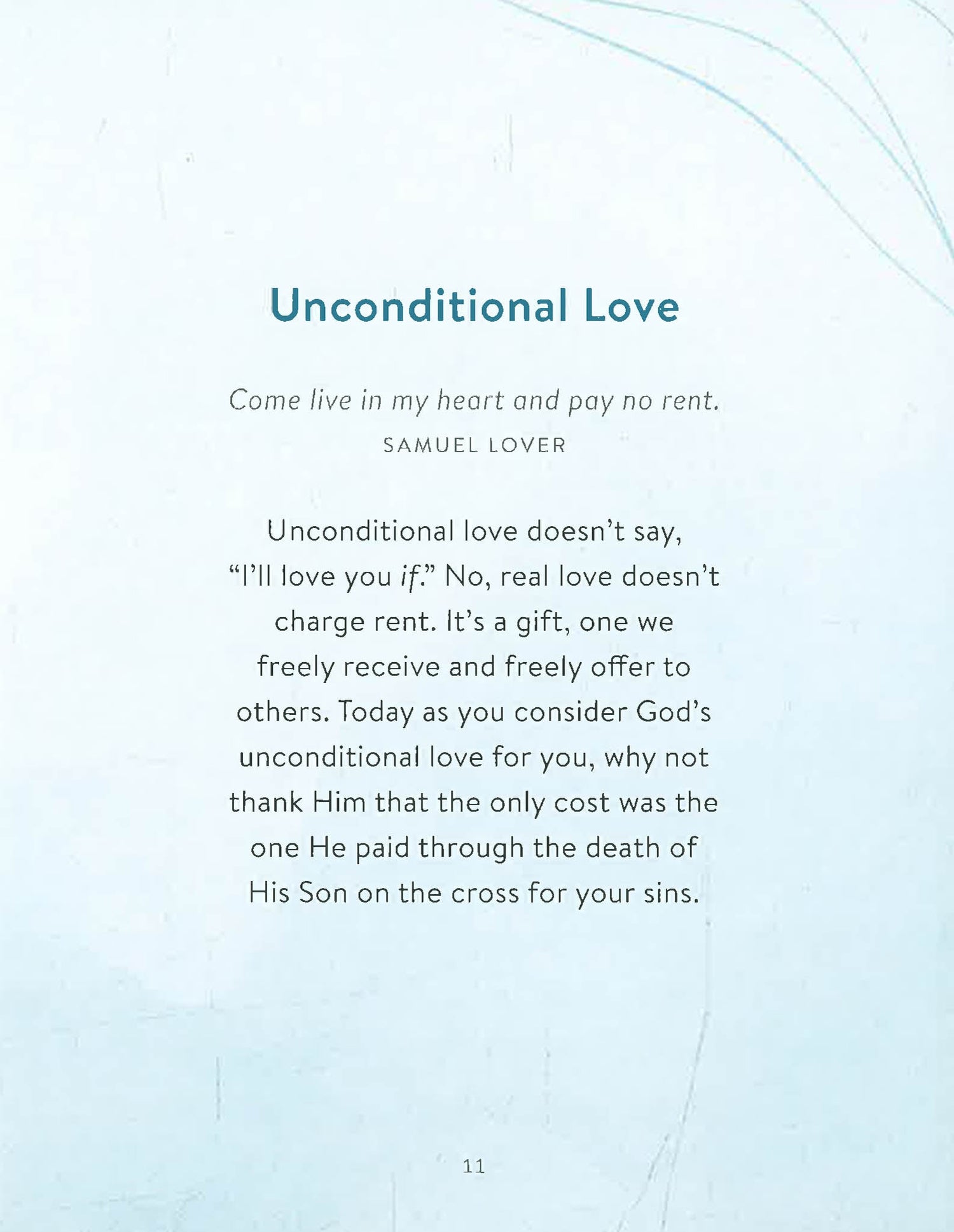 These are the moments that awaken your soul to the undeniable love of her heavenly Father--the One who sees and meets your every need. Each of the 200 devotional readings in this lovely collection will speak to your heart as you experience the unchanging and overflowing love of God. Every inspiring word will draw you more closely to the Master Creator as you envelop your soul in the perpetual love found only in His Word.