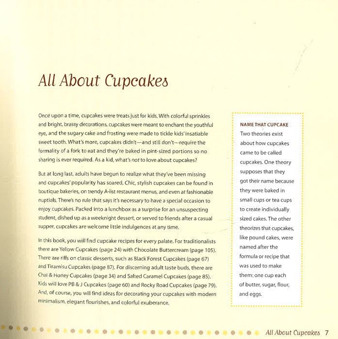 In these pages you'll find 30 gorgeous photos and over 60 tempting recipes for cupcakes, fillings, and frostings. You'll also find helpful tips, detailed decorating ideas, and lots of inspiration for baking your own delightful cupcakes.
