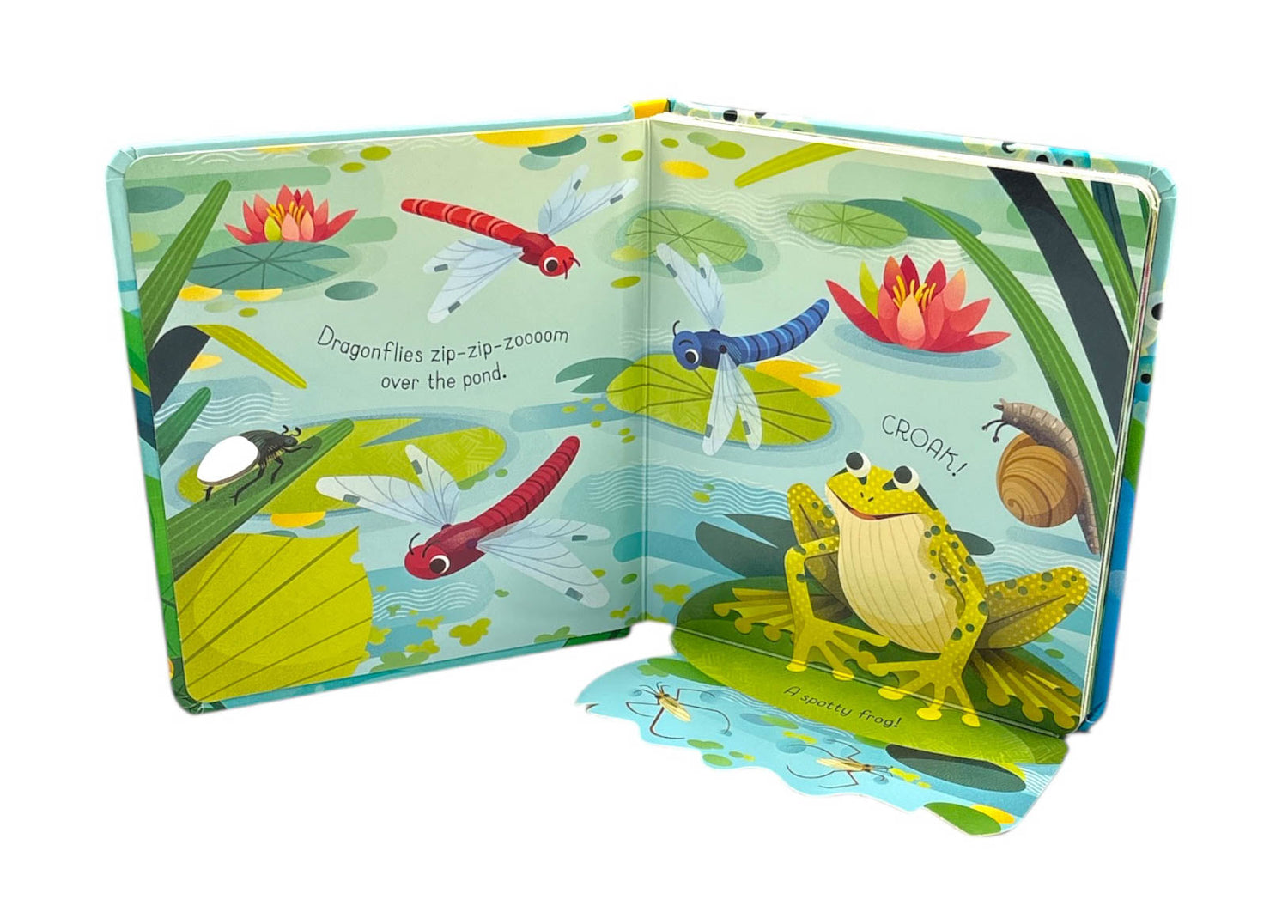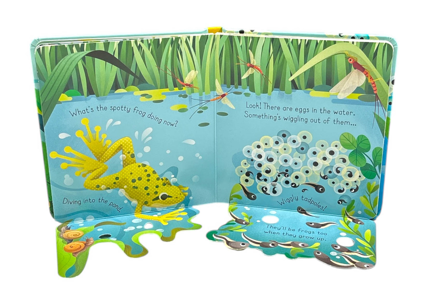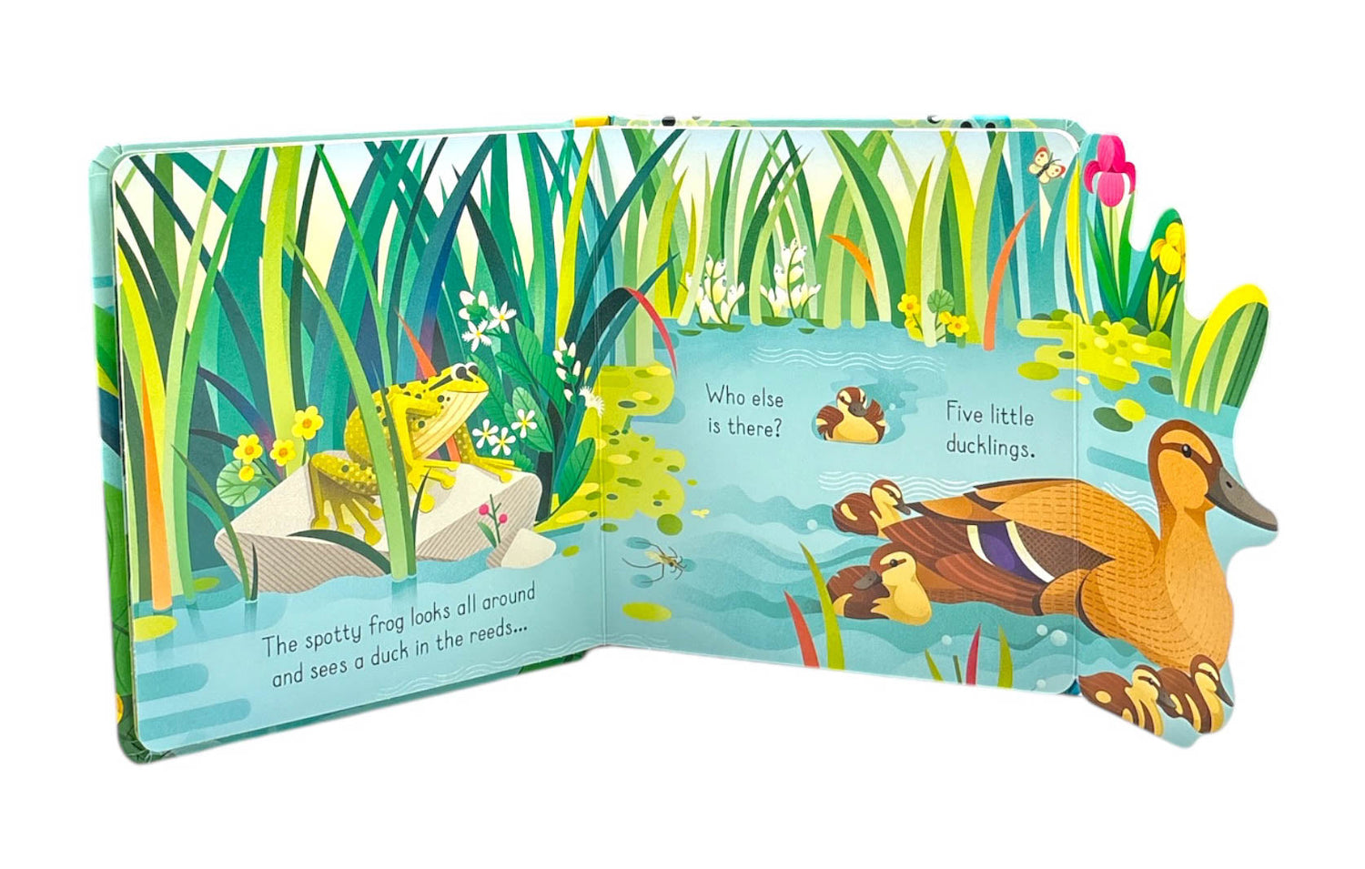 Where has the spotty frog gone now? Very little children will love lifting the flaps to find the frog and follow her around the pond to meet all the other animals. Discover a speedy fish, a hungry heron, five fluffy ducklings and lots of wiggly tadpoles, as the spotty frog hops, dives and swims around the pond.