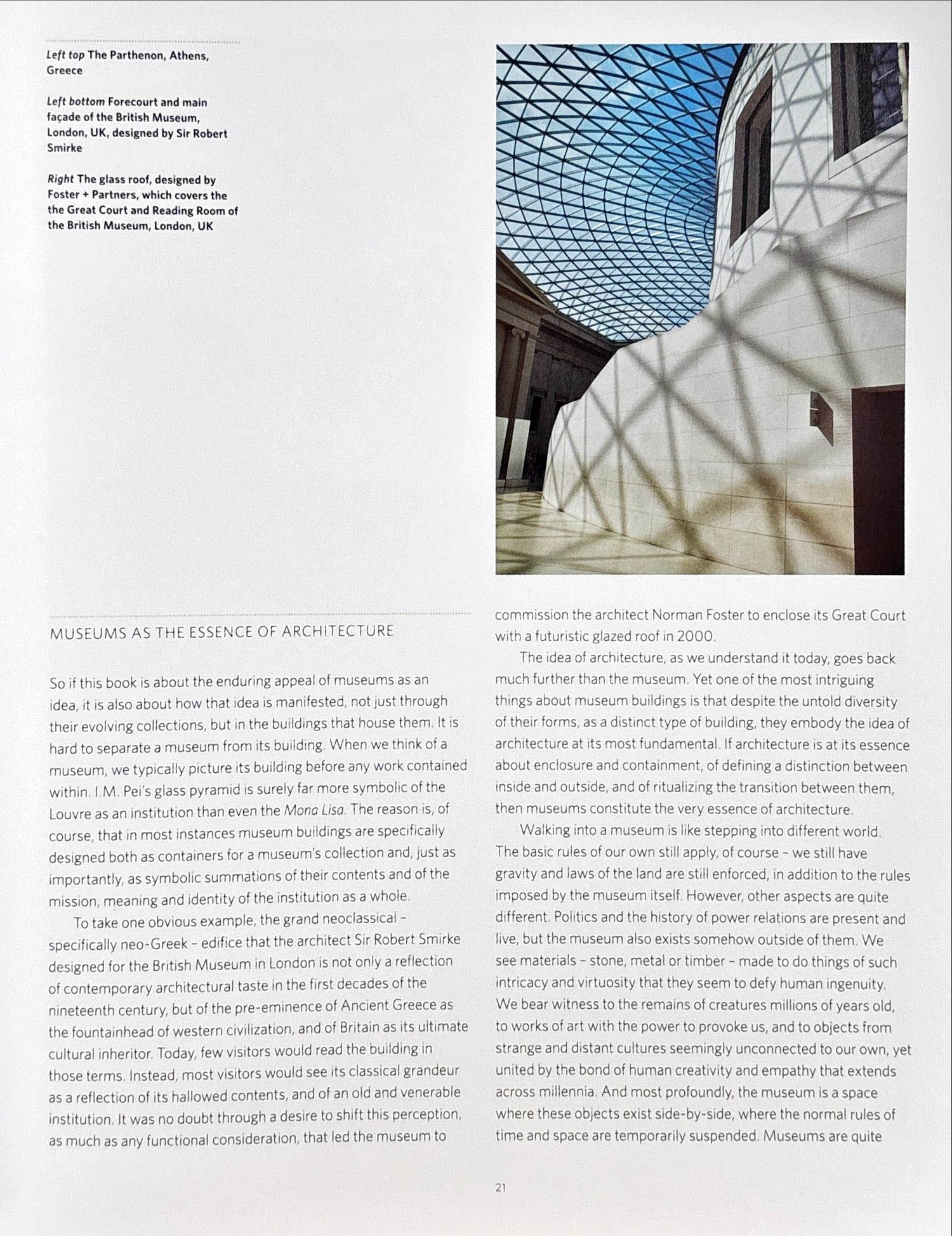 Also outlined are the motivations of the architects, curators and patrons who have shaped how we experience the modern museum, a cast that includes names such as King George II, Napoleon, Henry Clay Frick, Peggy Guggenheim, Andrew Carnegie, Alfred Barr, Frank Lloyd Wright, Le Corbusier, Frank Gehry, Richard Rogers, Nicholas Serota and Zaha Hadid.