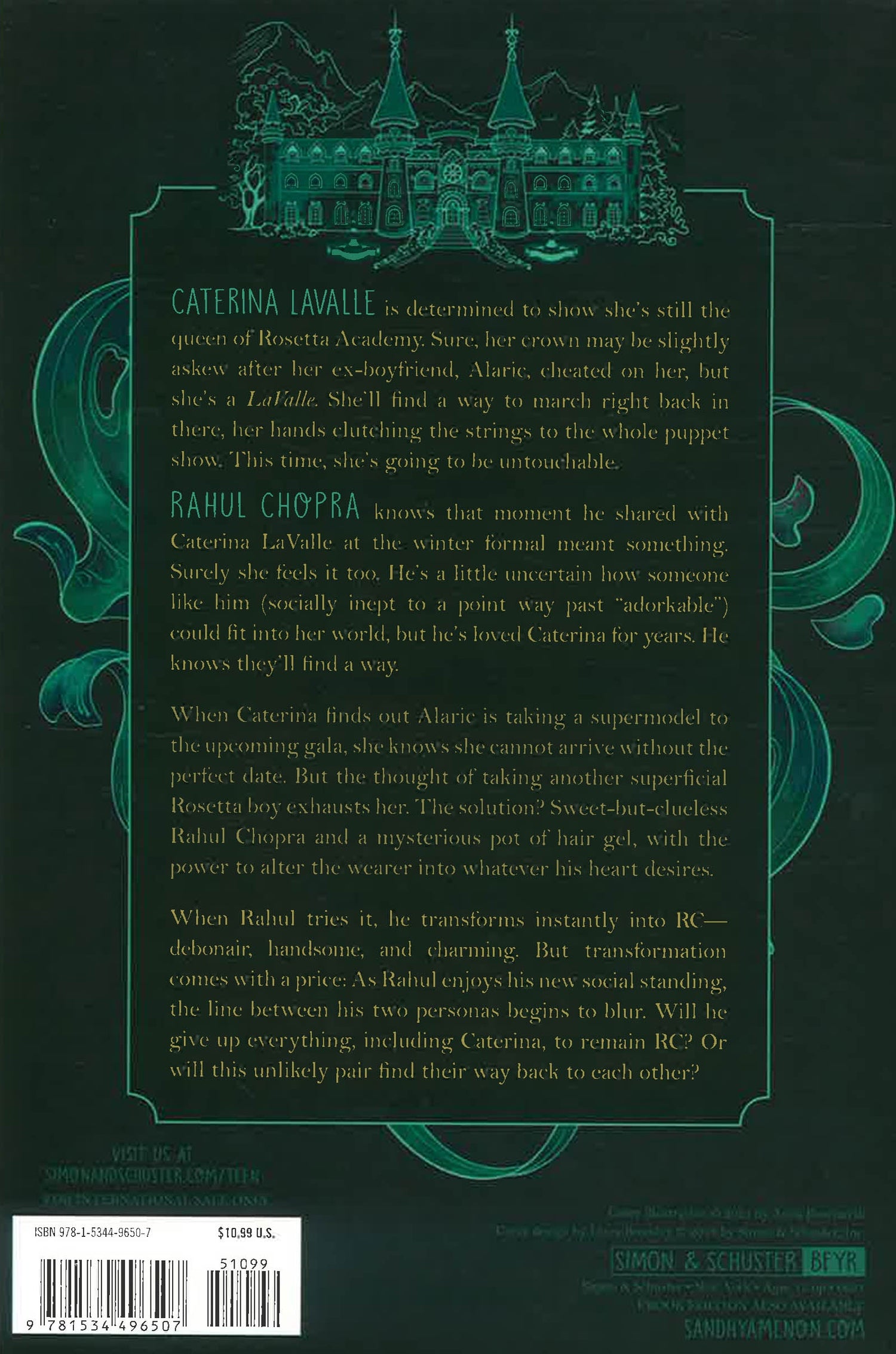 When Caterina finds out Alaric is taking a supermodel to the upcoming gala, she knows she cannot arrive without the perfect date. But the thought of taking another superficial St. R's boy exhausts her. The solution? Sweet-but-clueless Rahul Chopra and a mysterious pot of hair gel with the power to alter the wearer into whatever his heart desires.