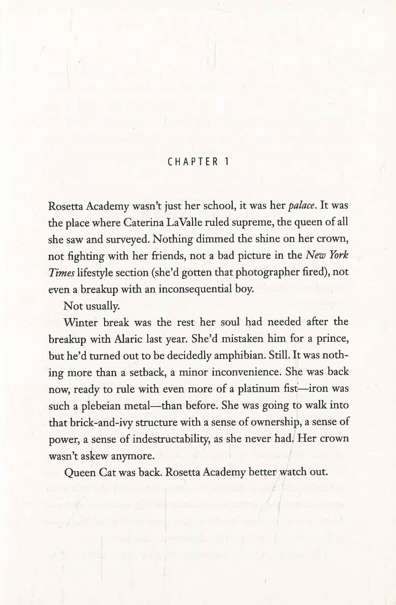 Caterina LaValle is determined to show she's still the queen of St. Rosetta's Academy. Sure, her crown may be slightly askew after her ex-boyfriend, Alaric, cheated on her, but she's a LaValle. She'll find a way to march right back in there, her hands clutching the strings to the whole puppet show. This time, she's going to be untouchable.