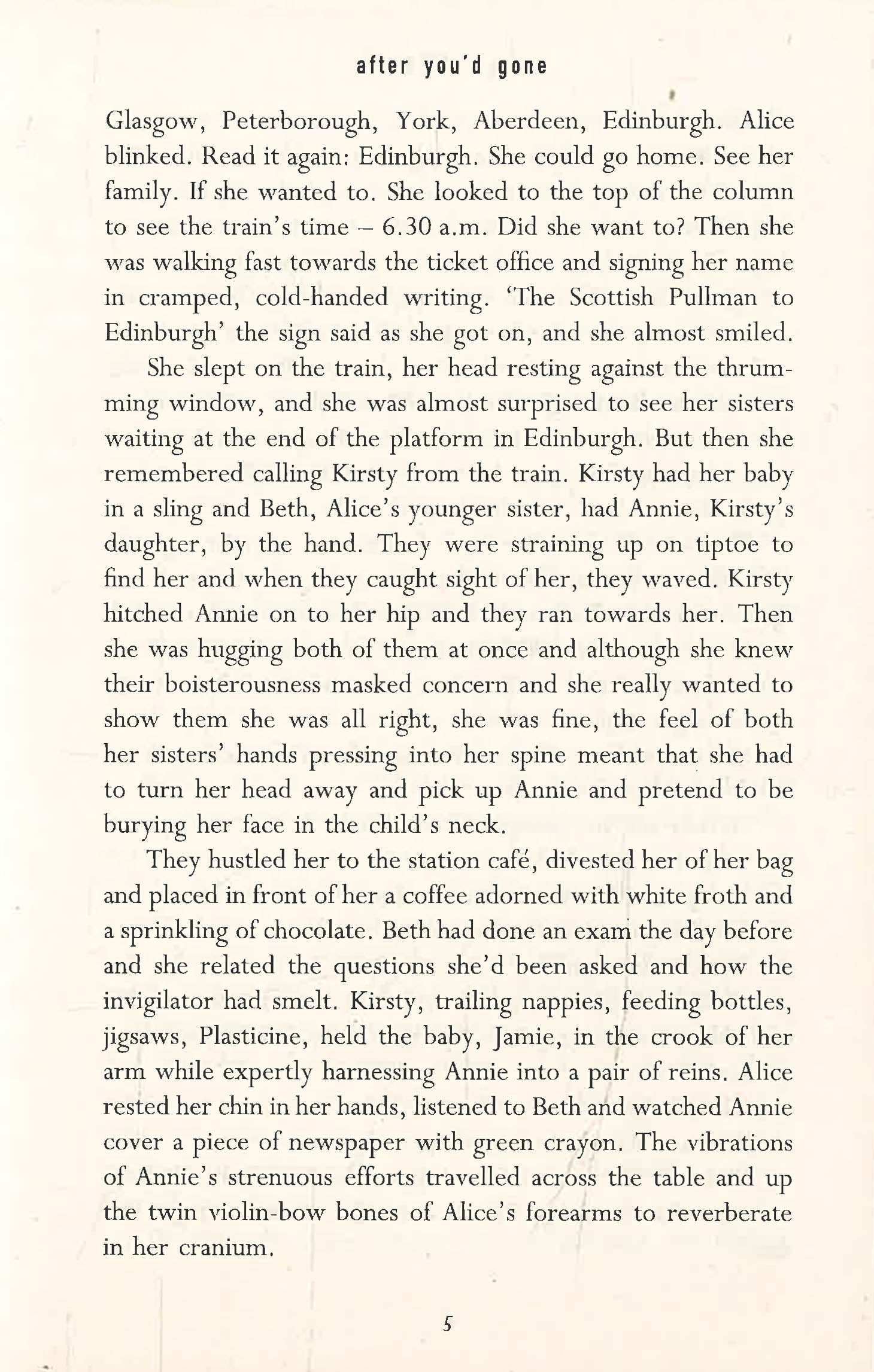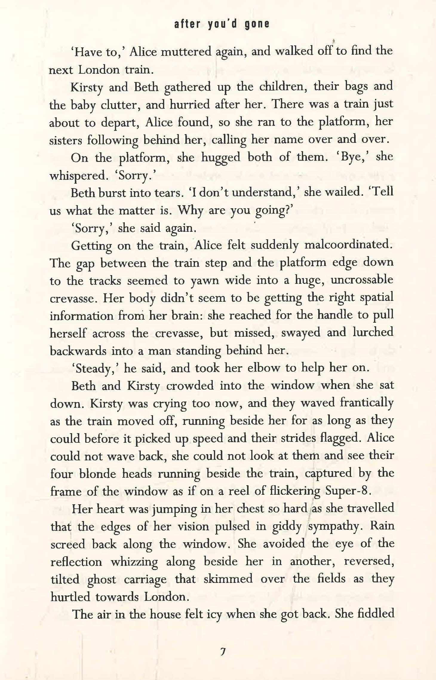 AFTER YOU'D GONE follows Alice's mental journey through her own past, after a traffic accident has left her in a coma. A love story that is also a story of absence, and of how our choices can reverberate through the generations, it slowly draws us closer to a dark secret at a family's heart.