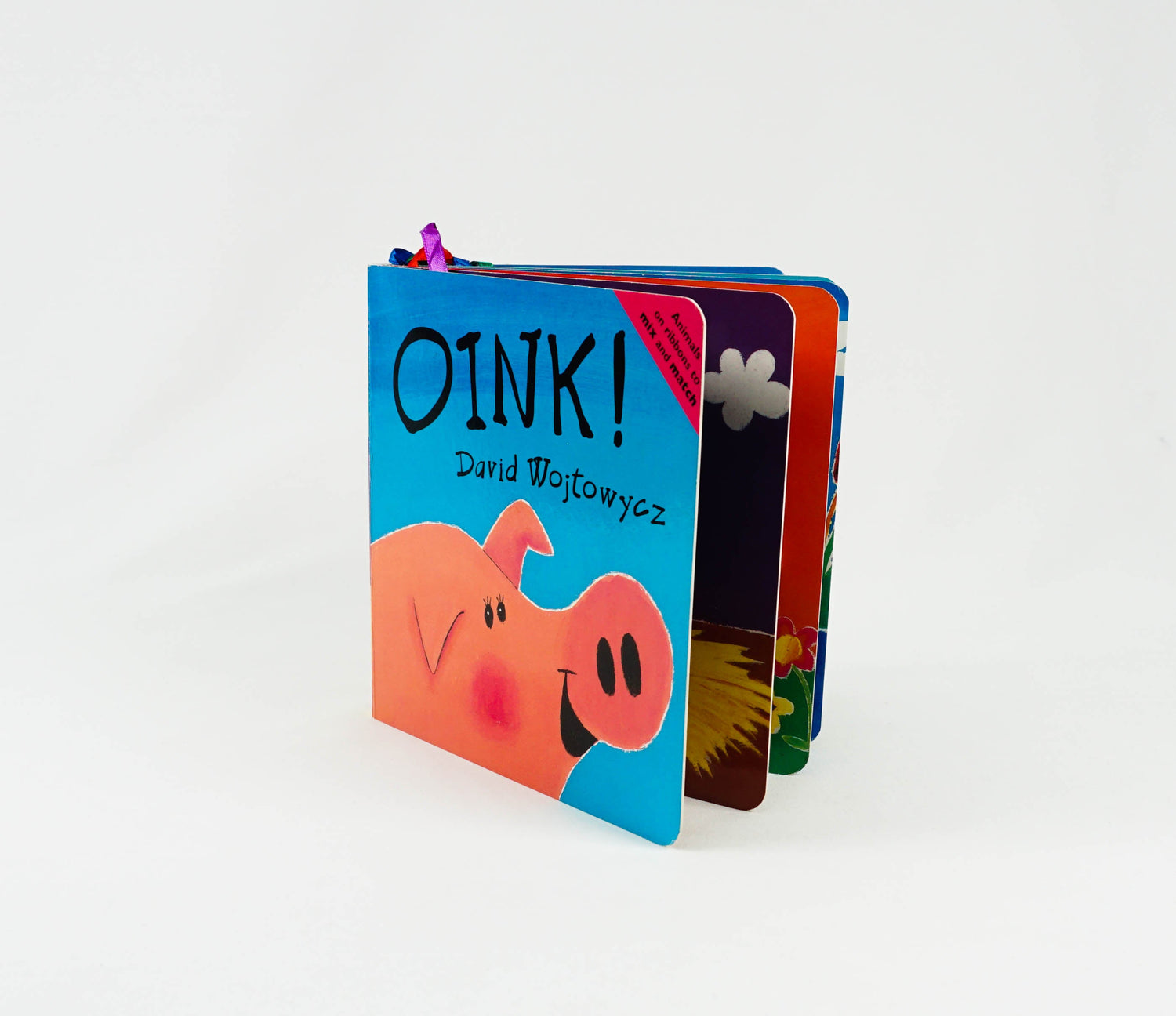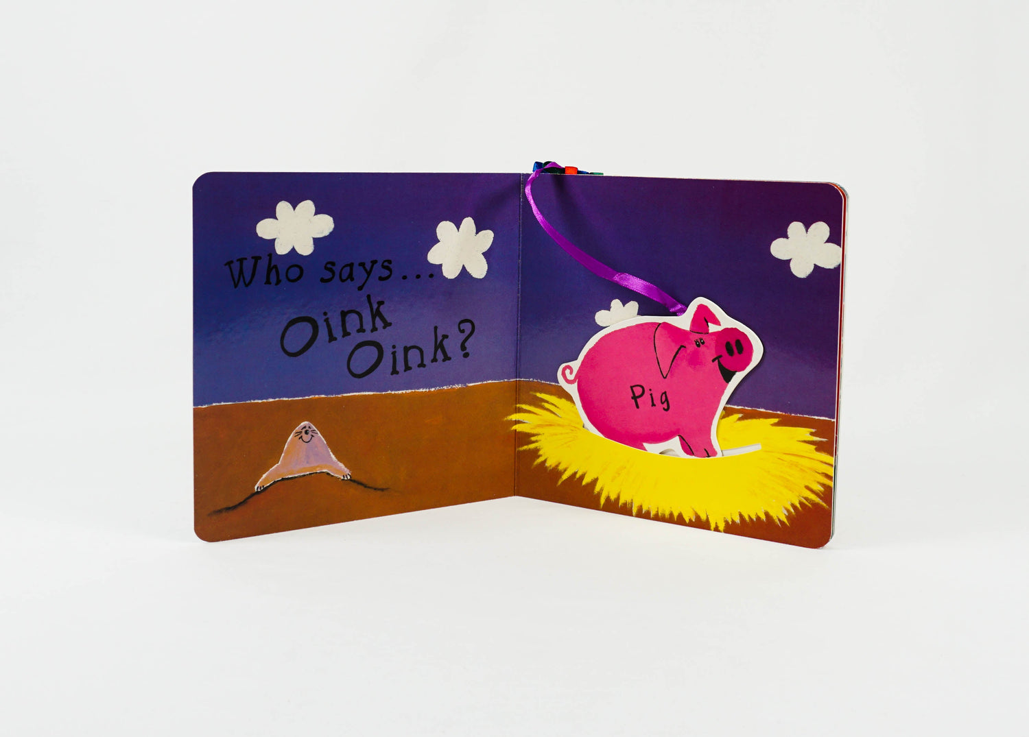 Two colourful board books each with four animals on ribbons to slot into the correct pages. Match each animal to its habitat in Roar! And each animal to its sound in Oink!, then muddle them up and start the game again! There are coloured ribbon clues to help you find the right page. This work is ideal for little hands.
