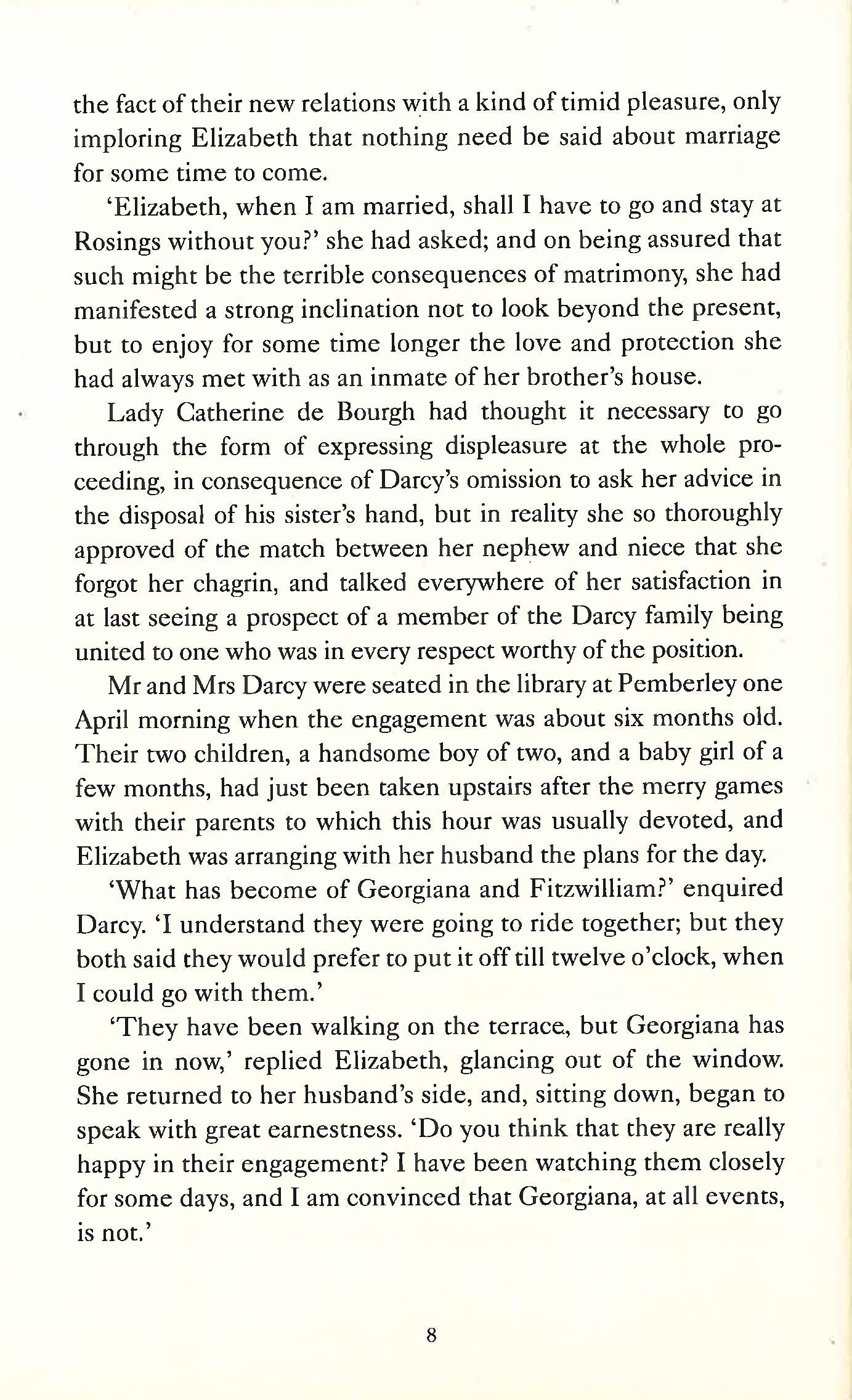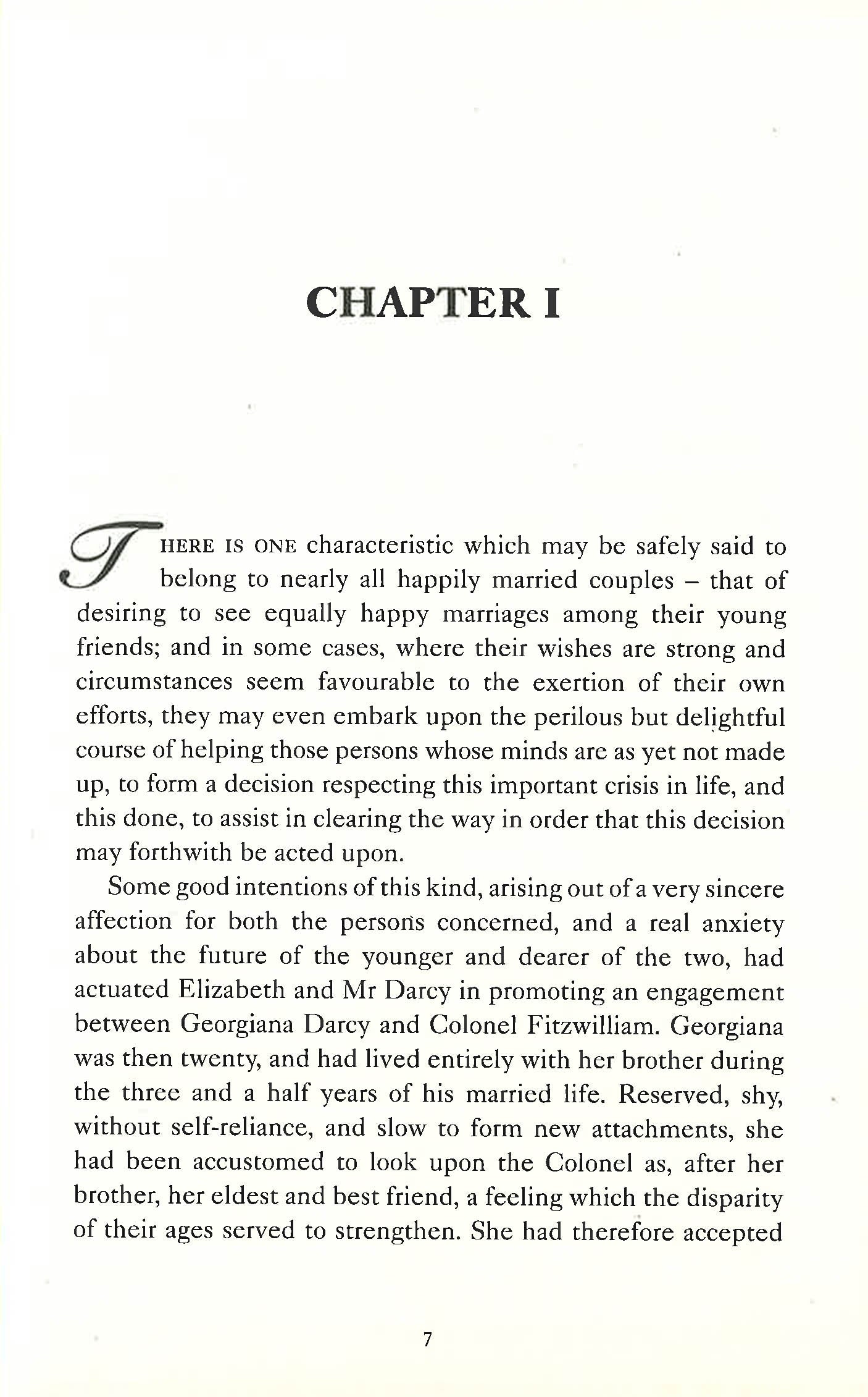 Taking in all of Jane Austen's preferred locations and backdrops, this very first Austen sequel takes us from London to Bath and, of course, to Pemberley. Picking up where "Pride and Prejudice" leaves off, Elizabeth and Mr. Darcy are happily married and the new bride has taken it upon herself to match-make for her single family and acquaintance--beginning with her new sister-in-law Georgiana and Colonel Fitzwilliam. Kitty Bennet too remains in the market for a husband, now that she has grown up and sobered up a little. Austen fans will be thrilled to see such a wide palette of characters making their appearances, with personalities from each of her six novels playing a role in clever combinations. The union between "Mansfield Park"'s Tom Bertram and" Northanger Abbey"'s Isabella Thorpe is a wonderful new romance to discover. Yet it is also lovely to encounter once again the familiar tender relationship between Emma and Mr. Knightley. Written in a style truly reminiscent of Austen's and making free use of her characters, Brinton's work is a must read for Austen fans.