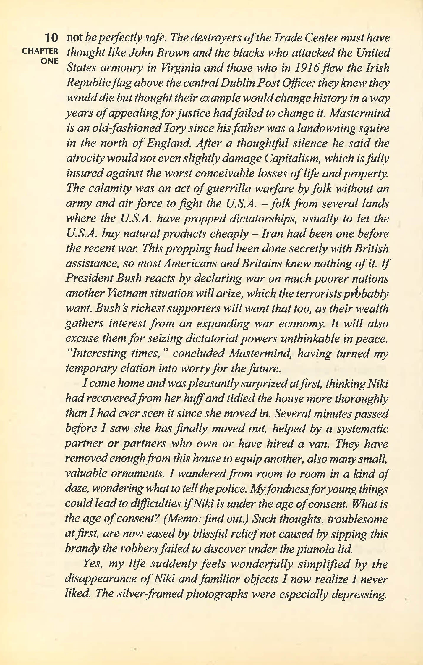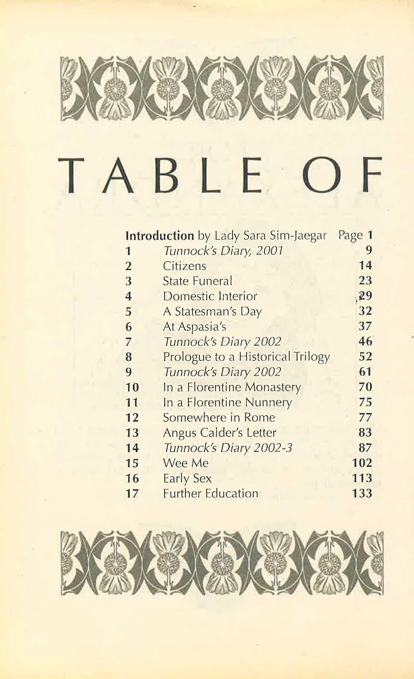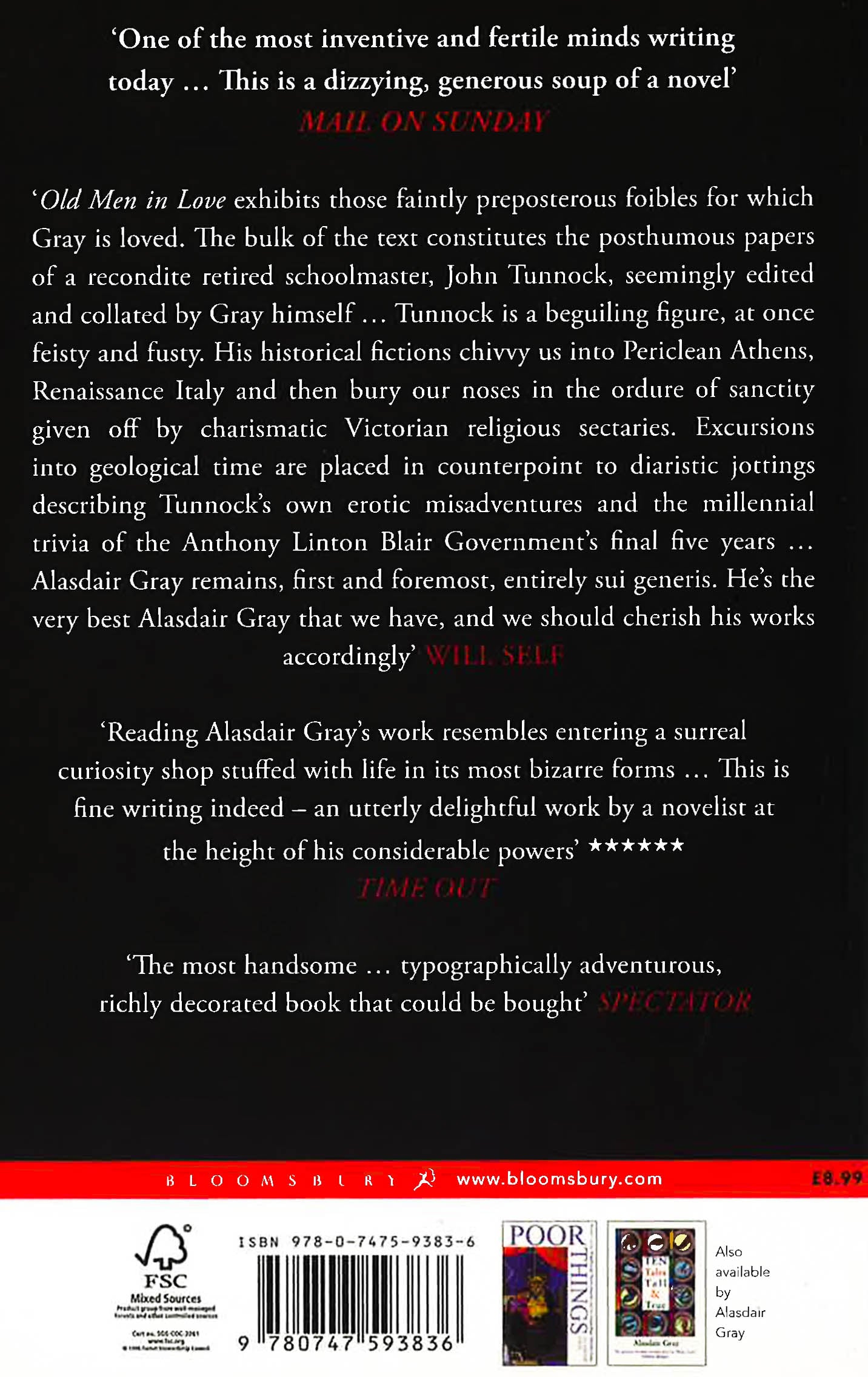 Men in Love, like The Arabian Nights, is about a storyteller whose stories contain other stories. As in Alasdair Gray's Lanark, 1982 Janine, Poor Things, and The Book of Prefaces, this one has many styles of narrative and location. Periclean Athens, Renaissance Florence, Victorian Somerset mingle with Britain under the New Labour Party, viewed from the West End of Glasgow. More than 50% is fact and the rest possible, but must be read to be believed.