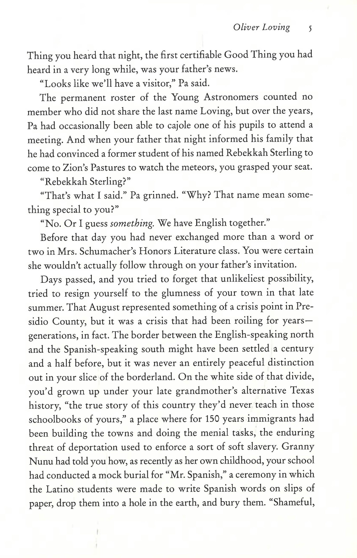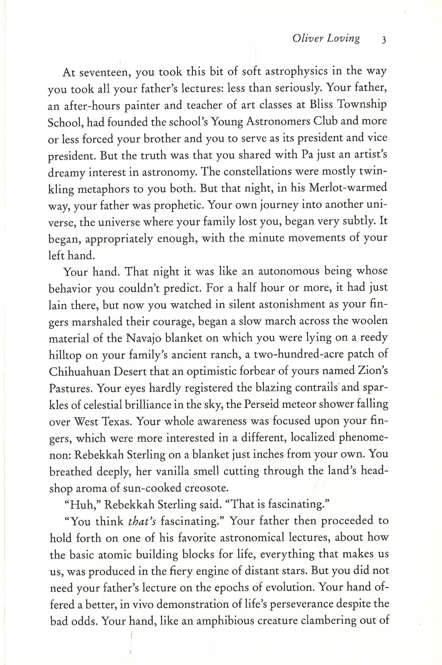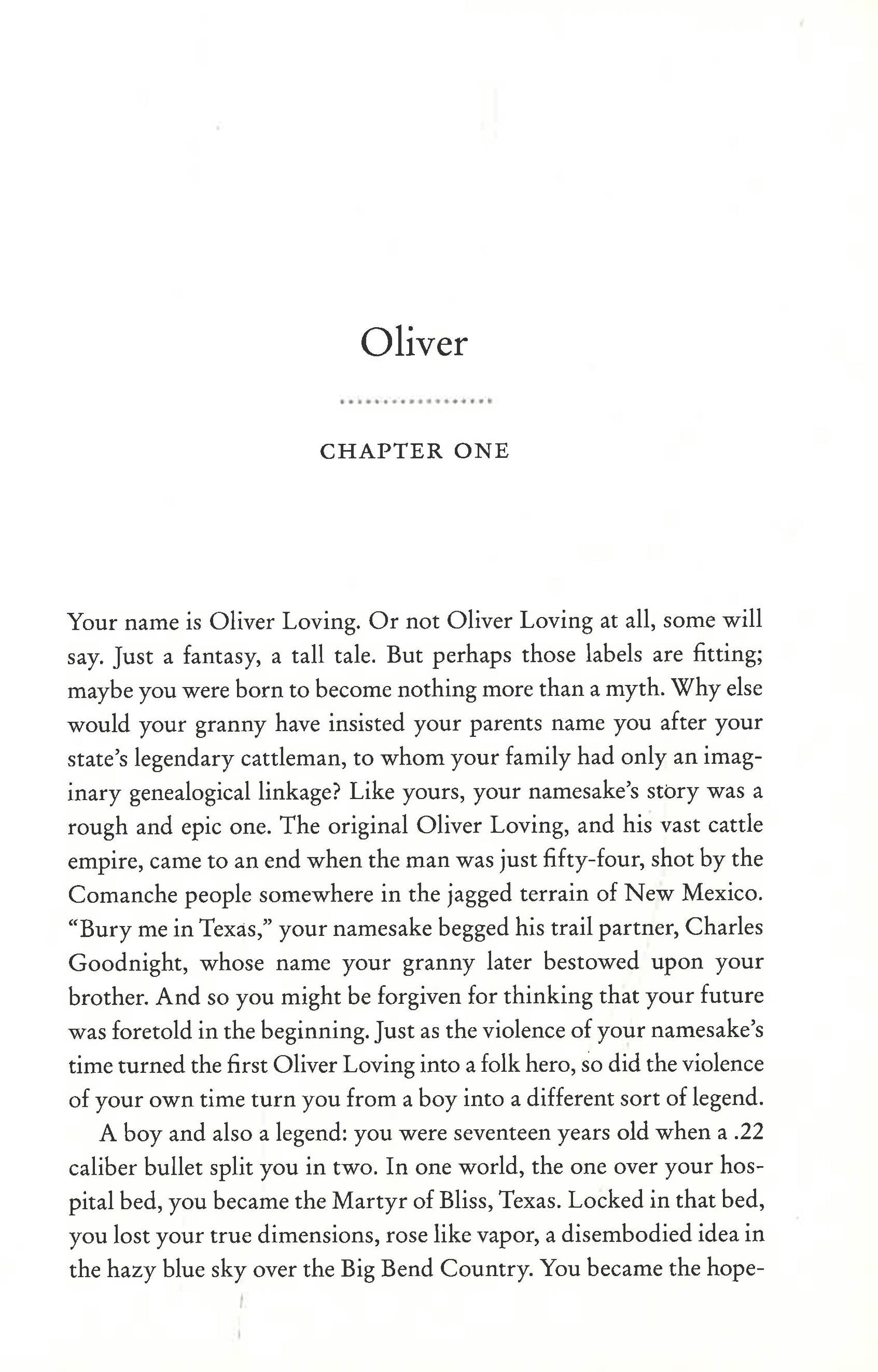 Nearly ten years later, Oliver Loving still lies wordless and paralyzed at Crockett State Assisted Care Facility, the fate of his mind unclear. Orbiting the stillpoint of Oliver's hospital bed is a family transformed: Oliver's mother, Eve, who keeps desperate vigil; Oliver's brother, Charlie, who has fled for New York City only to discover he cannot escape the gravity of his shattered family; Oliver's father, Jed, who tries to erase his memories with bourbon. And then there is Rebekkah Sterling, Oliver's teenage love, who left Texas long ago and still refuses to speak about her own part in that tragic night.