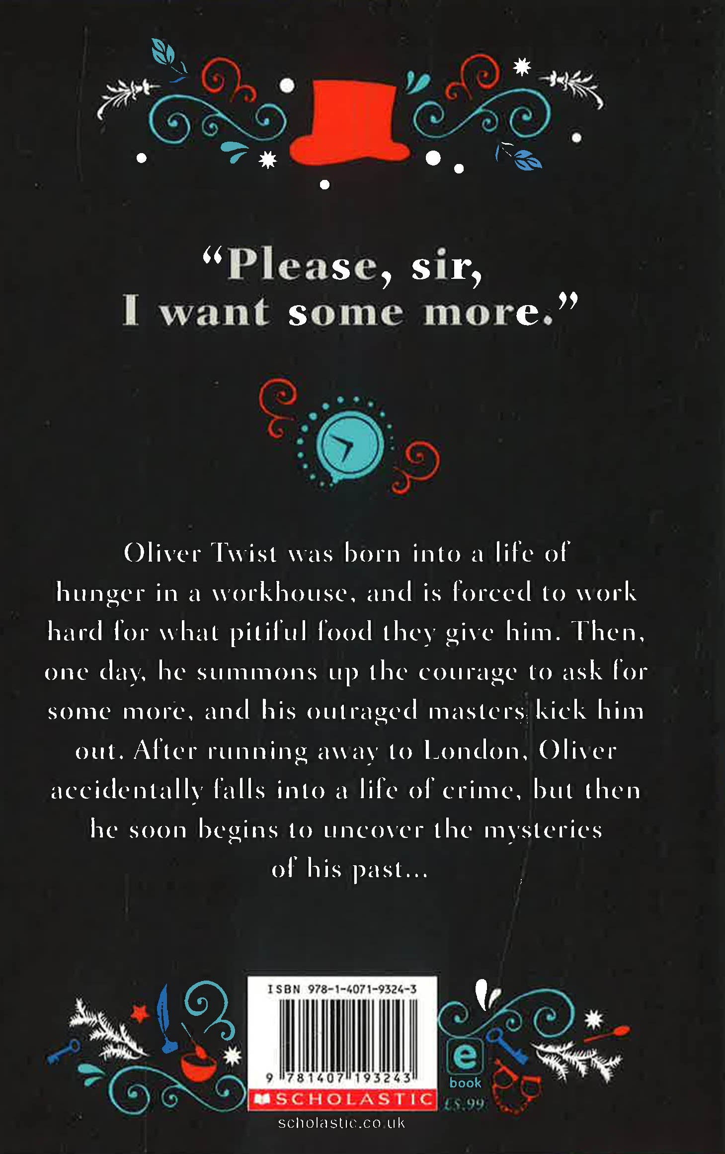 A beloved story, beautifully republished in this special, Scholastic Classics edition of Oliver Twist. "Please, sir, I want some more." When Oliver runs away from a workhouse and is taken in by a group of pickpockets and thieves, he finds himself plunged into a dark criminal underworld. Fagin, the Artful Dodger, the menacing Bill Sikes and kind-hearted Nancy all play their parts as Oliver struggles to survive and find his real family. A rich and unrivalled look at London poverty from arguably the greatest novelist of the Victorian era, Charles Dickens.