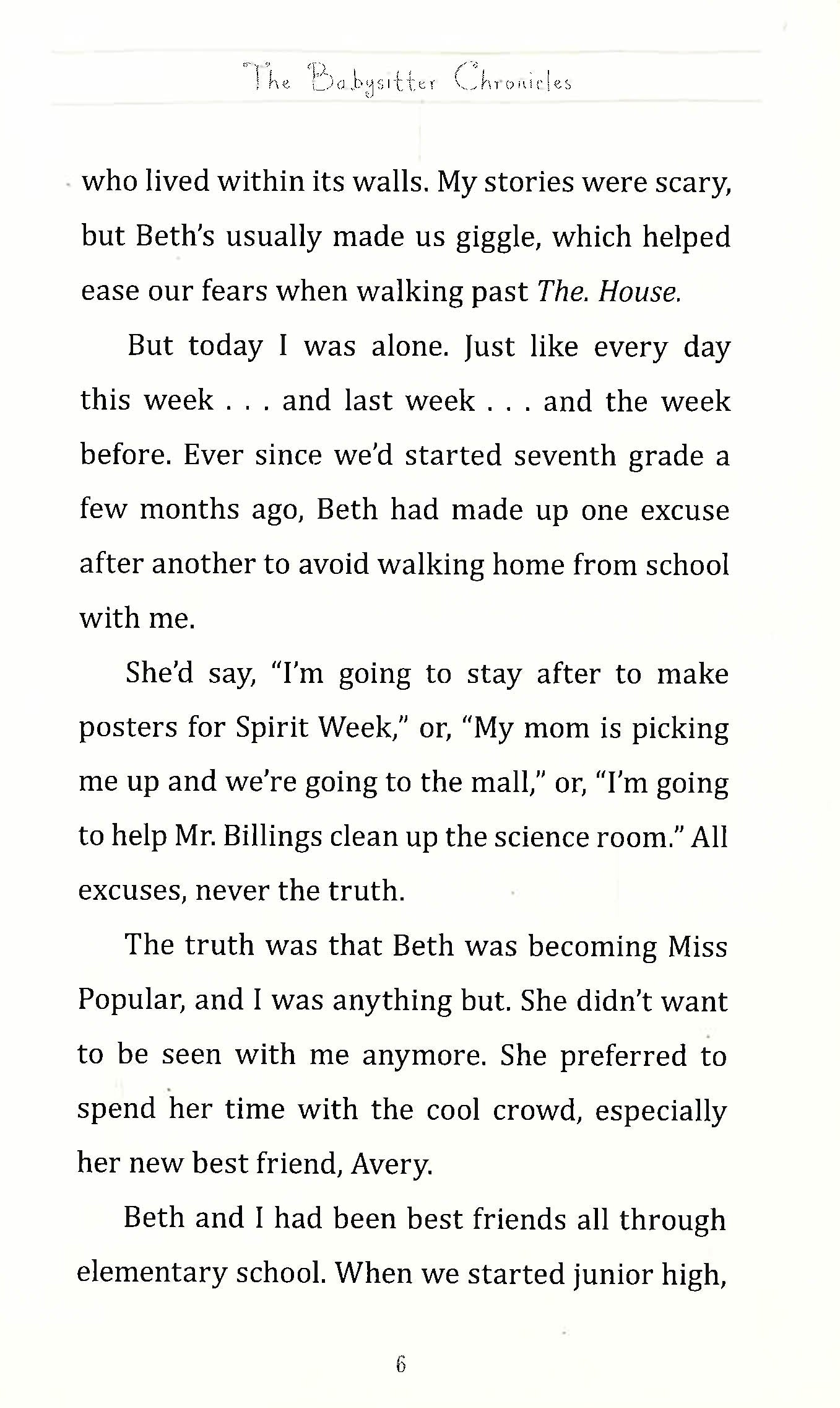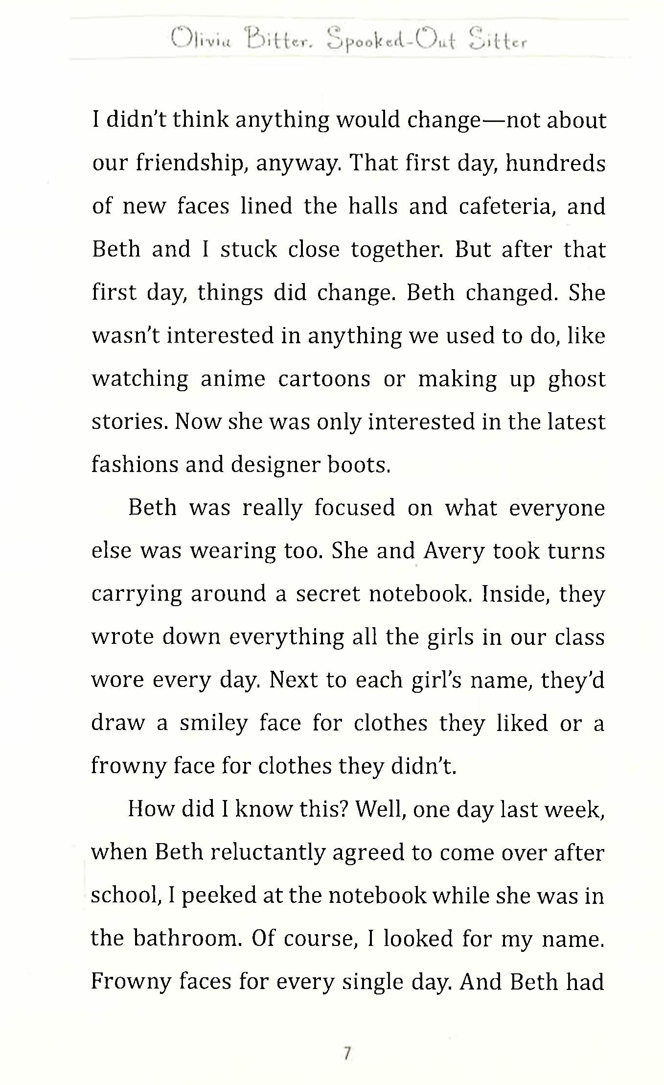 With the start of seventh grade, Olivia's longtime friend, Beth, has found new interests and new friends. Now Olivia thinks if she could just afford the type of clothes that Beth now wears, maybe their friendship could be restored. Motivated by a need for cash, Olivia agrees to babysit for a family of four who recently moved to the neighborhood haunted house. Now she's not sure what's scarier: hearing countless creepy sounds or being responsible for four kids!