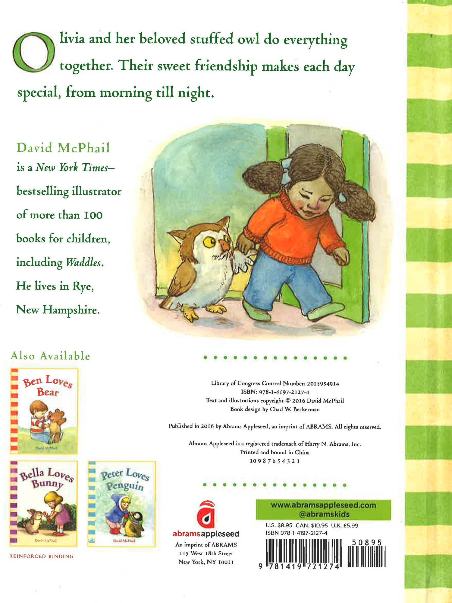 A companion to Ben Loves Bear, Bella Loves Bunny and Peter Loves Penguin, Olivia Loves Owl features a little girl named Olivia and her beloved stuffed owl. Olivia and Owl pick apples and frolic through piles of colourful leaves. After enjoying a perfect fall day, they go inside to wish upon a star and hoot at the moon. The youngest readers will relate to the loving bond between a little girl and her favorite stuffed animal and how this sweet friendship makes each day special.