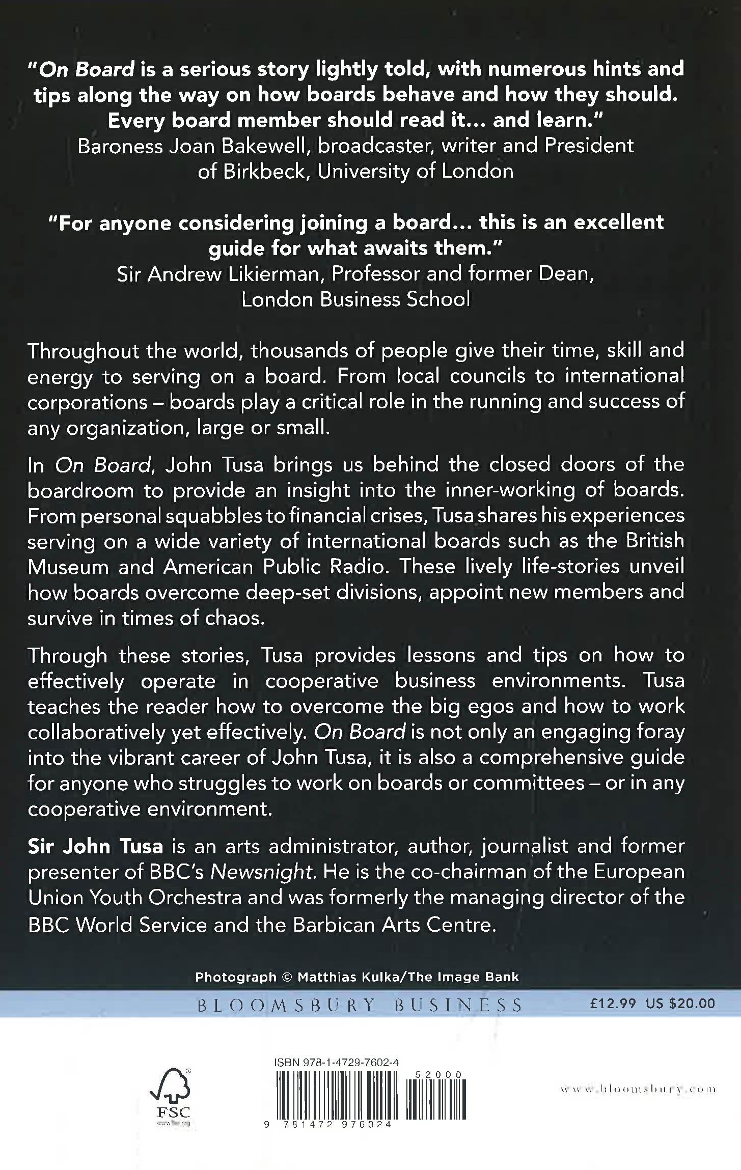 “In equal parts a fascinating glimpse behind the scenes of some of our best-loved institutions and a guide on how governing boards should work” - HRDirector Throughout the world, thousands of people give their time, skill and energy to serving on a board. From local councils to international corporations – boards play a critical role in the running and success of any organisation, large and small. In On Board John Tusa brings us behind the closed doors of the boardroom to provide an insight into the inner-working of boards. From personal squabbles to financial crises, Tusa shares his experiences serving on a wide variety of international boards such as the British Museum and American Public Radio. These lively life-stories unveil how boards overcome deep-set divisions, appoint new members and survive in times of chaos. Through these stories, Tusa provides lessons and tips on how to effectively operate in cooperative business environments. Tusa teaches the reader how to overcome the big egos and how to work collaboratively yet effectively. On Board is not only an engaging foray into the vibrant career of John Tusa - it is also a comprehensive guide to anyone who struggles to work on boards or committees - or in any cooperative environment.