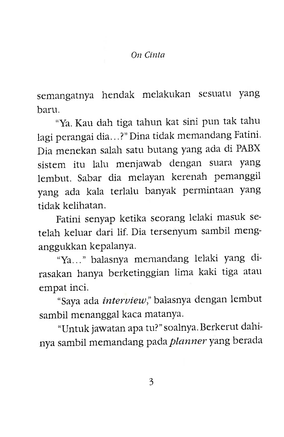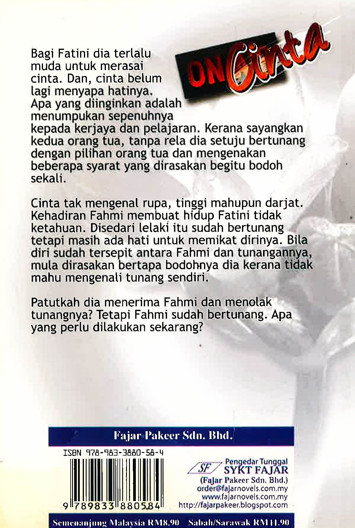 Bagi Fatini dia terlalu muda untuk merasaí cinta. Dan, cinta belum lagi menyapa hatinya. Apa yang diinginkan adalah menumpukan sepenuhnya kepada kerjaya dan pelajaran. Kerana sayangkan kedua orang tua, tanpa rela dia setuju bertunang dengan pilihan orang tua dan mengenakan beberapa syarat yang dirasakan begitu bodoh sekali. Cinta tak mengenal rupa, tinggi mahupun darjat. Kehadiran Fahmi membuat hidup Fatini tidak ketahuan. Disedari lelaki itu sudah bertunang tetapi masih ada hati untuk memikat dirinya. Bila diri sudah tersepit antara Fahmi dan tunangannya, mula dirasakan bertapa bodohnya dia kerana tidak mahu mengenali tunang sendiri. Patutkah dia menerima Fahmi dan menolak tunangnya? Tetapi Fahmi sudah bertunang. Apa yang perlu dilakukan sekarang?
