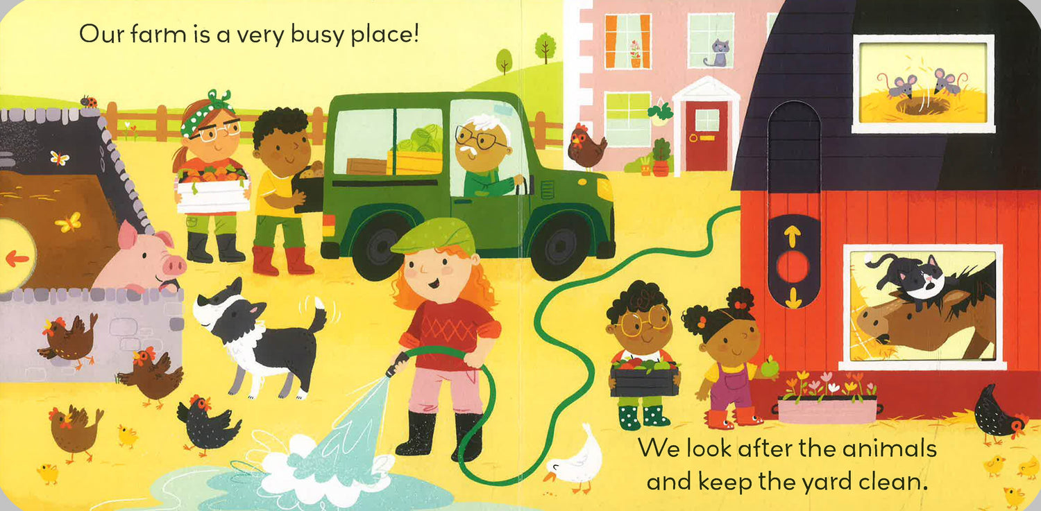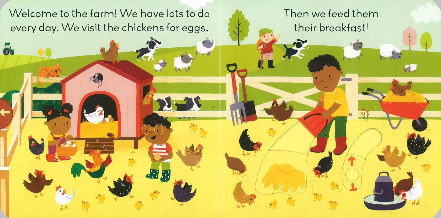 Curious minds will love to explore the farmyard in this interactive title from Allison Black's Little World series. Complete with gentle narrative text and tabs to slide, push, or pull on every spread, young readers will be able to plow the fields, herd sheep, and feed the chickens in this bright and colorful board book.