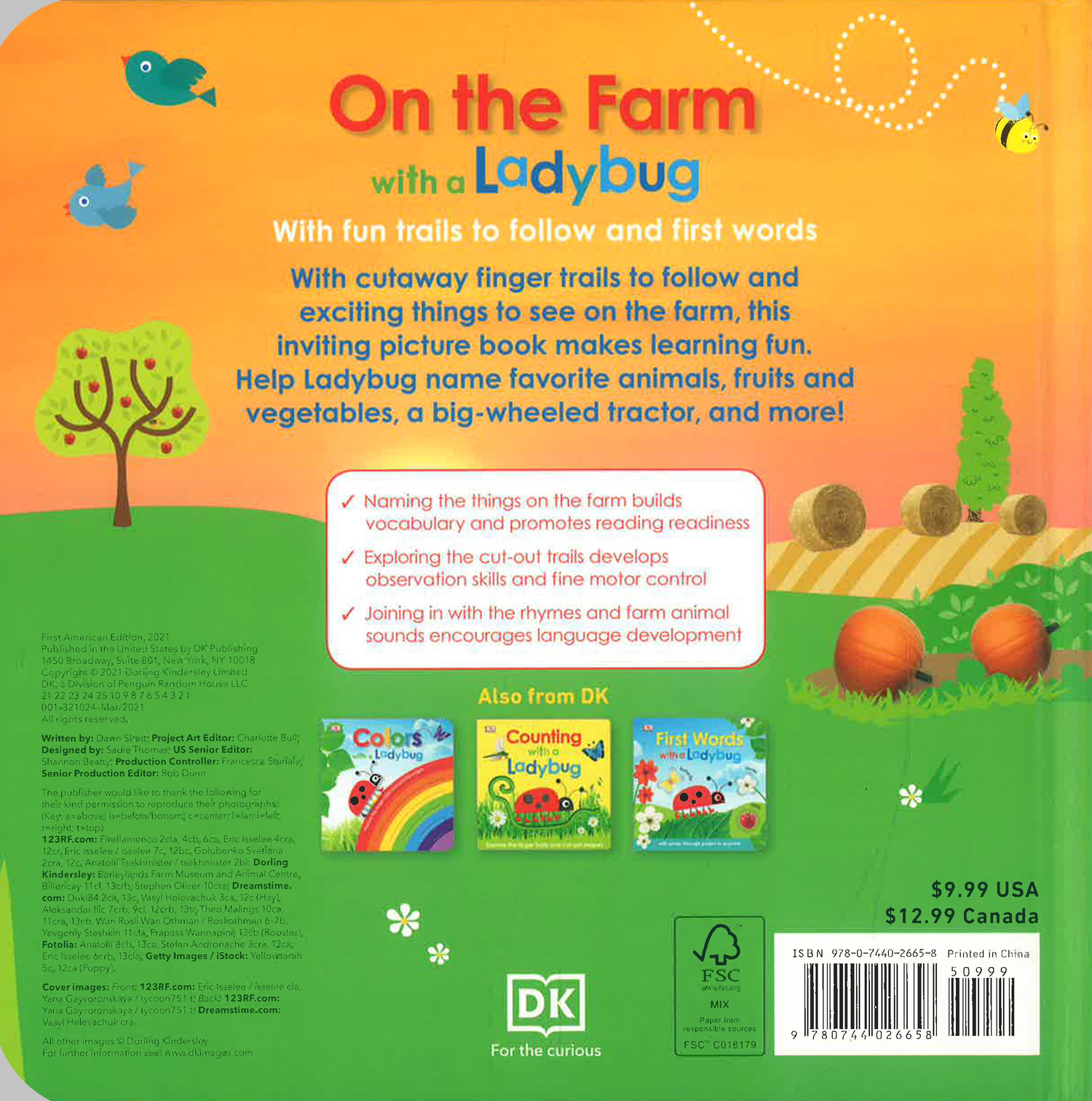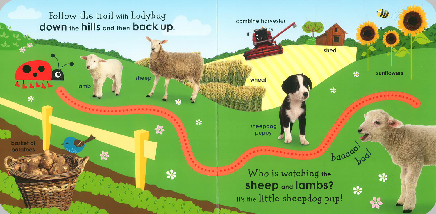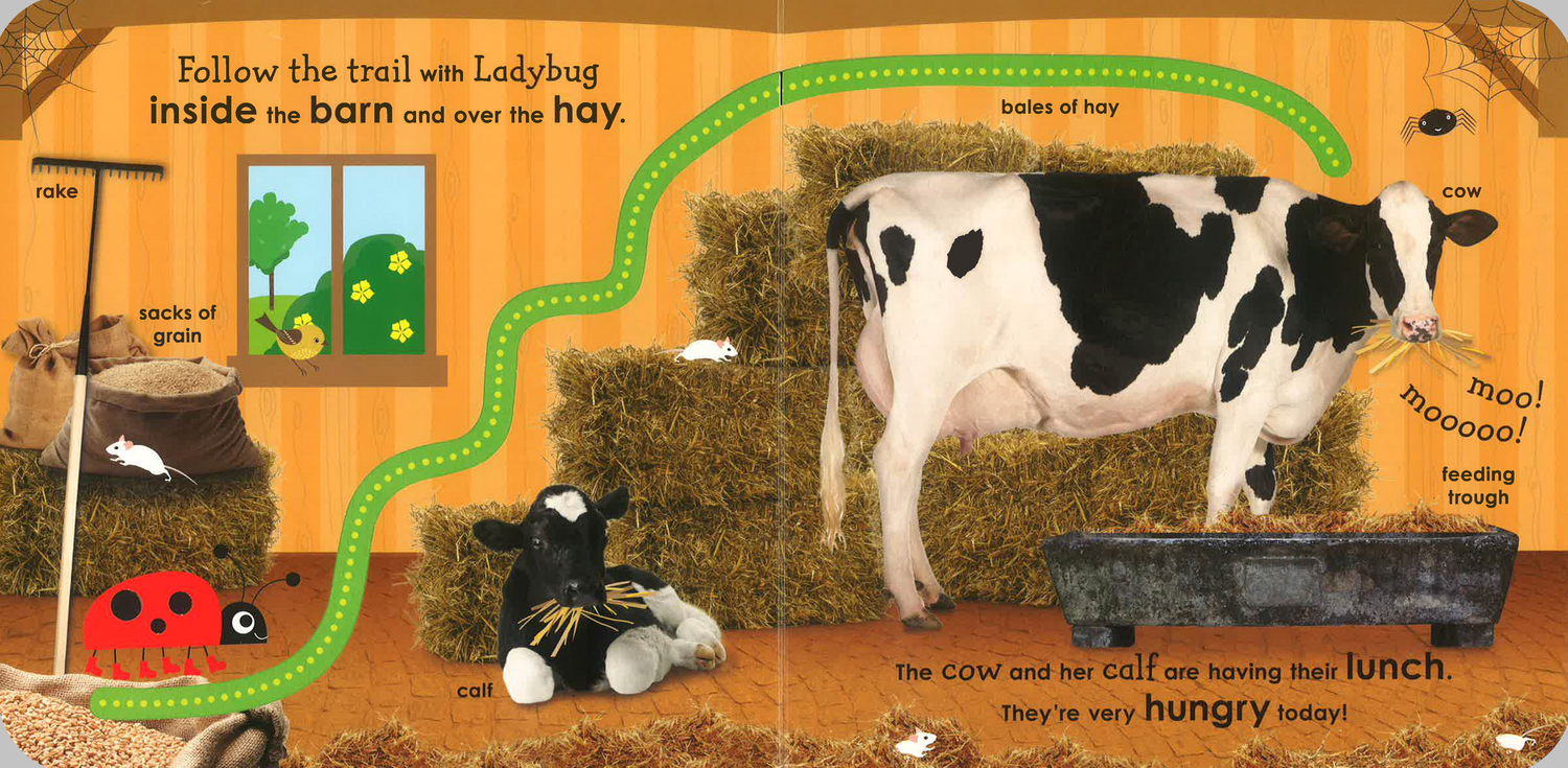 Let your little learner go on a fun-filled farm adventure with an adorable ladybug!Along the way, your baby will meet cute farm animals, learn first words and discover cutaway finger trails to follow on every page. Let the exploring begin!This baby board book makes early learning fun! It’s packed with educational activities and features such as: • Naming the things on the farm builds vocabulary and promotes reading readiness • Exploring the cut-out trials develops observations and fine motor skills • Joining in with the rhymes and farm animal sounds encourage language development Babies and toddlers will love learning all about farm life through delightful photos, charming, read-aloud rhymes, and fun animal sounds. What’s that loud cock-a-doodle-doo? It’s the cockerel’s noisy song! Oink, oink, oink, that must be the piggies in the muck!Help your child learn to read and boost their learningFrom geese by the pond and sheep on the hills to cows in the barn and rabbits in the field, can you help Ladybug name her favorite animals? This baby first words book includes 40 farm words to help develop language skills. The cut-out finger trails inside stimulate learning through play, boosts curiosity, and improves dexterity. It’s the ultimate follow-the-trail book for curious children aged 6 months to 3 years and parents who want a fun and educational gift for toddlers or preschoolers.Let your little one’s imagination soar! This charming first baby book is part of an award-winning preschool series from DK that helps toddlers learn before starting school. Discover more in the seriesFollow a ladybug on a magical adventure where she learns colors with her animal friends in Colors with a Ladybug. Go on a first words adventure with a friendly ladybug in First Words with a Ladybug.