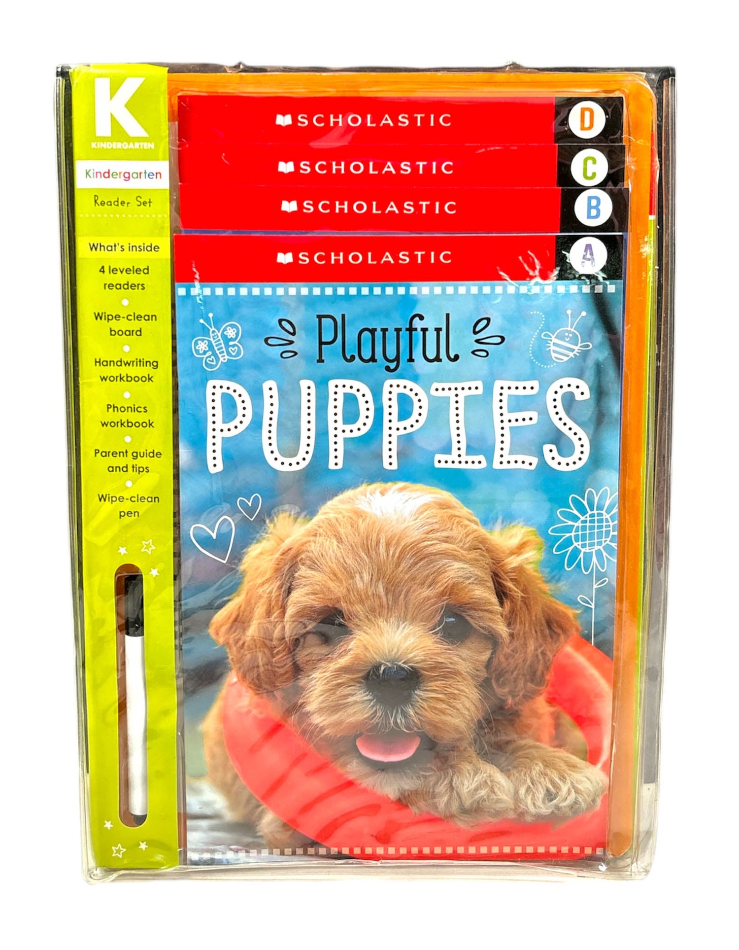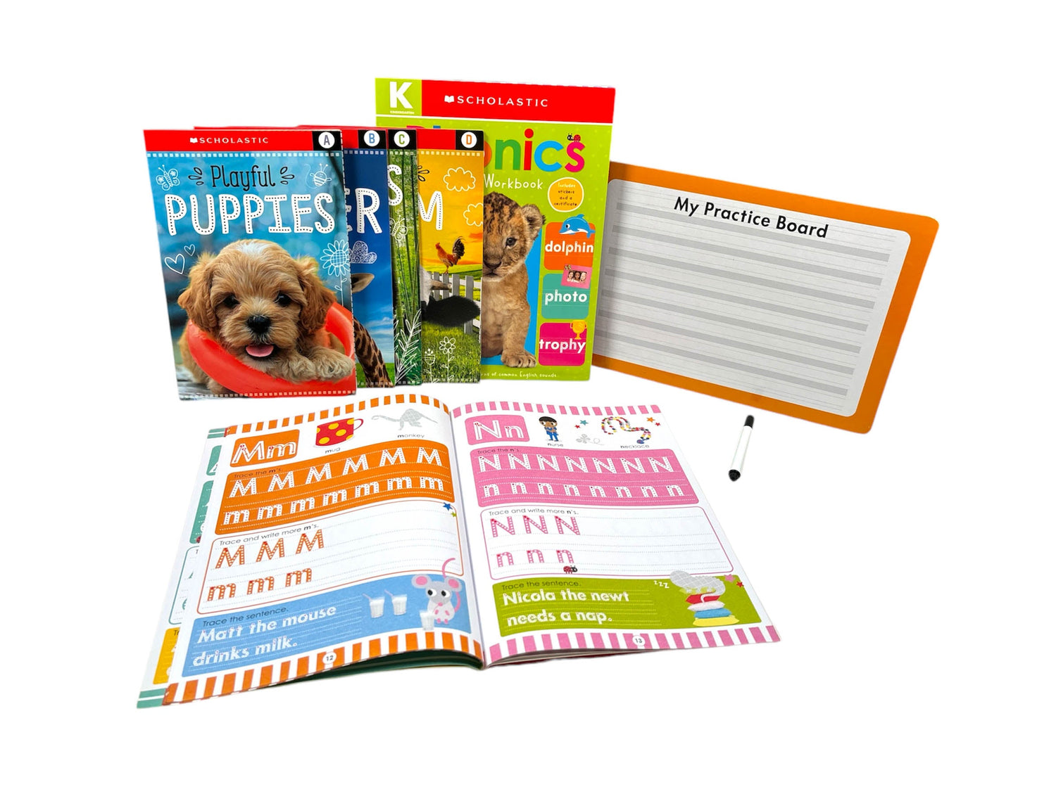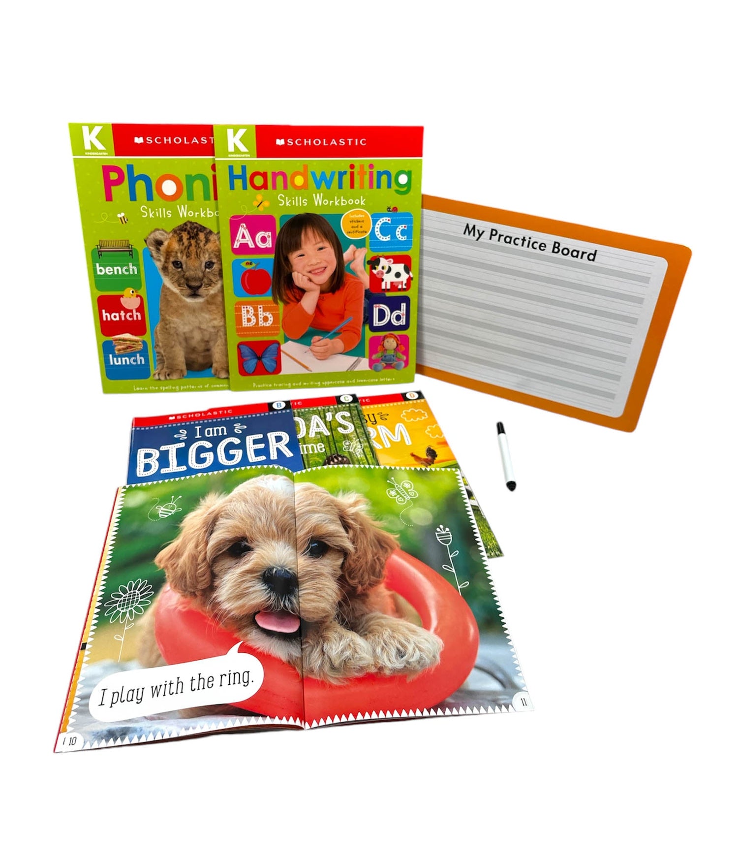 Jumpstart your child's Kindergarten success with this fun collection created especially for children learning to read and write. Each of the four readers features simple, engaging text and charming animal photography to build reading confidence and achievement. The Handwriting Workbook and Wipe-Clean Board offer letter tracing and sentence practice to reinforce independent, on-level reading and writing skills. All in an easy-to-carry vinyl bag.