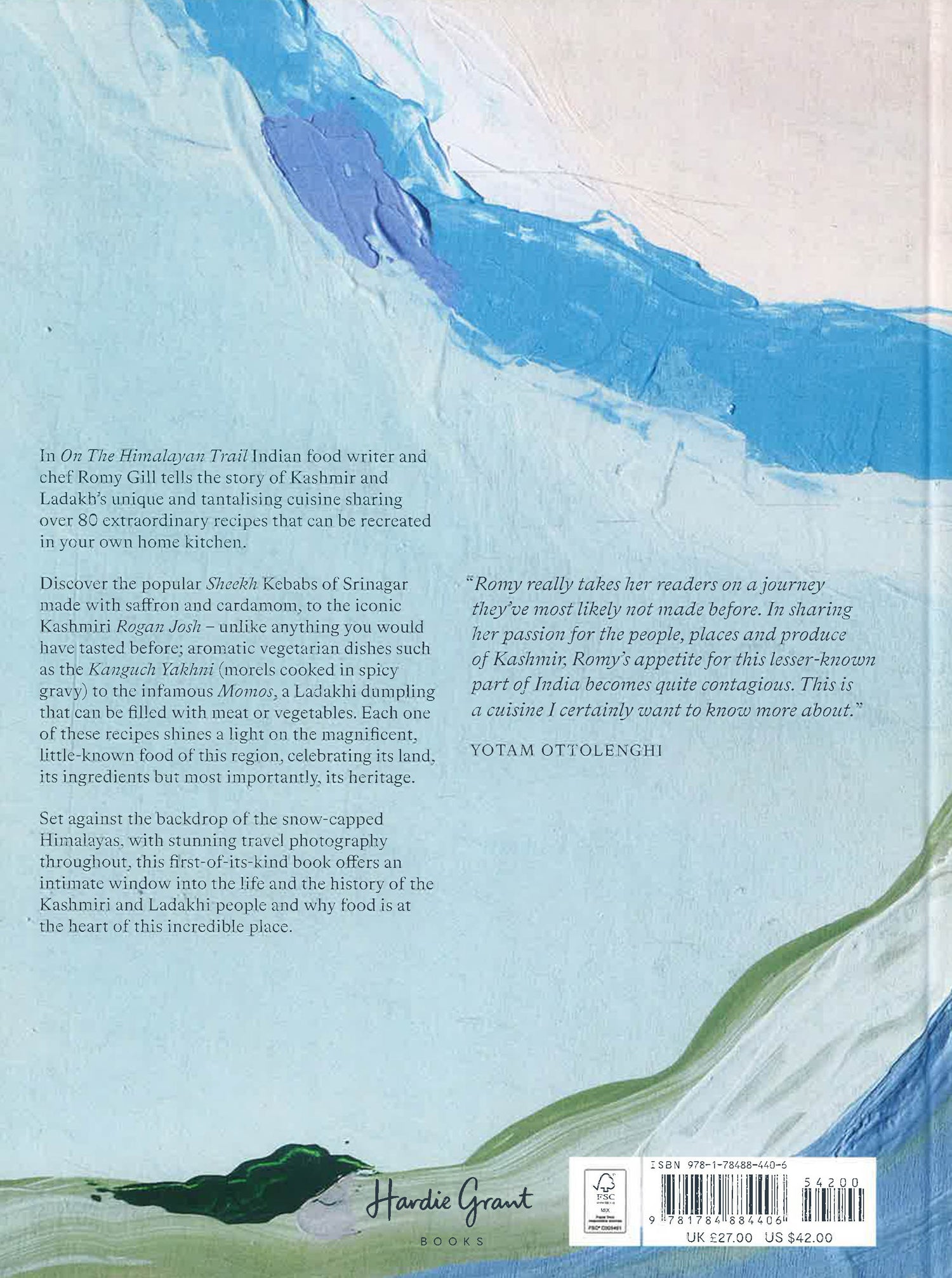 "The heart and soul of beautiful Kashmir is in every single recipe. Simply stunning." – Gordon Ramsay In On The Himalayan Trail Indian food writer and chef, Romy Gill, tells the story of Kashmir and Ladakh's unique and tantalizing cuisine sharing over 80 extraordinary recipes that can be recreated in your own home kitchen. With everything from Shammi Kebabs (minced lamb patties) to Wagen Pakora (deep fried aubergine in gram flour) for Nashta (starters) succulent meat curries like the Kashmiri Rogan Josh or Gustaba (lamb meatballs cooked in a yoghurt gravy); to aromatic vegetable dishes such as the Kanguch yakhni (morels cooked in spicy gravy): these recipes shines a light on the magnificent, little-known cuisine of Kashmir and Leh, celebrating its land, its ingredients and its heritage. Kashmiri cuisine is one of the most delectable cuisines in India. Heavily influenced by Mughal, Persian, Afghan and Central Asian styles of cooking, it offers up a diverse range of dishes, displaying and reveling in a fusion of flavors and influences. Increasingly difficult to access due to the political uncertainty in the region, it's more important than ever to share and preserve Kashmir's secrets and traditional methods of cooking.