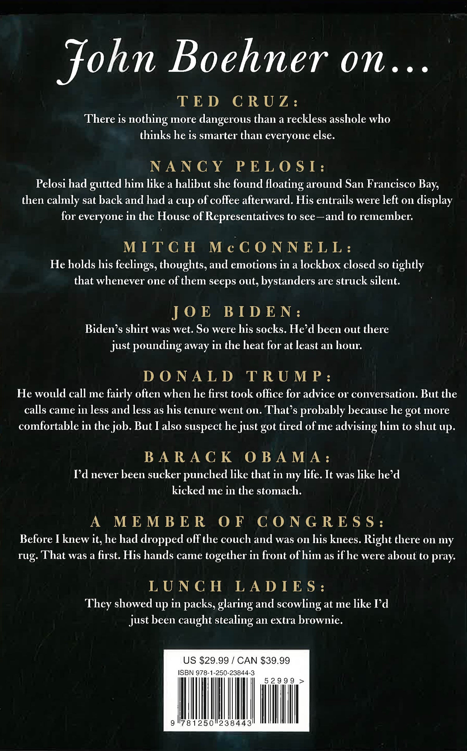 “A rollicking, foil-mouthed” [memoir]....Boehner has delivered a classic Washington “tell-all,” albeit one with his typical jocular style.” --The Washington Post